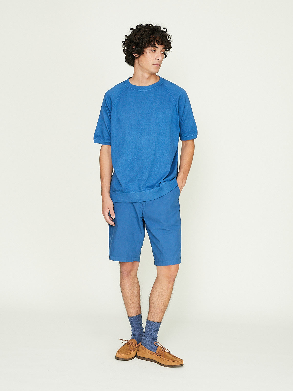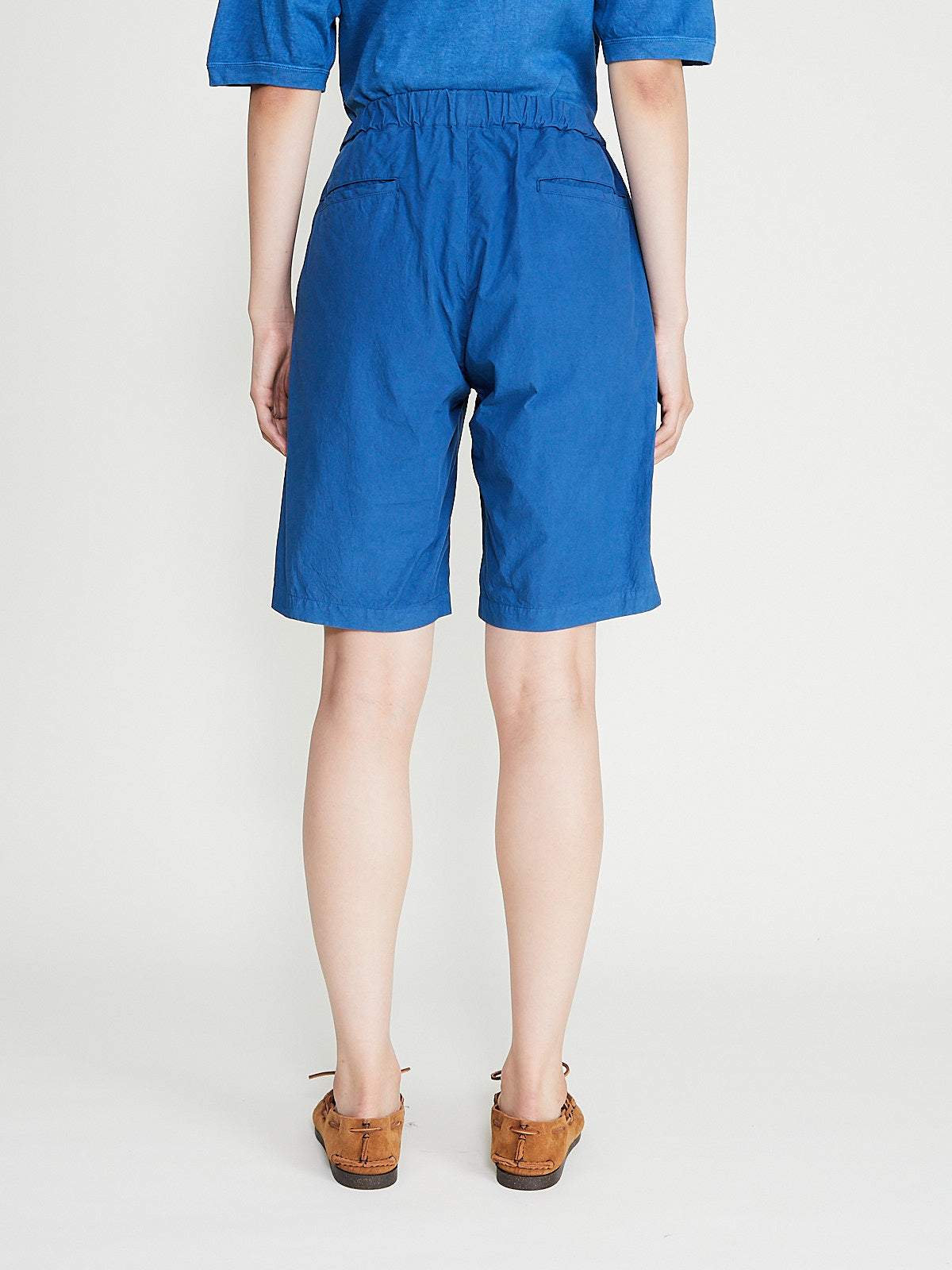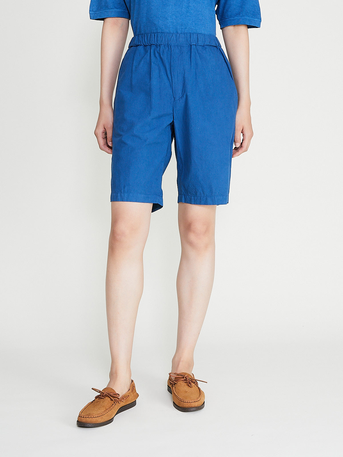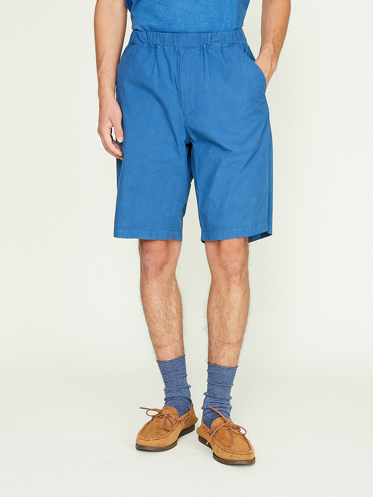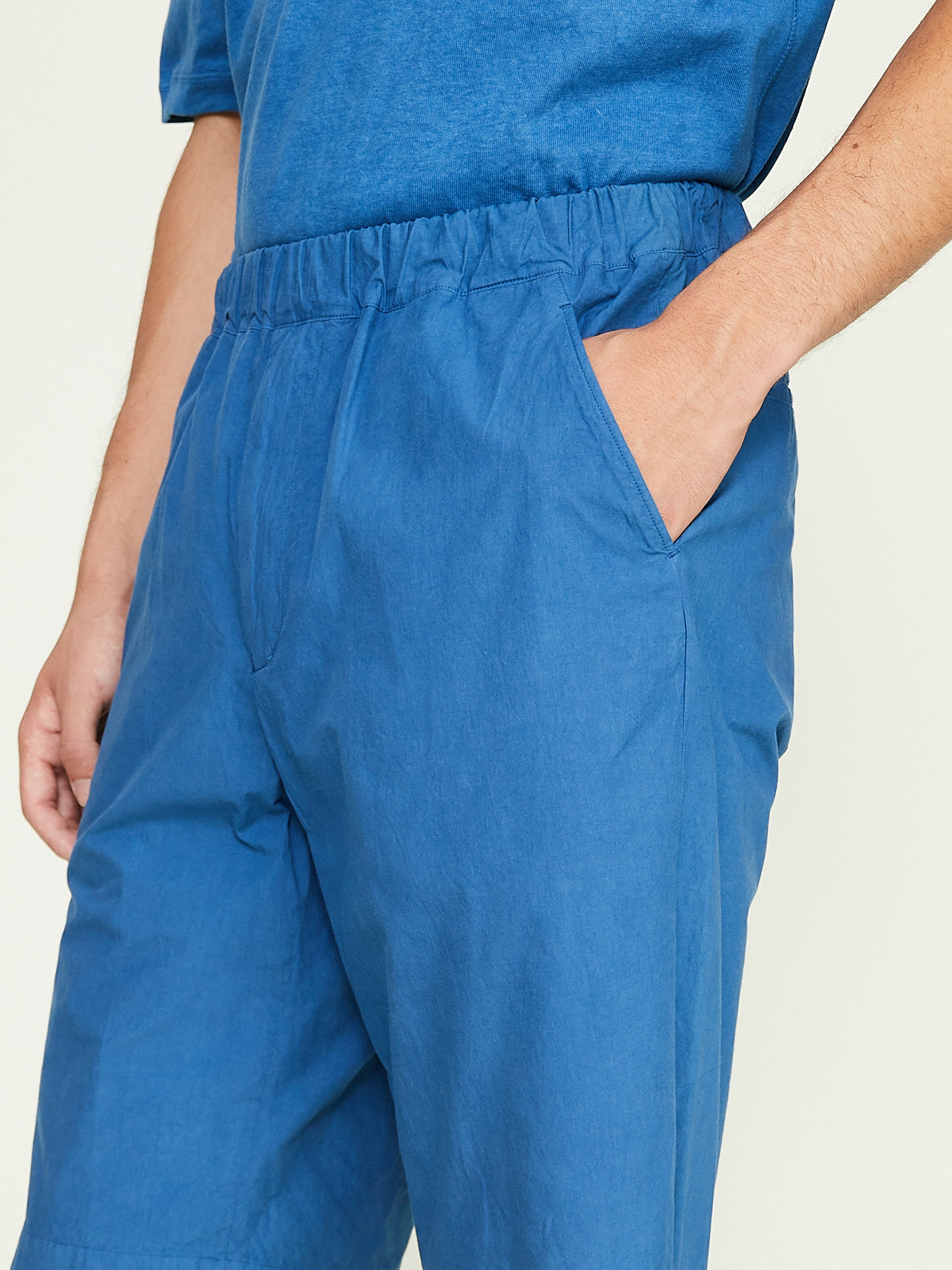 Unisex straight short in bright blue cotton. Mid-waist, pull-on style with an elasticated waistband. Slash pocket on the front and a welted pockets on the back.