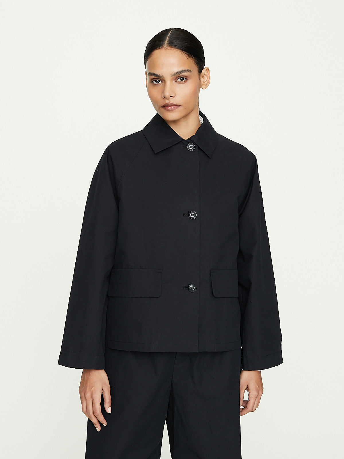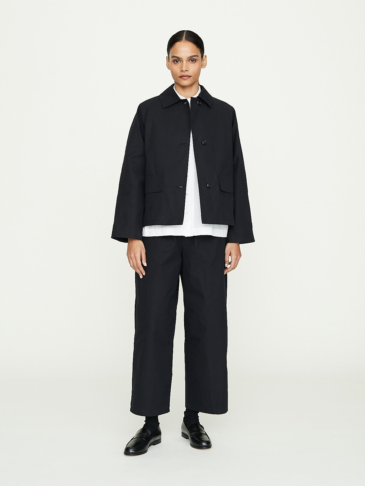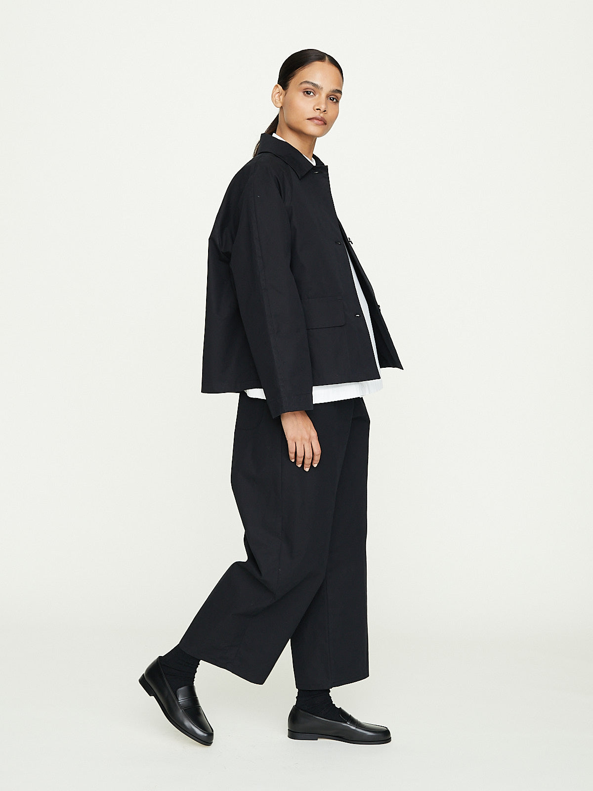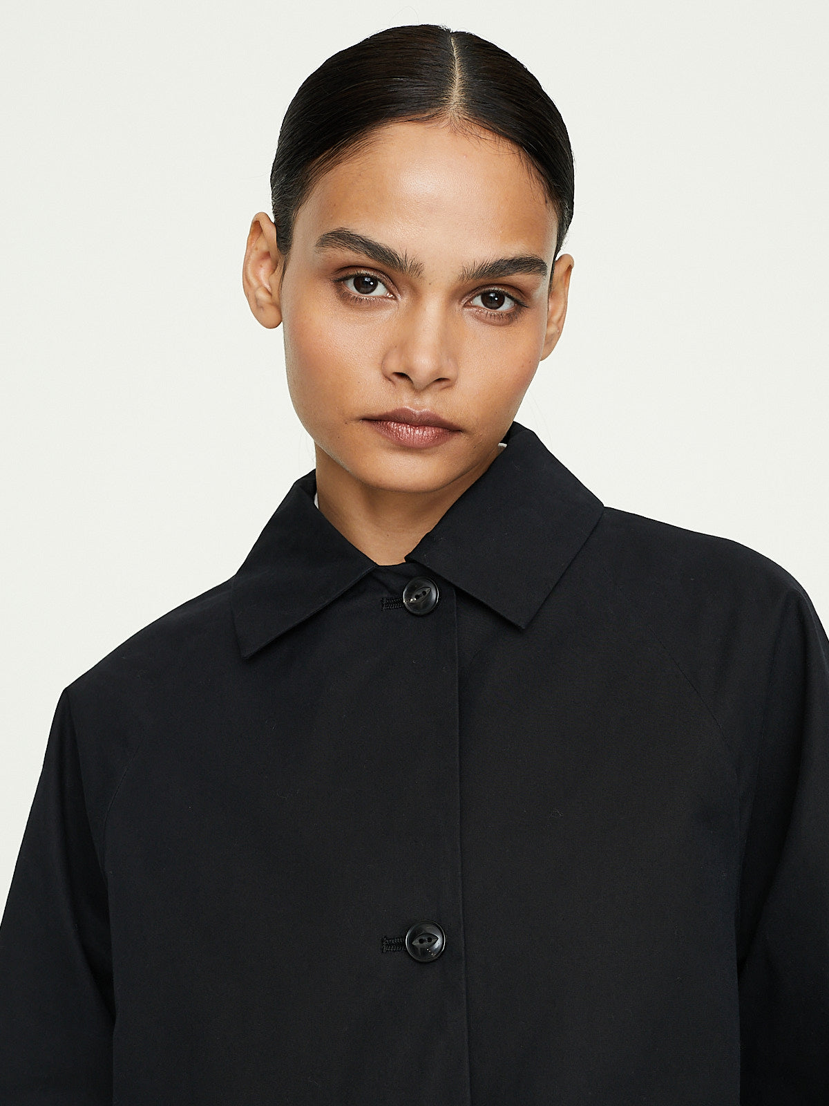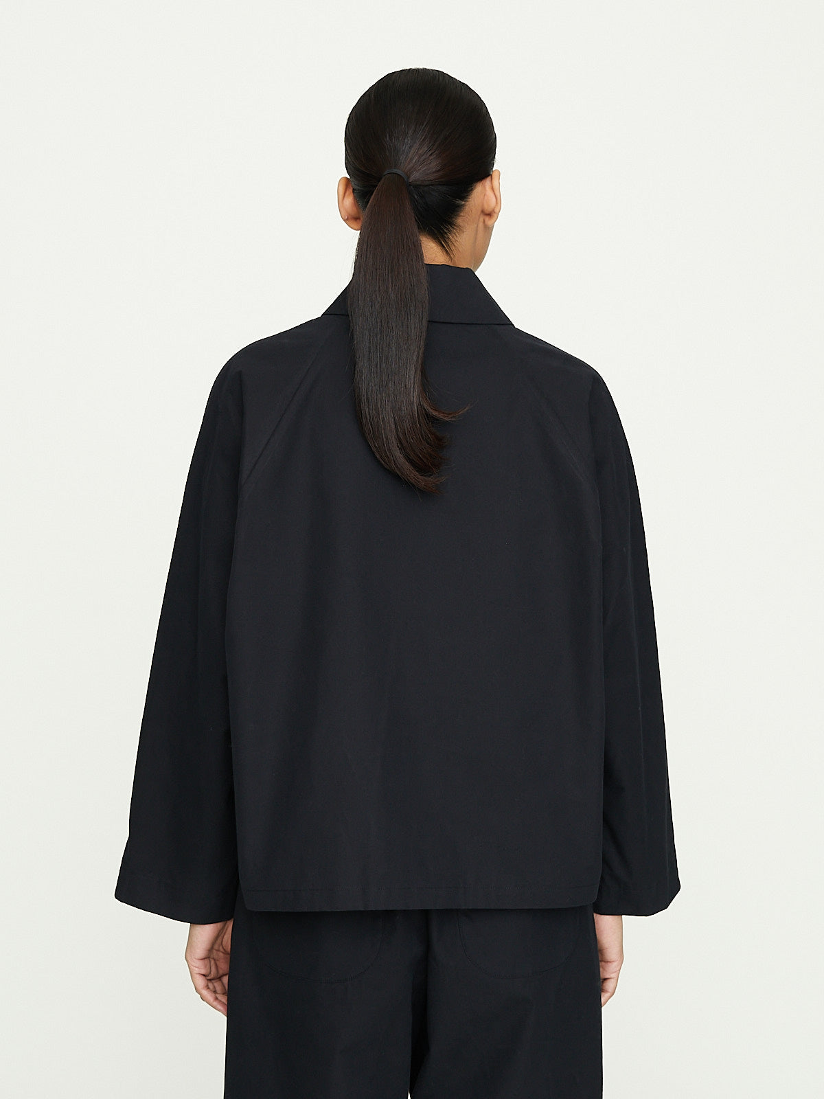 Boxy jacket in a black cotton. Bal collar, front button fastening and wide raglan bracelet sleeves. Flap pockets on the front. Oversized fit.