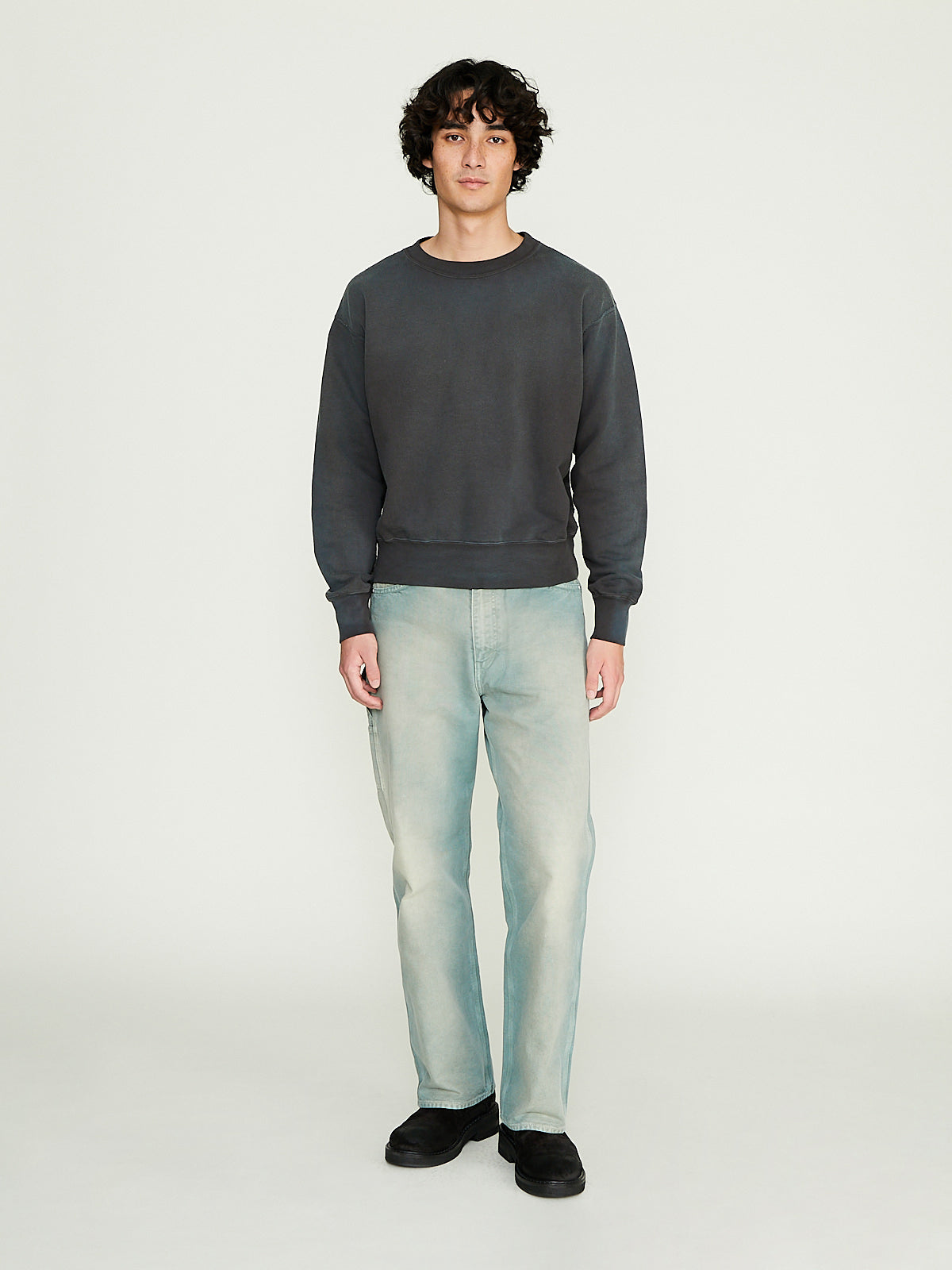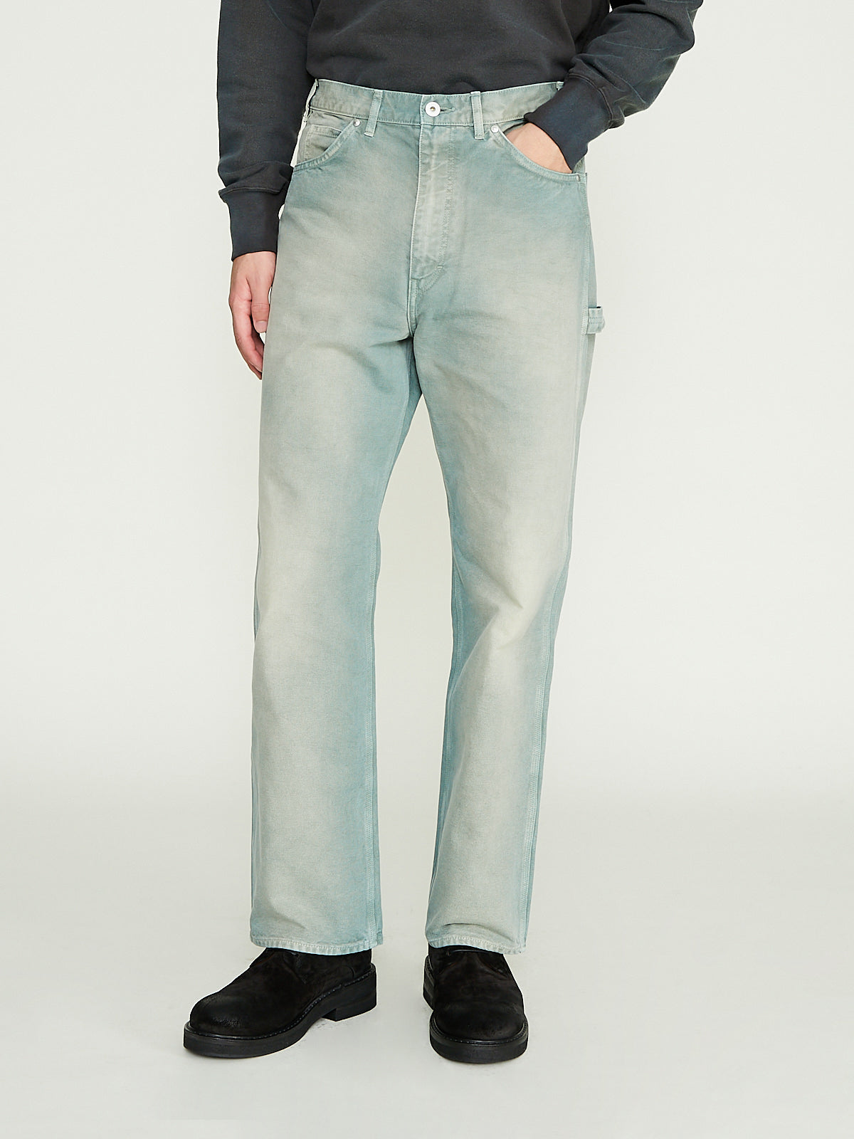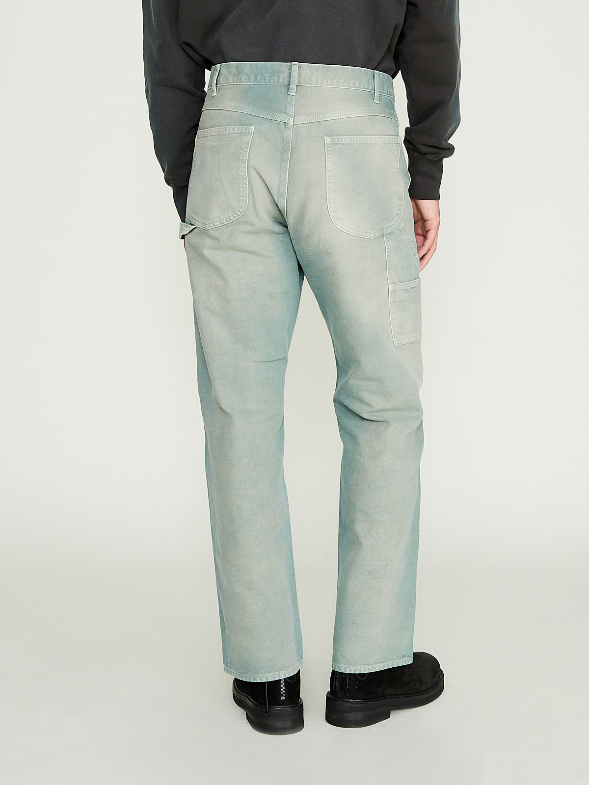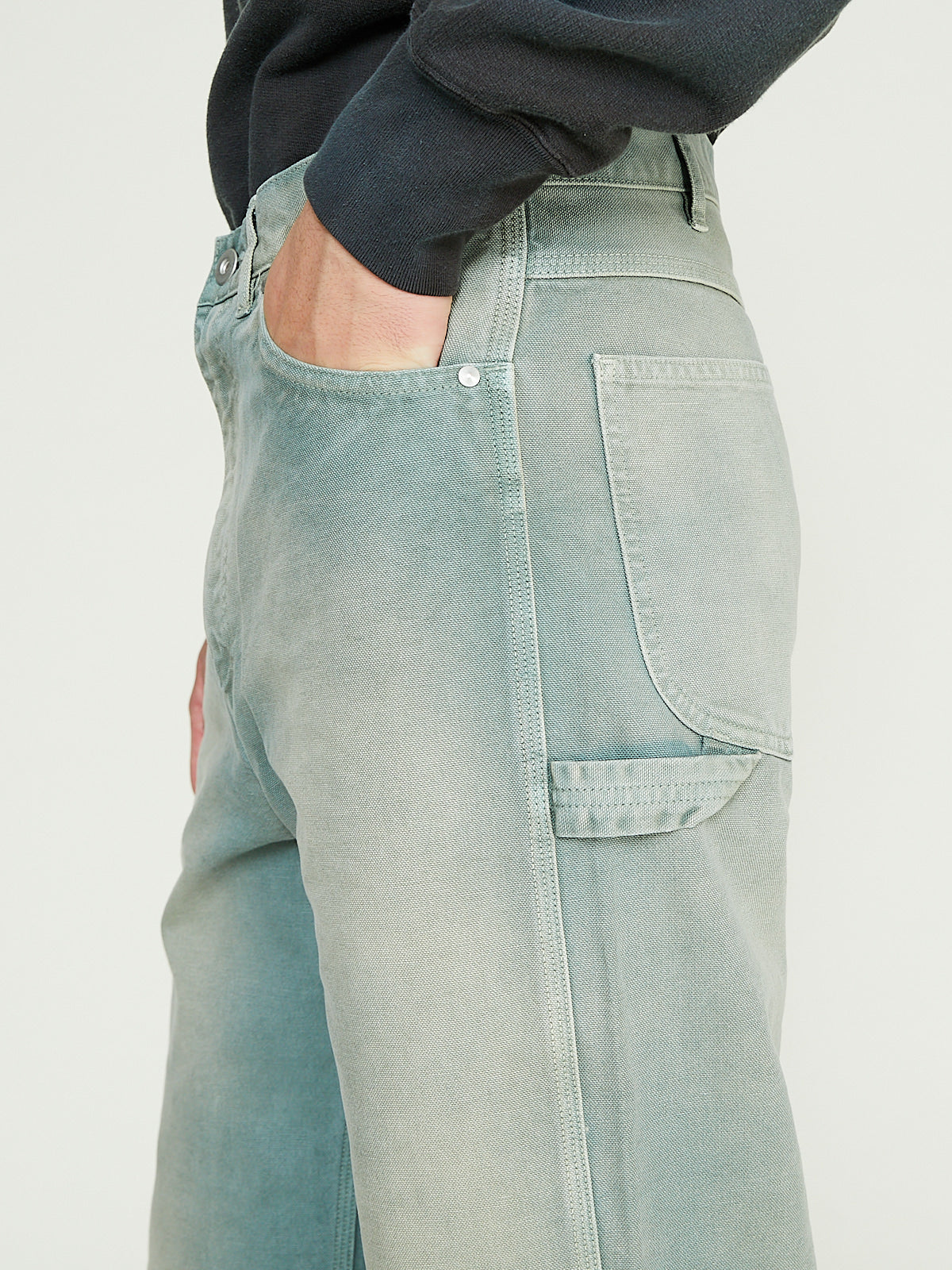 Workwear-inspired wide pants in garment-dyed ash green organic cotton duck fabric that is tightly woven using thick organic cotton for both warp and weft. High waist, zip fly and scoop pockets on the front. Features a coin pocket and patch pockets on the back. Back yoke. Straight legs. Regular fit.