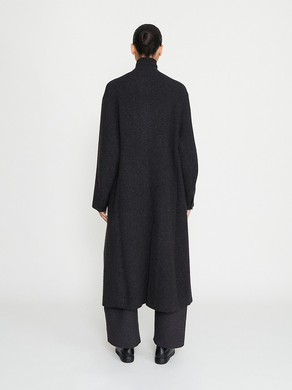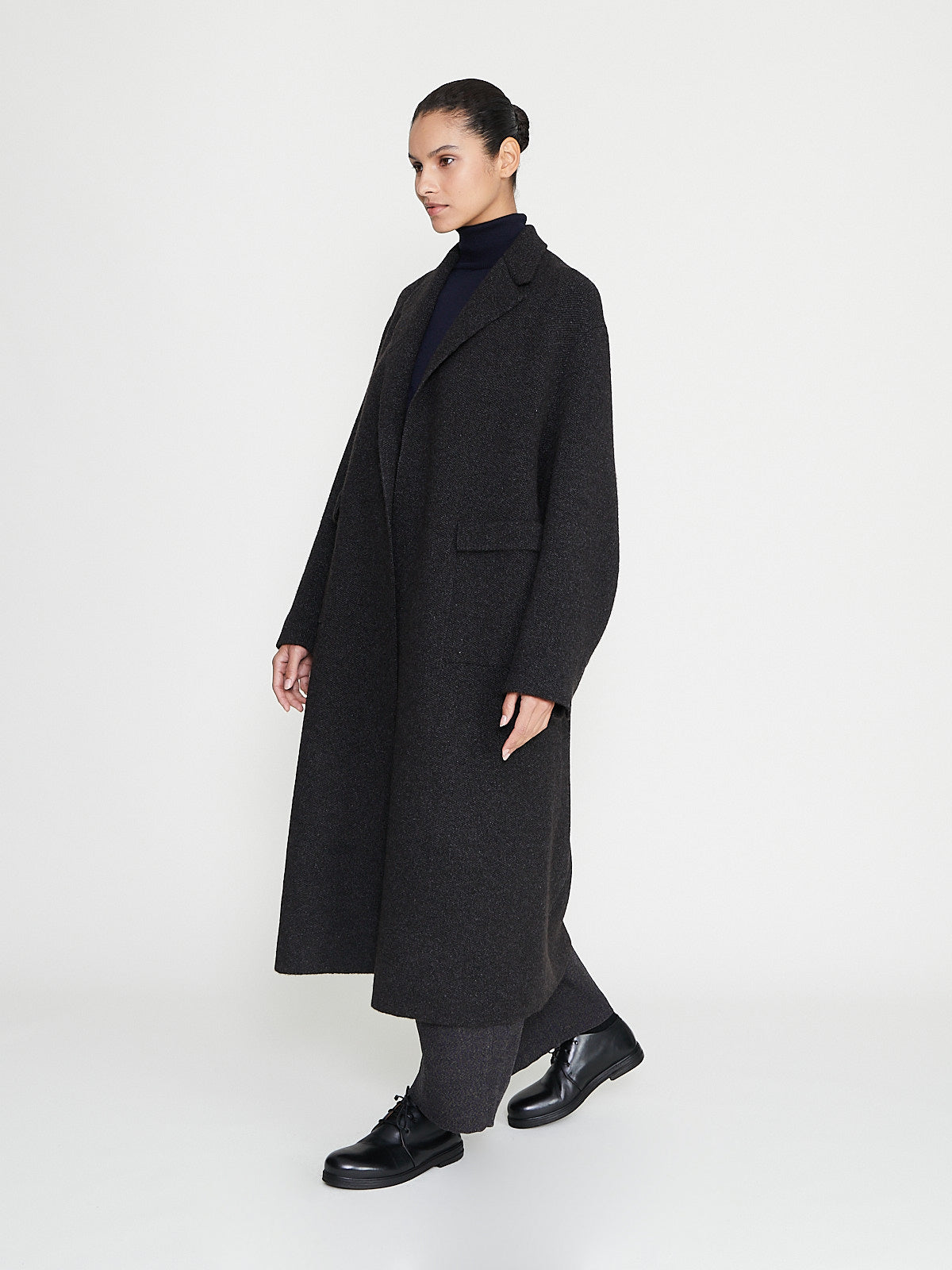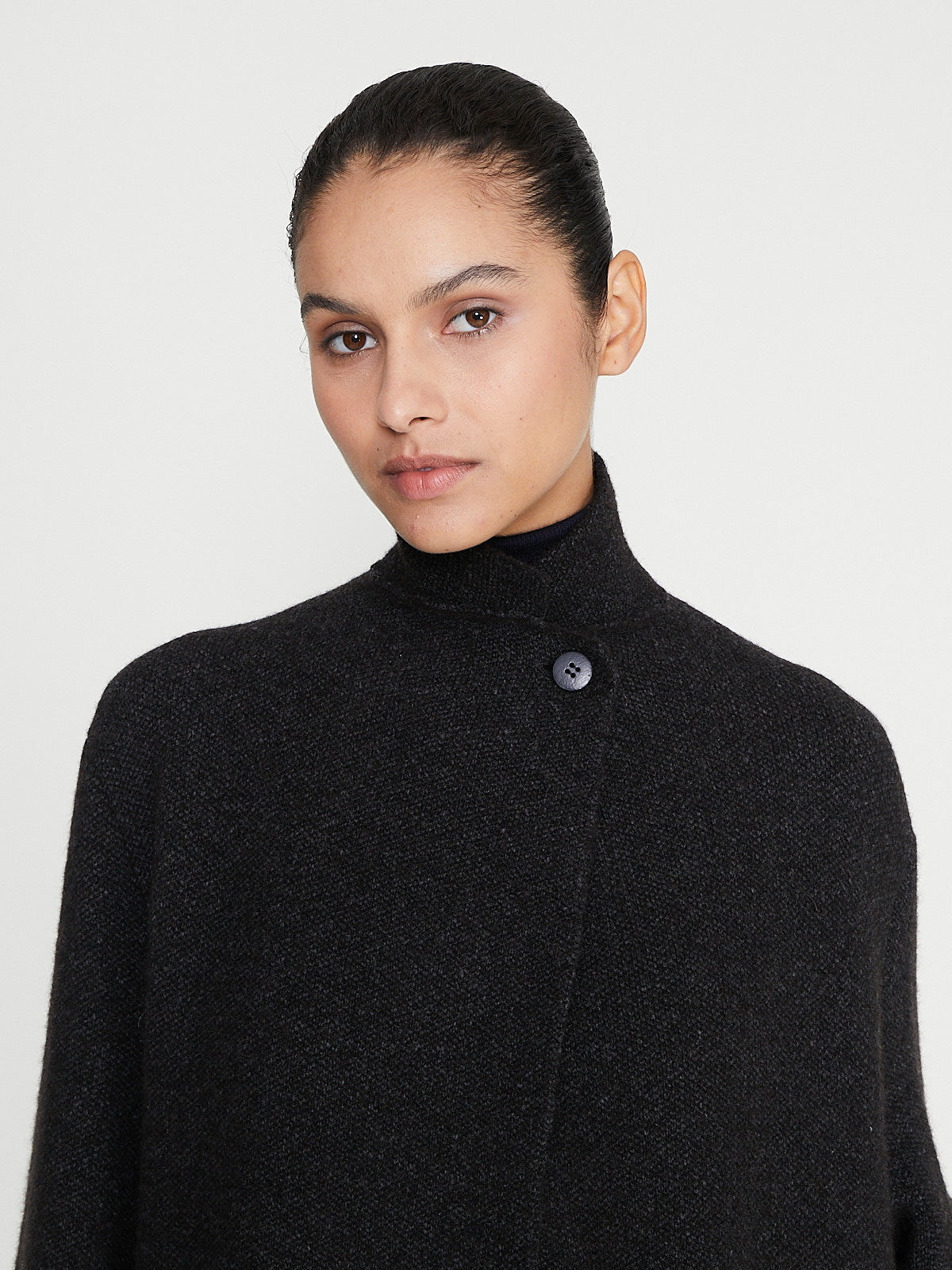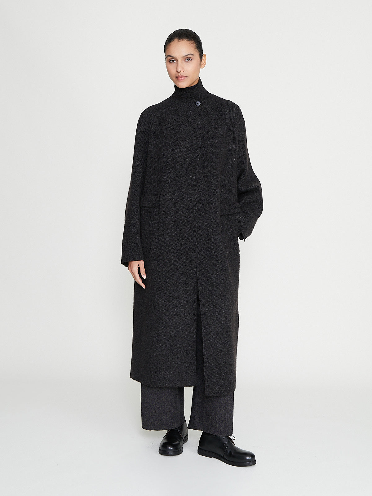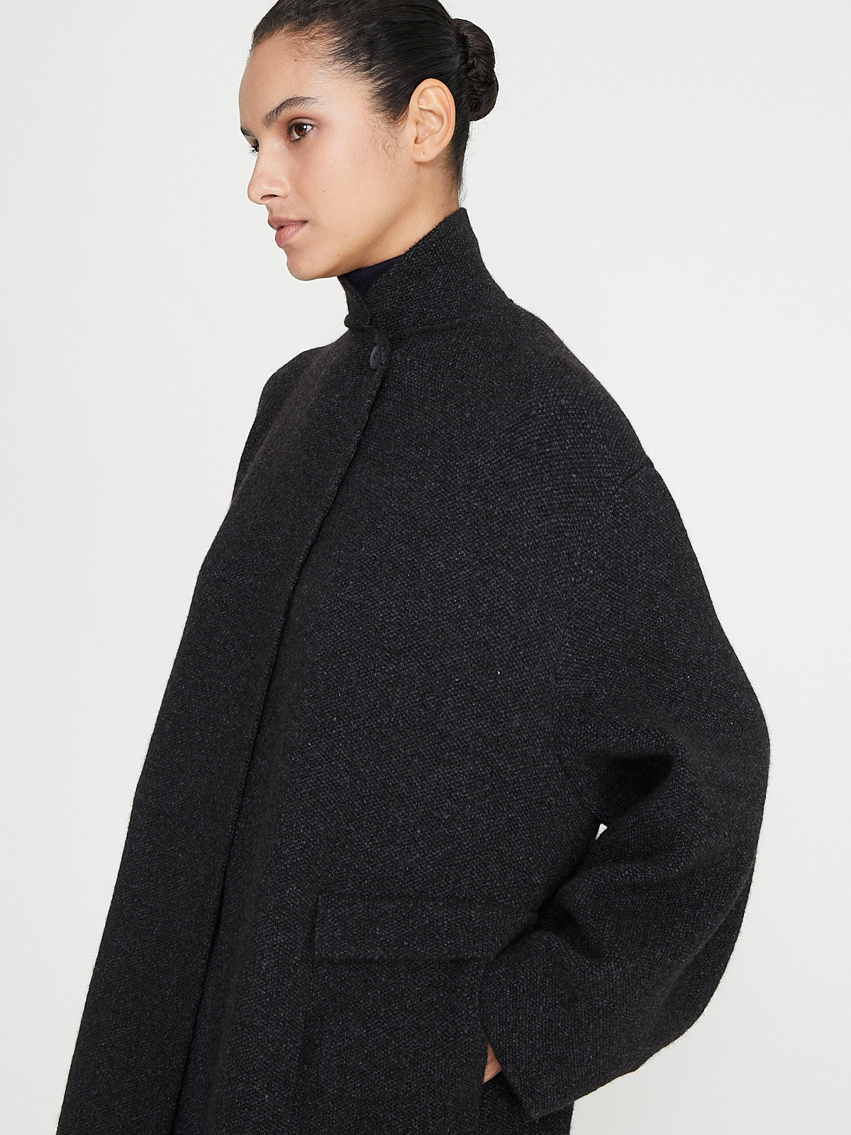 Oversized coat in a dark grey wool blend. Convertible collar with a single button fastening at the neck and long sleeves with a dropped shoulder. Patch pockets with a flap pockets on the front and a back vent.