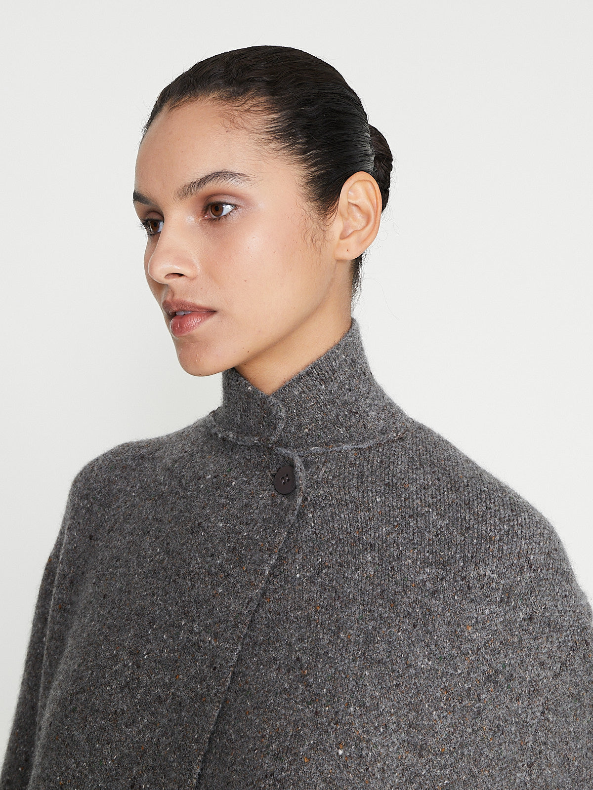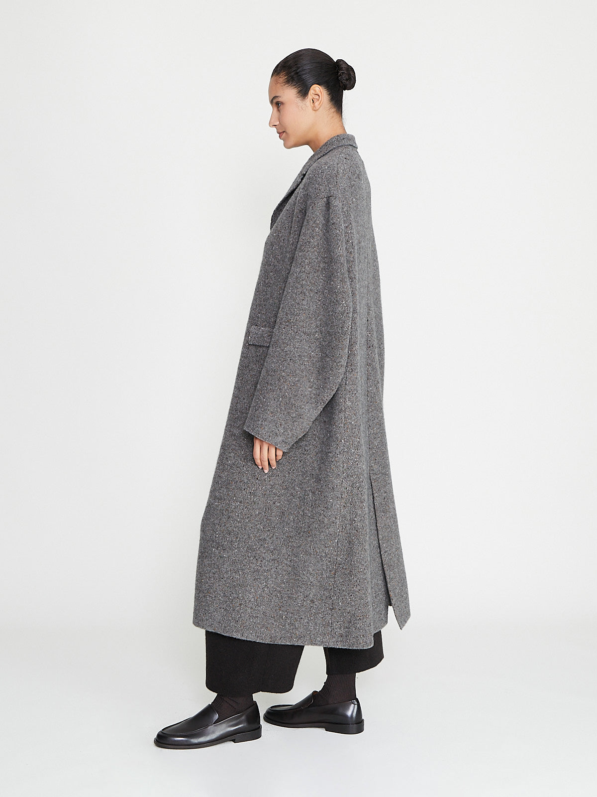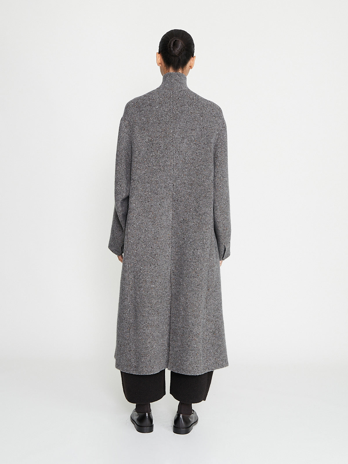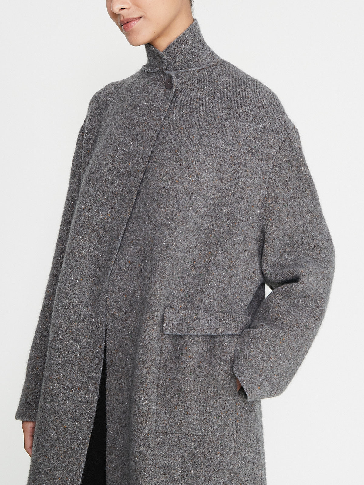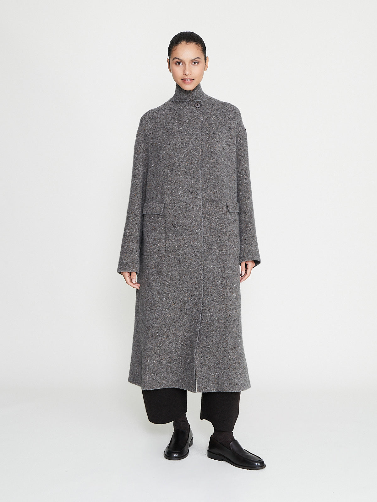 Oversized coat in a grey wool blend. Convertible collar with a single button fastening at the neck and long sleeves with a dropped shoulder. Patch pockets with a flap on the front and a back vent.