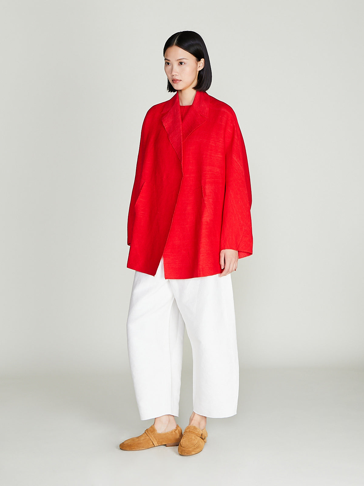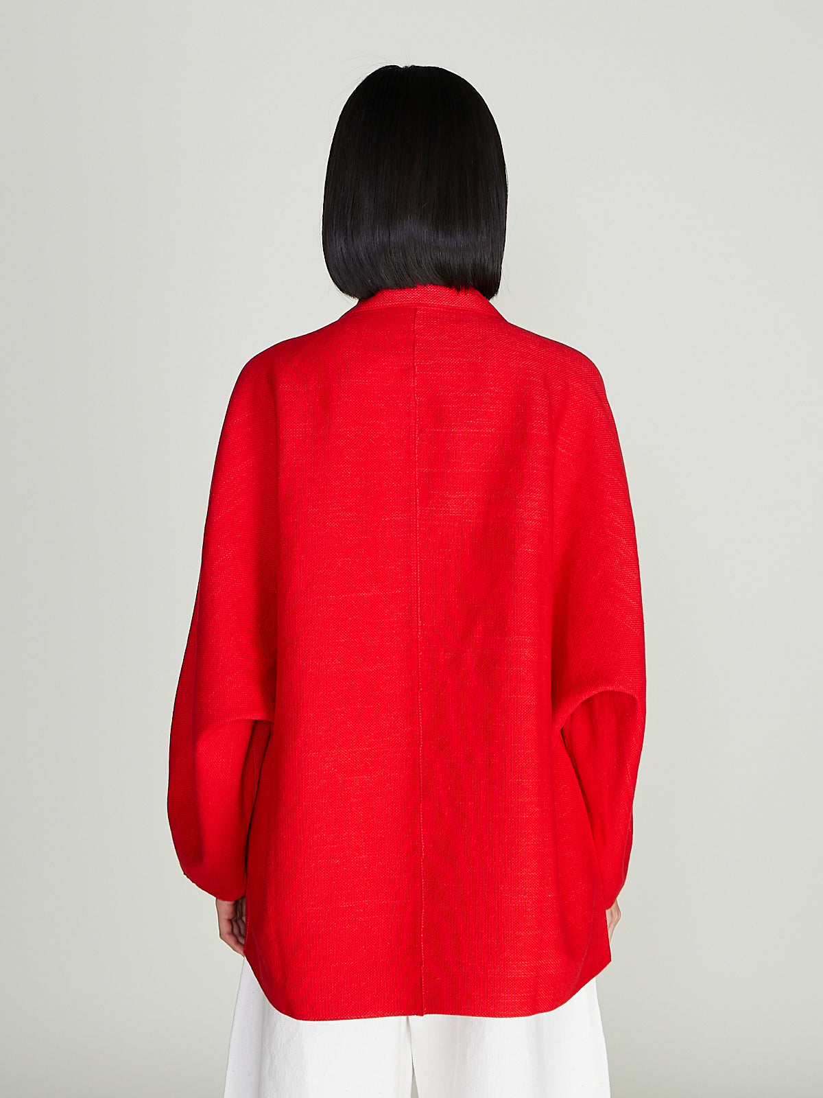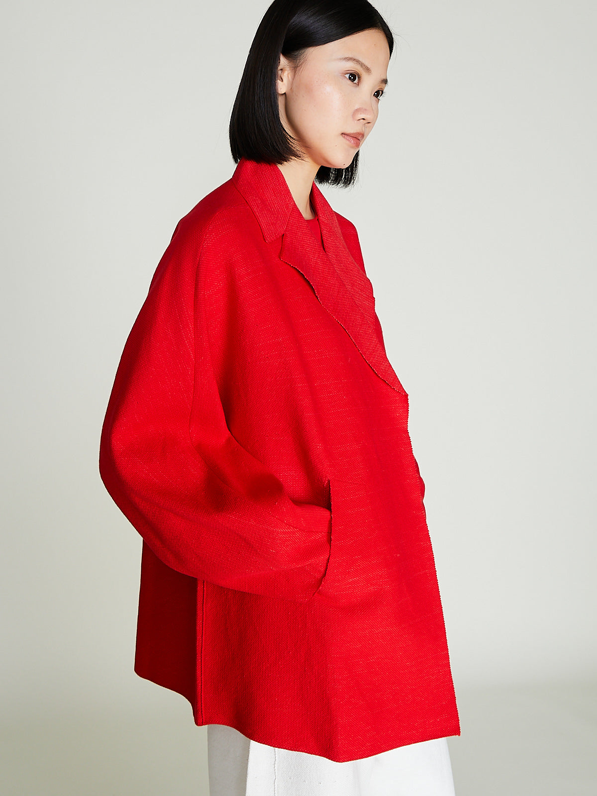 Oversized jacket in a red cotton/linen blend. Notched collar, double breasted and open front. Long dolman sleeves and slip pockets on the front.