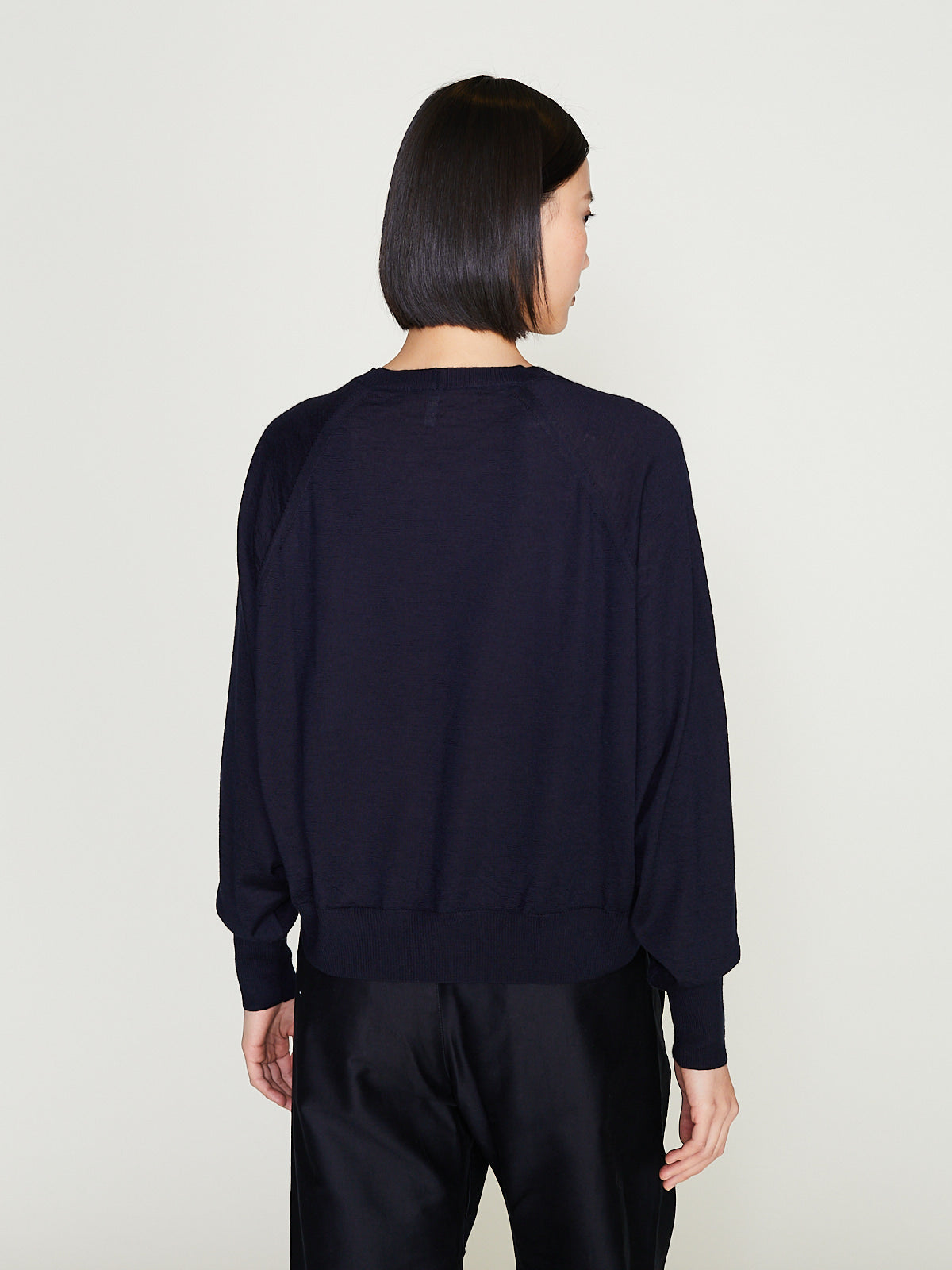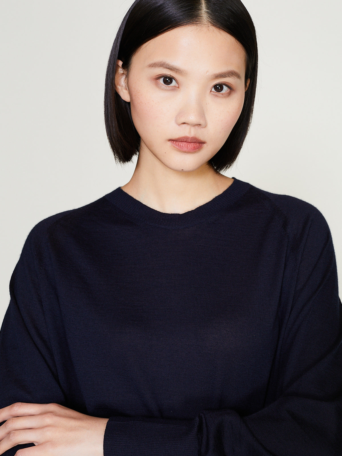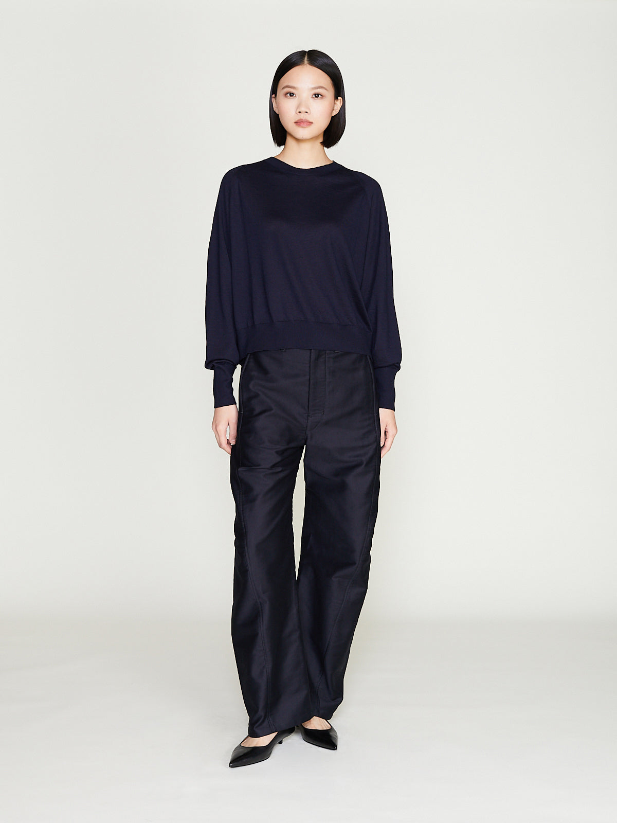 Oversized sweater in navy cashmere/silk. Round neckline and long raglan dolman sleeves. Features a rib detail around the neck, cuffs and bottom hem.