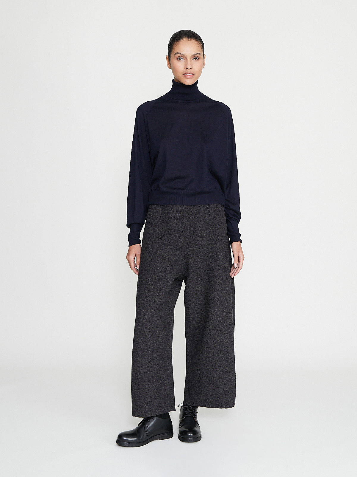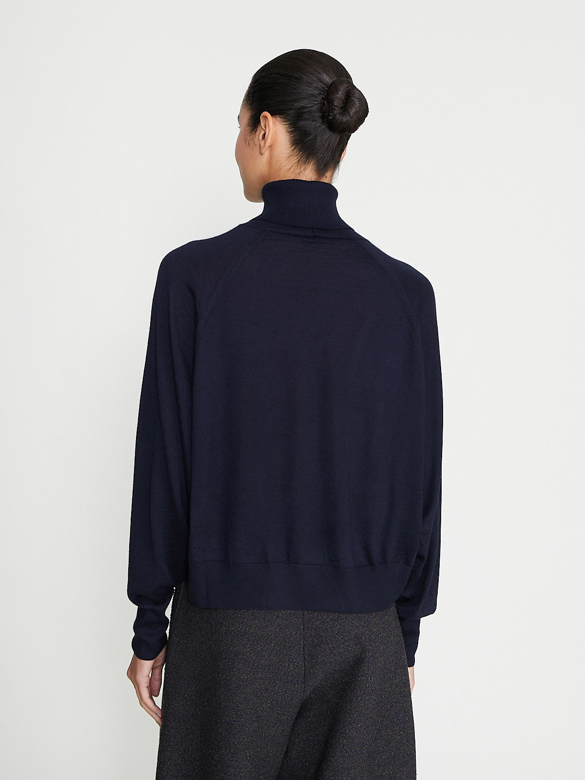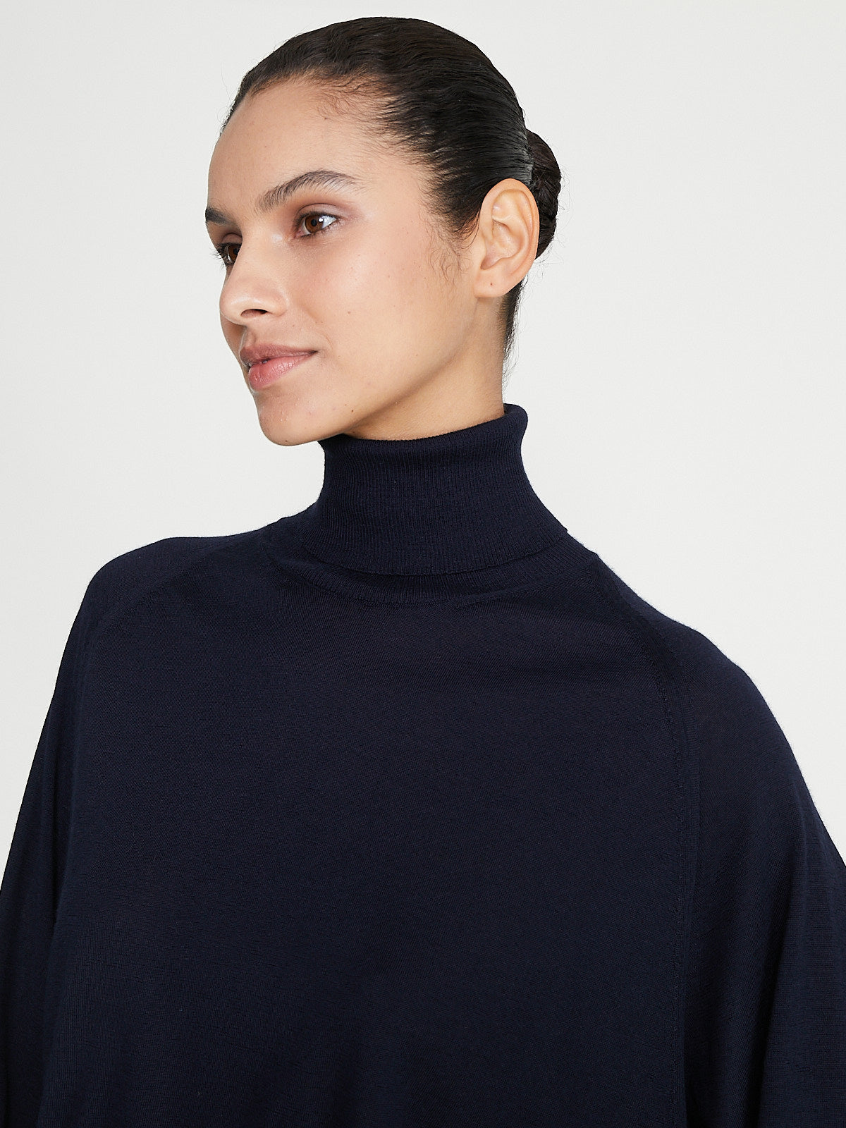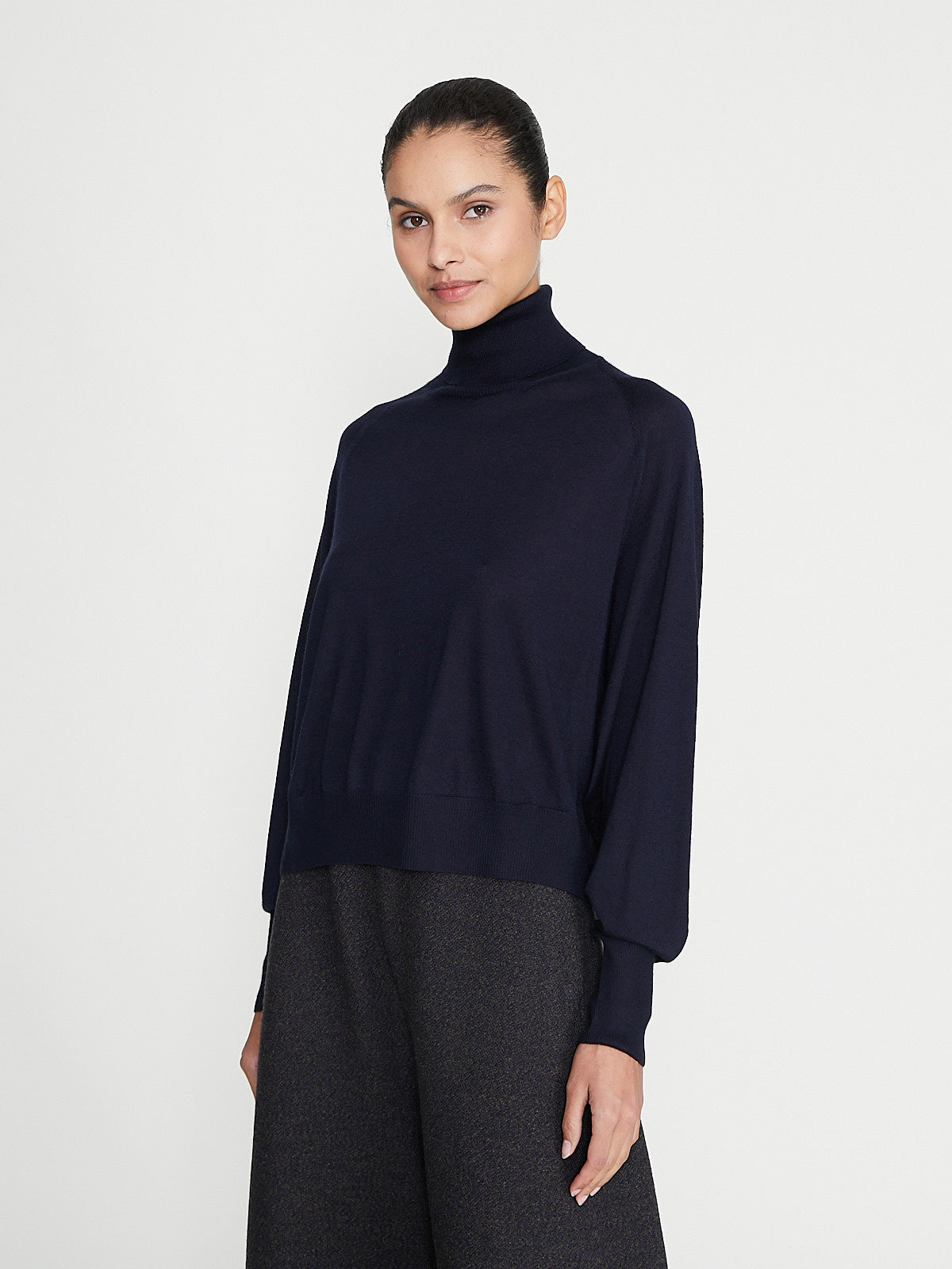 Turtleneck sweater in a navy cashmere/silk. Long raglan dolman sleeves. Features a rib detail at the neck, cuffs and bottom hem. Relaxed fit.