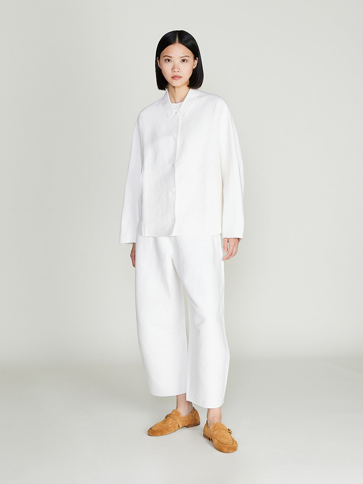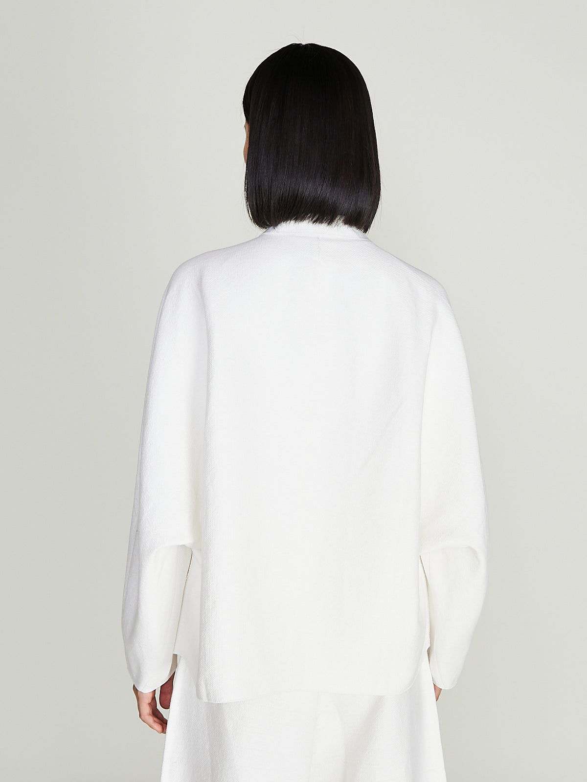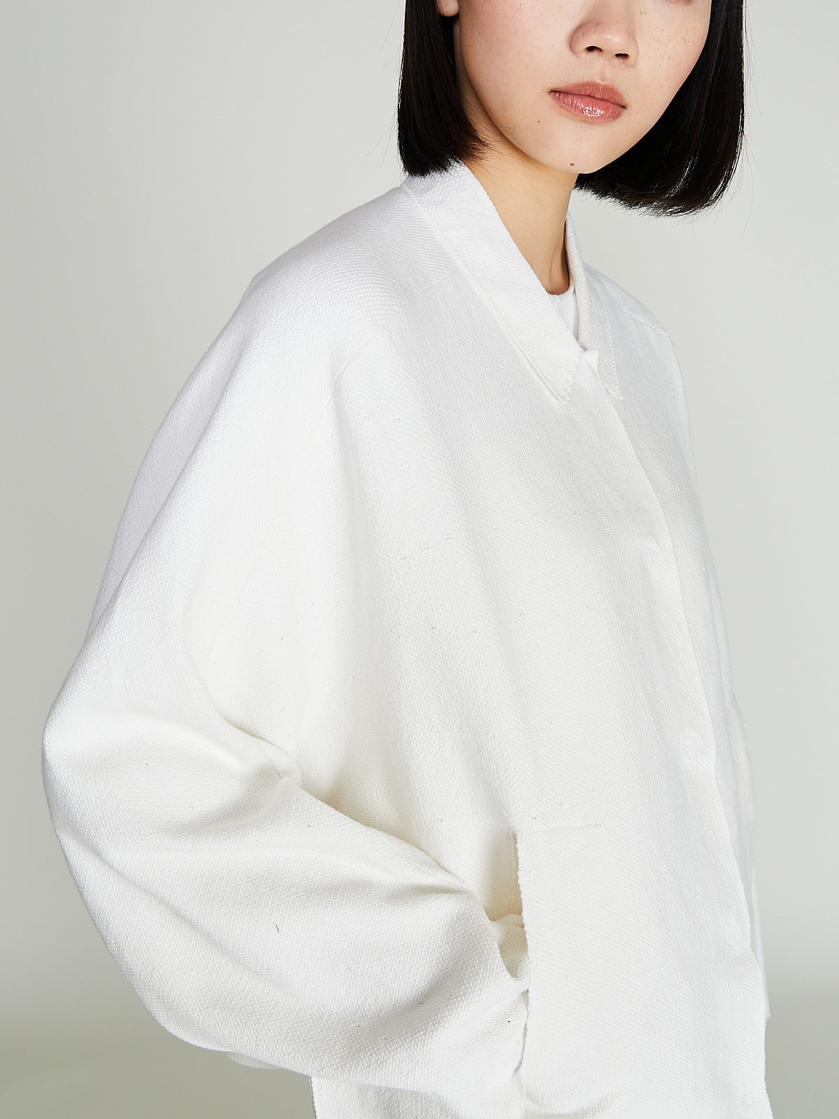 Oversized shirt jacket in a white cotton blend. Pointed collar, concealed front snap-button fastening and wide curved half raglan sleeves. Slip pockets on the front. Boxy fit.