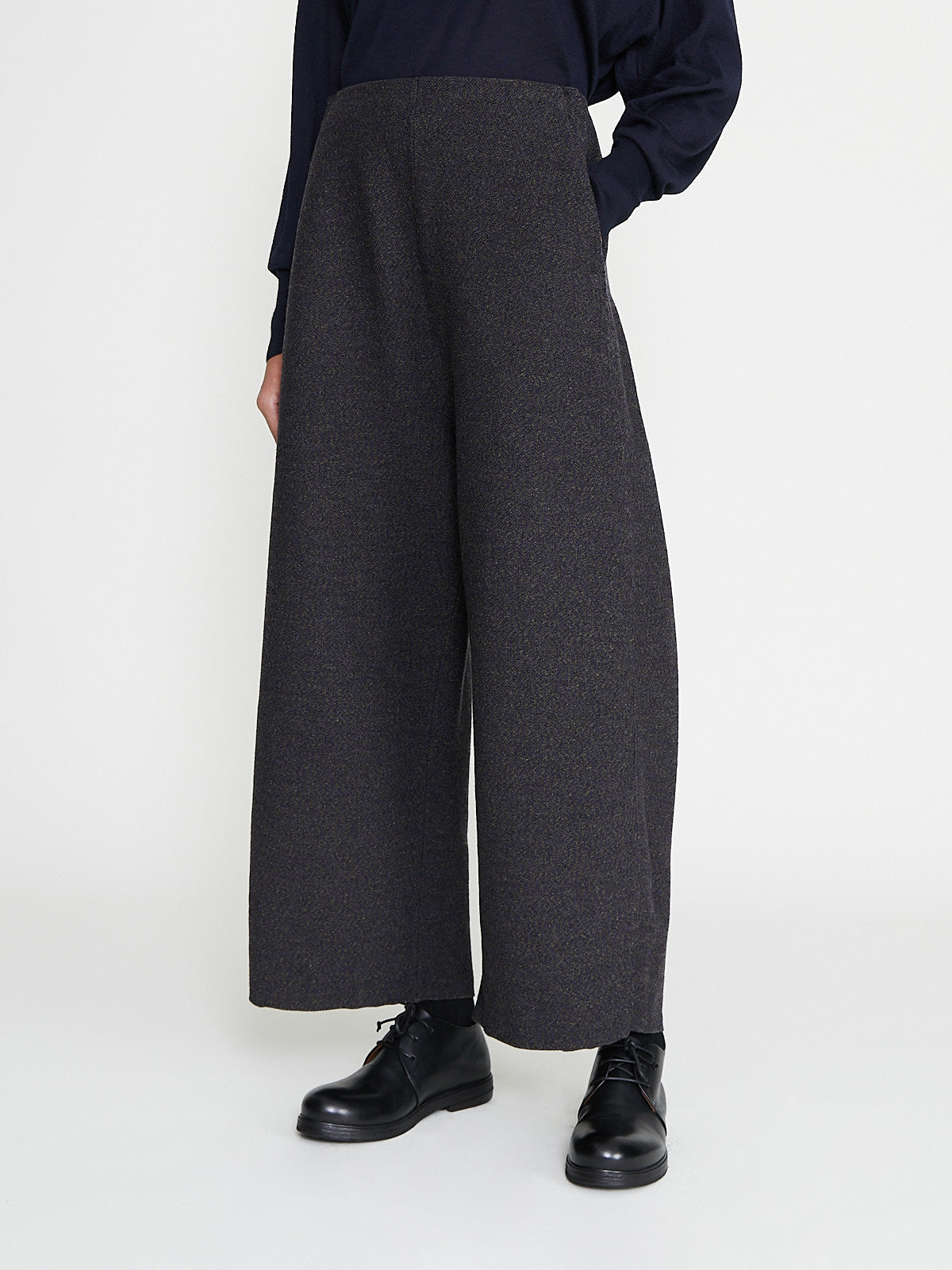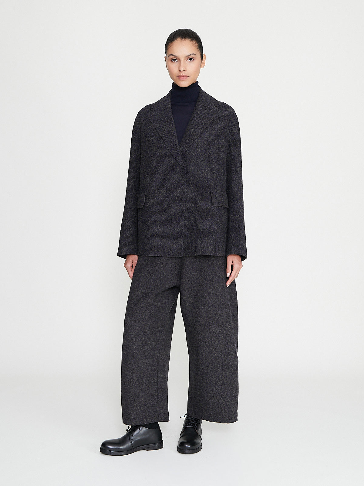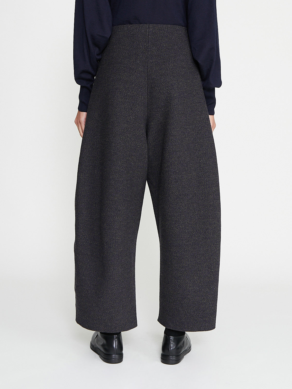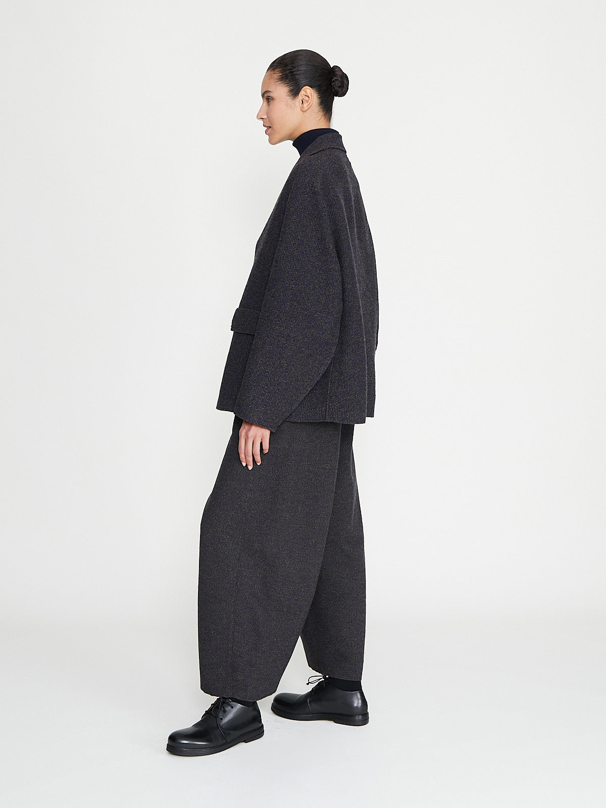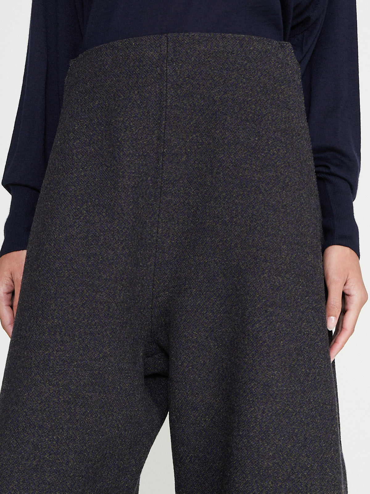 Oversized trouser in blue/green wool. High waist with a concealed zip fastening on the side. Side seam pockets. Barrel legs.