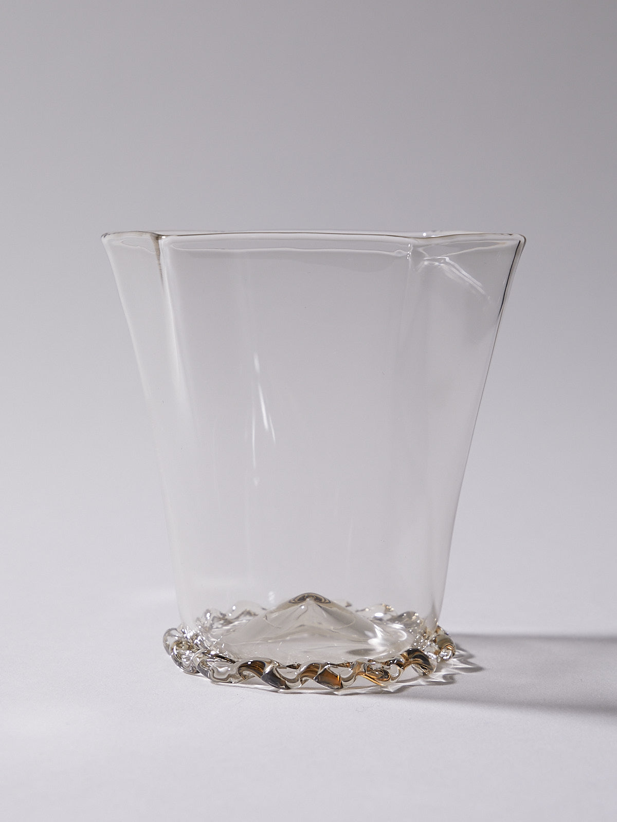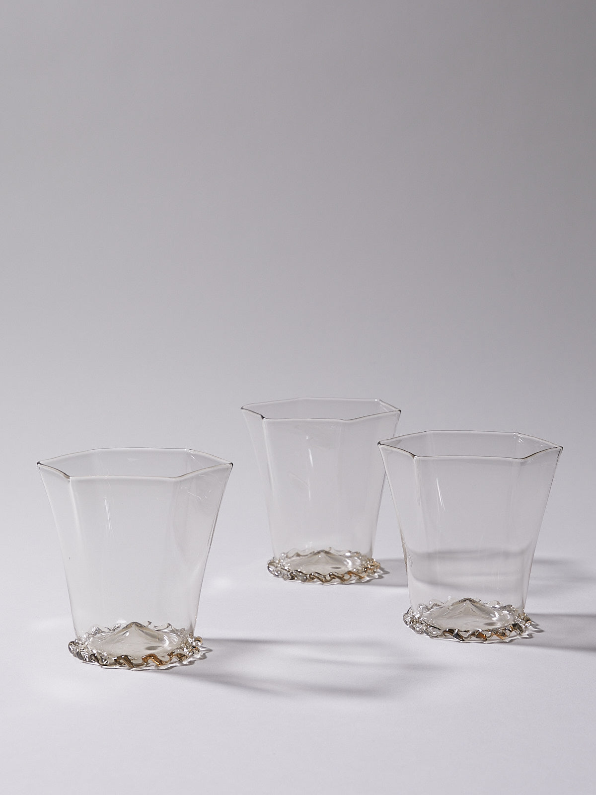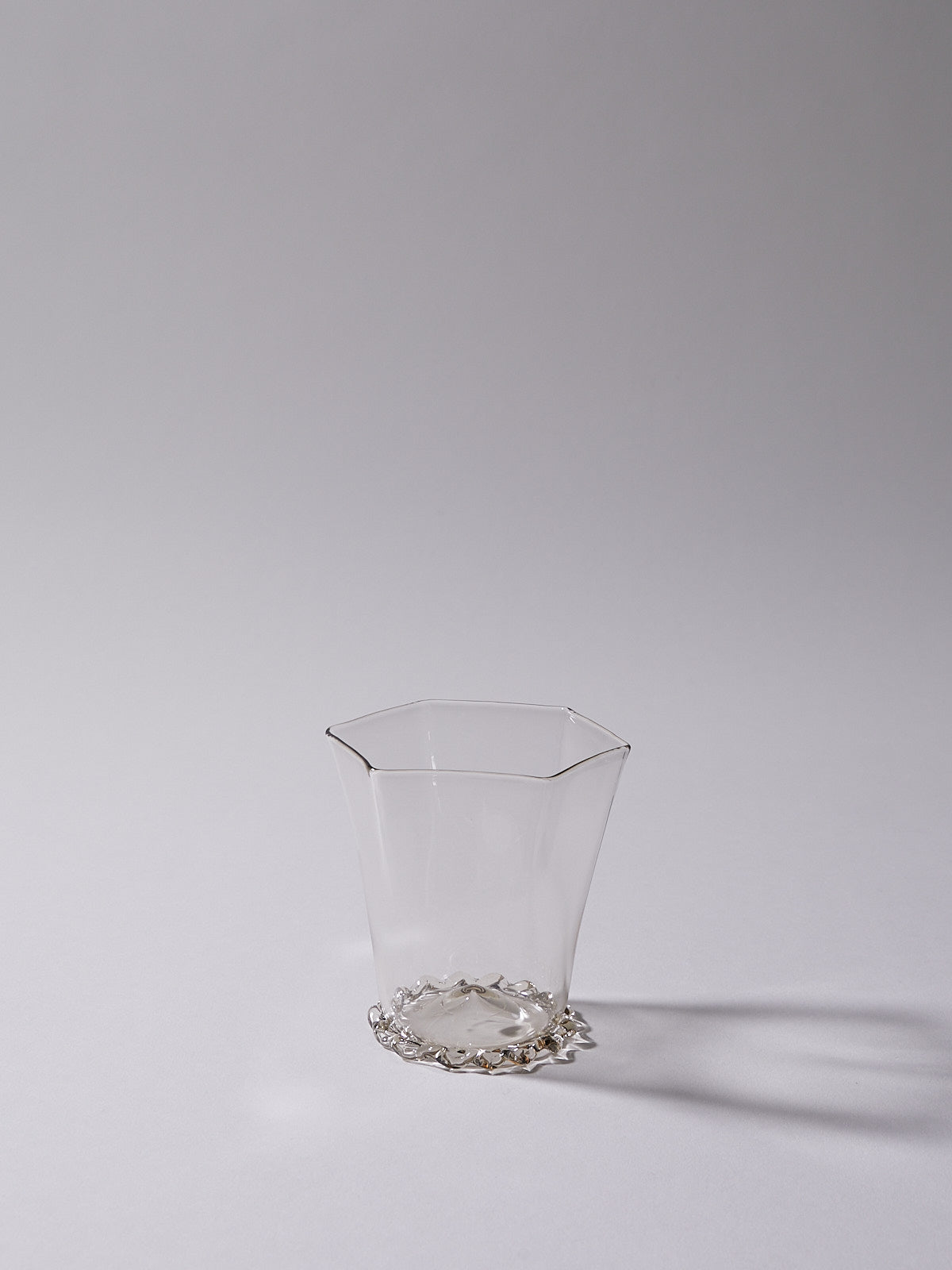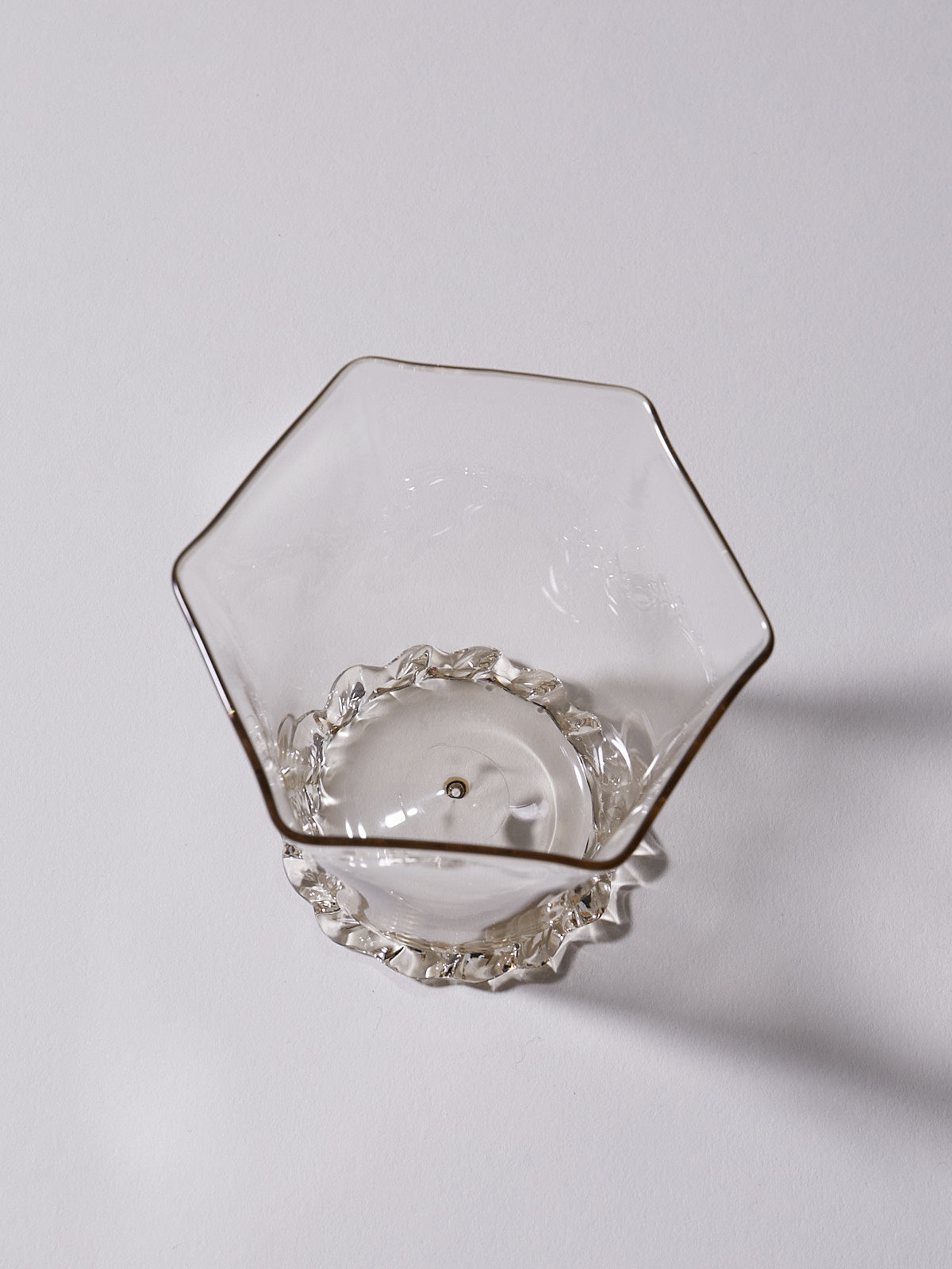 Mouth-blown water glass in grey with a hexagon shape at the top and ornamental details at the base.