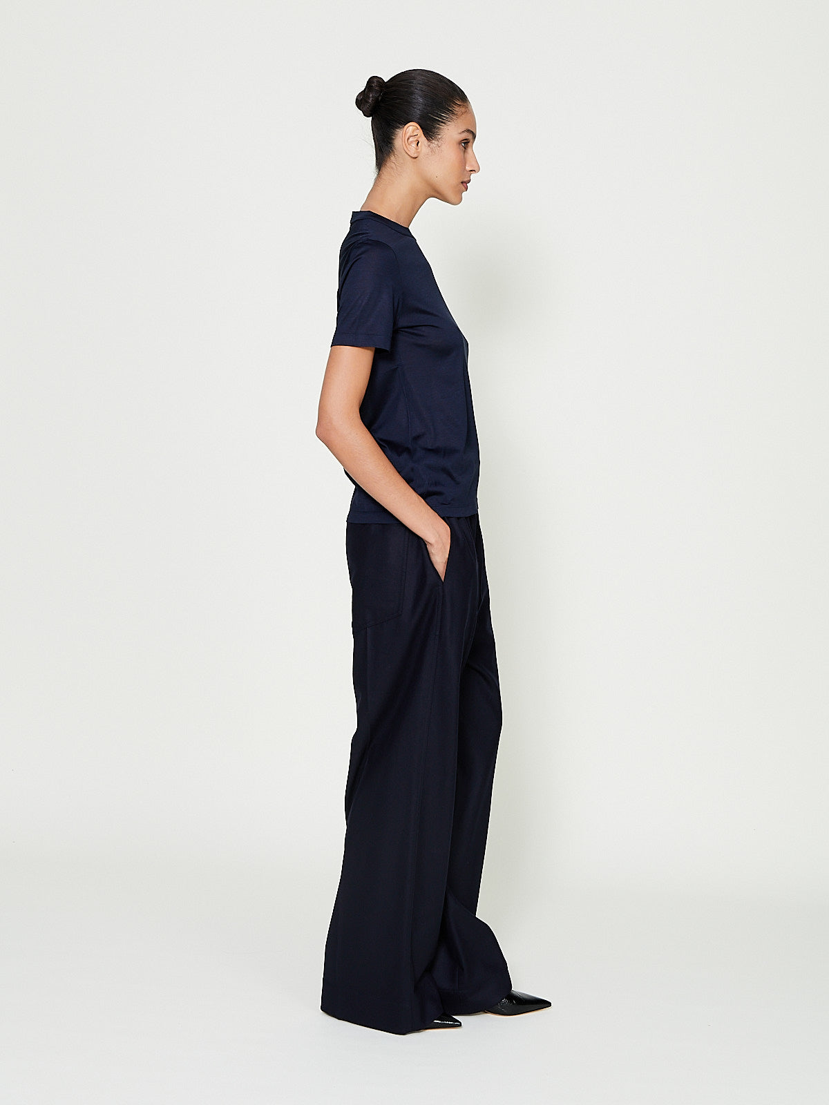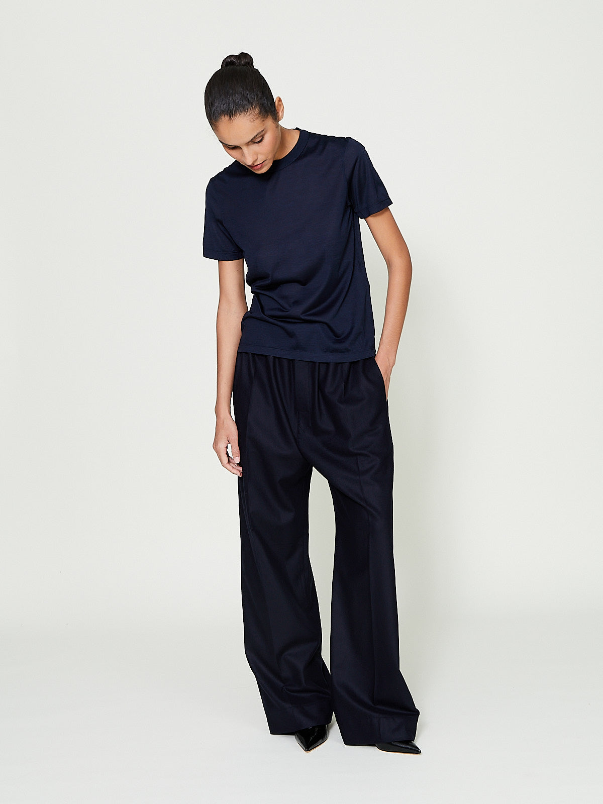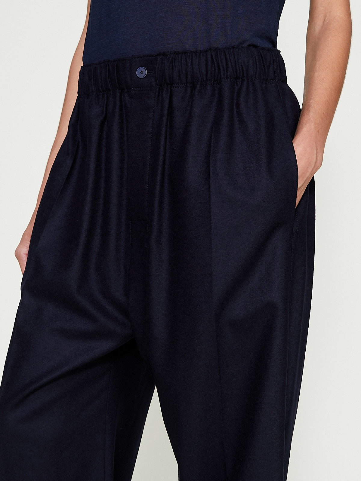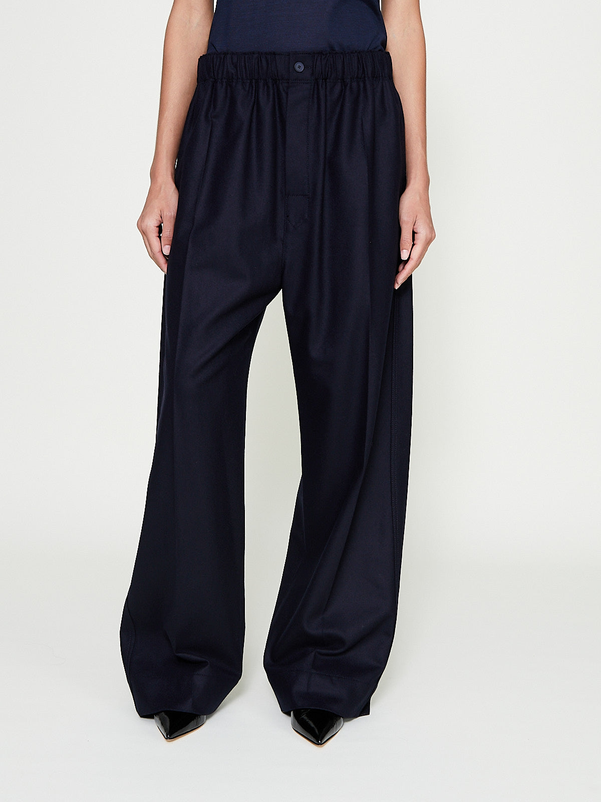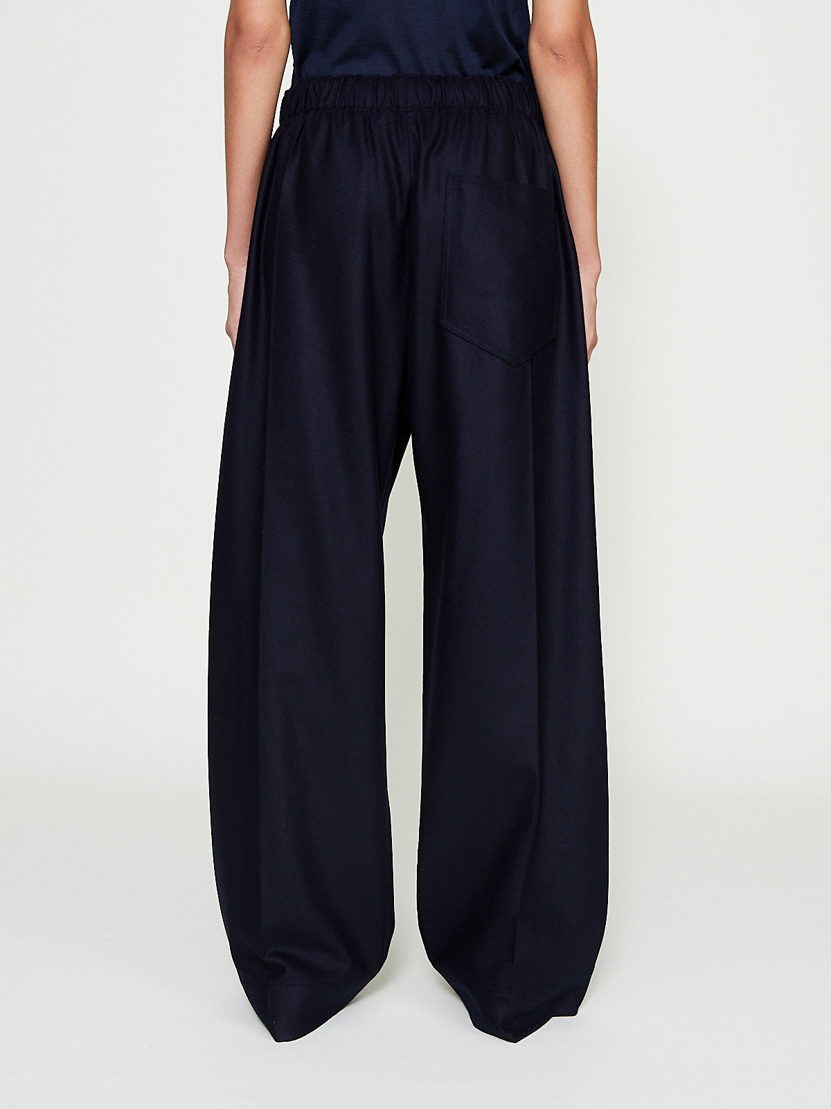Wide leg trouser in midnight blue virgin wool. Pull-on style with an elasticated adjustable drawstring waist and a traditional button fly. Side seam pockets and a single patch pocket on the bag. Gathered at the waist and pleated legs. Relaxed fit.