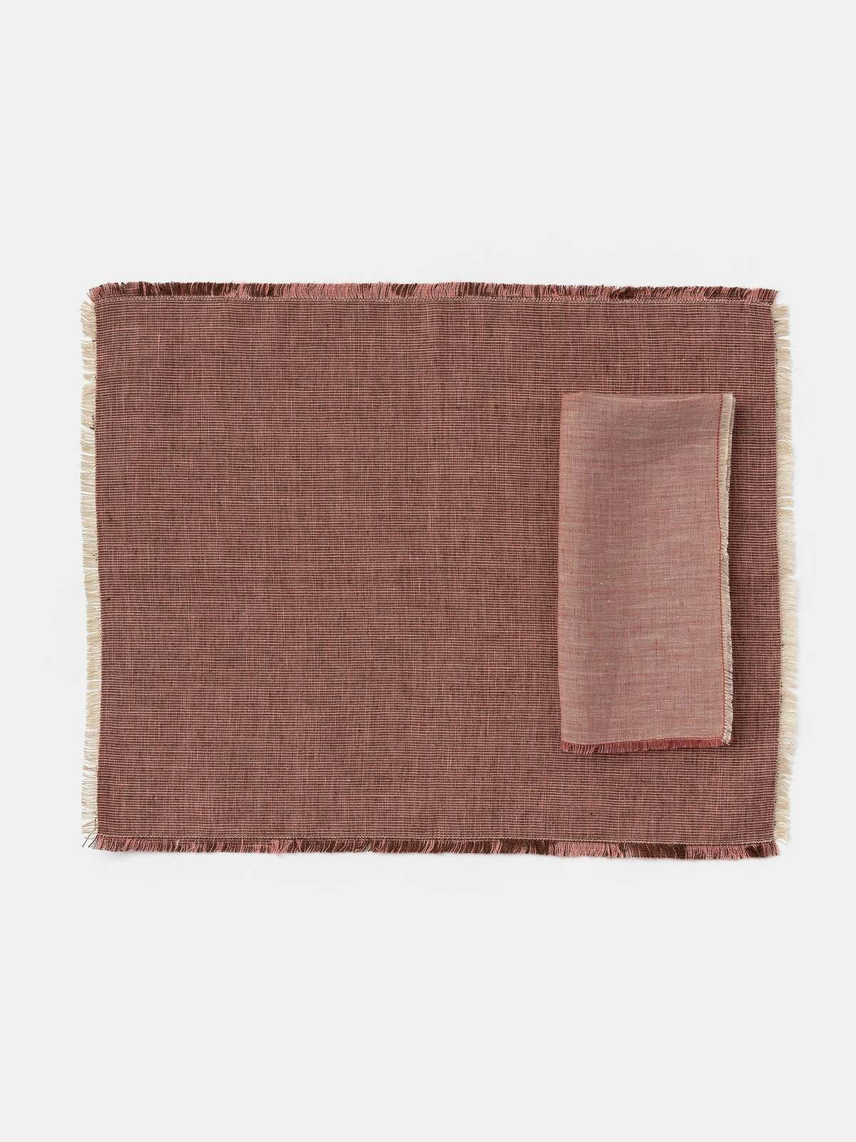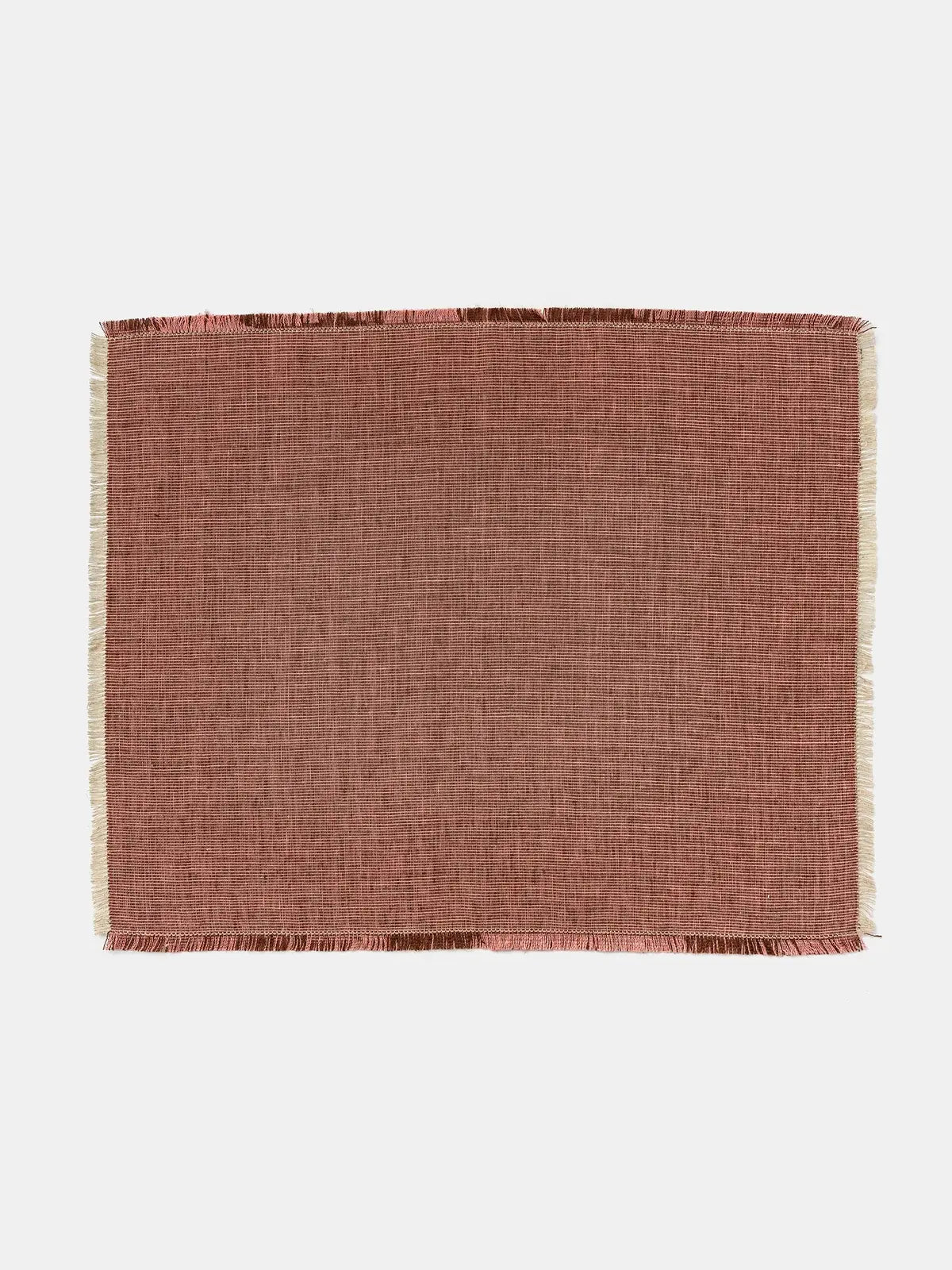 Placemat in yarn-dyed rust brown linen with a plain weave that creates a decorative effect by alternating a lighter and a darker yarn, in both warp and weft. The resulting fabric is visually appealing with a wavy, melange surface.