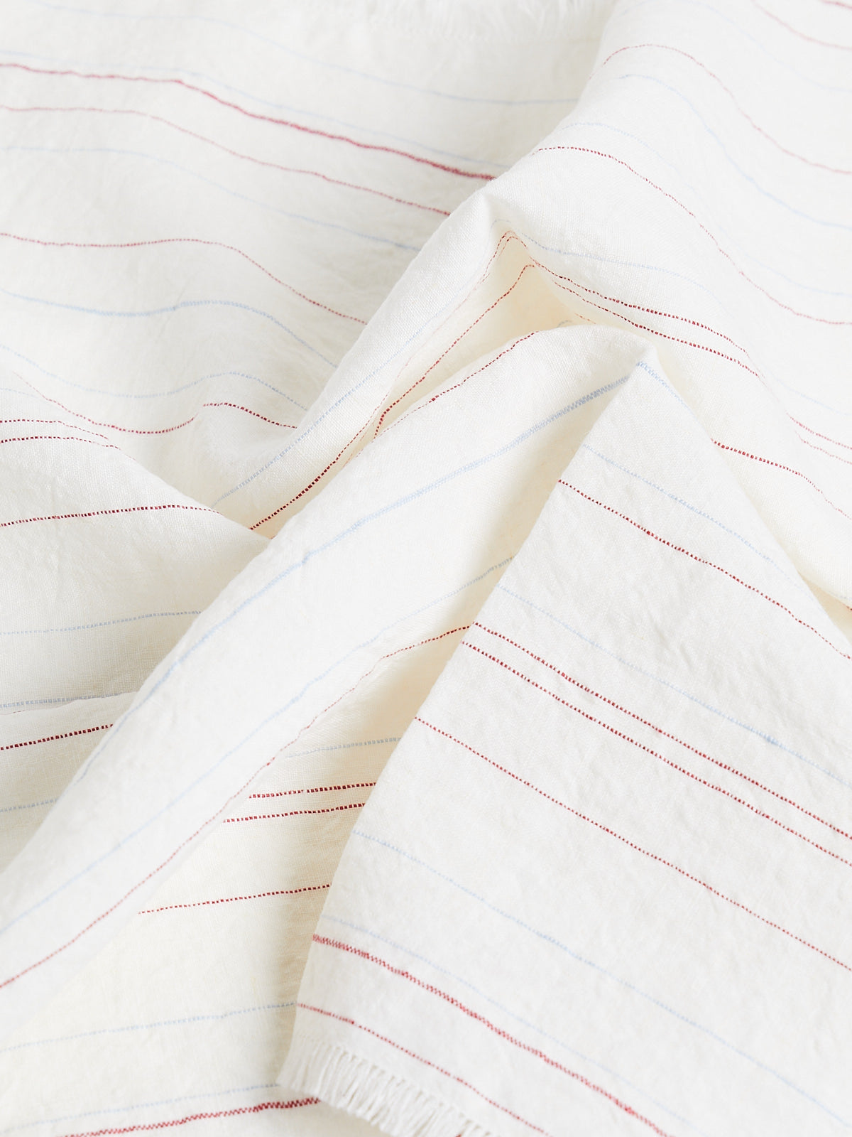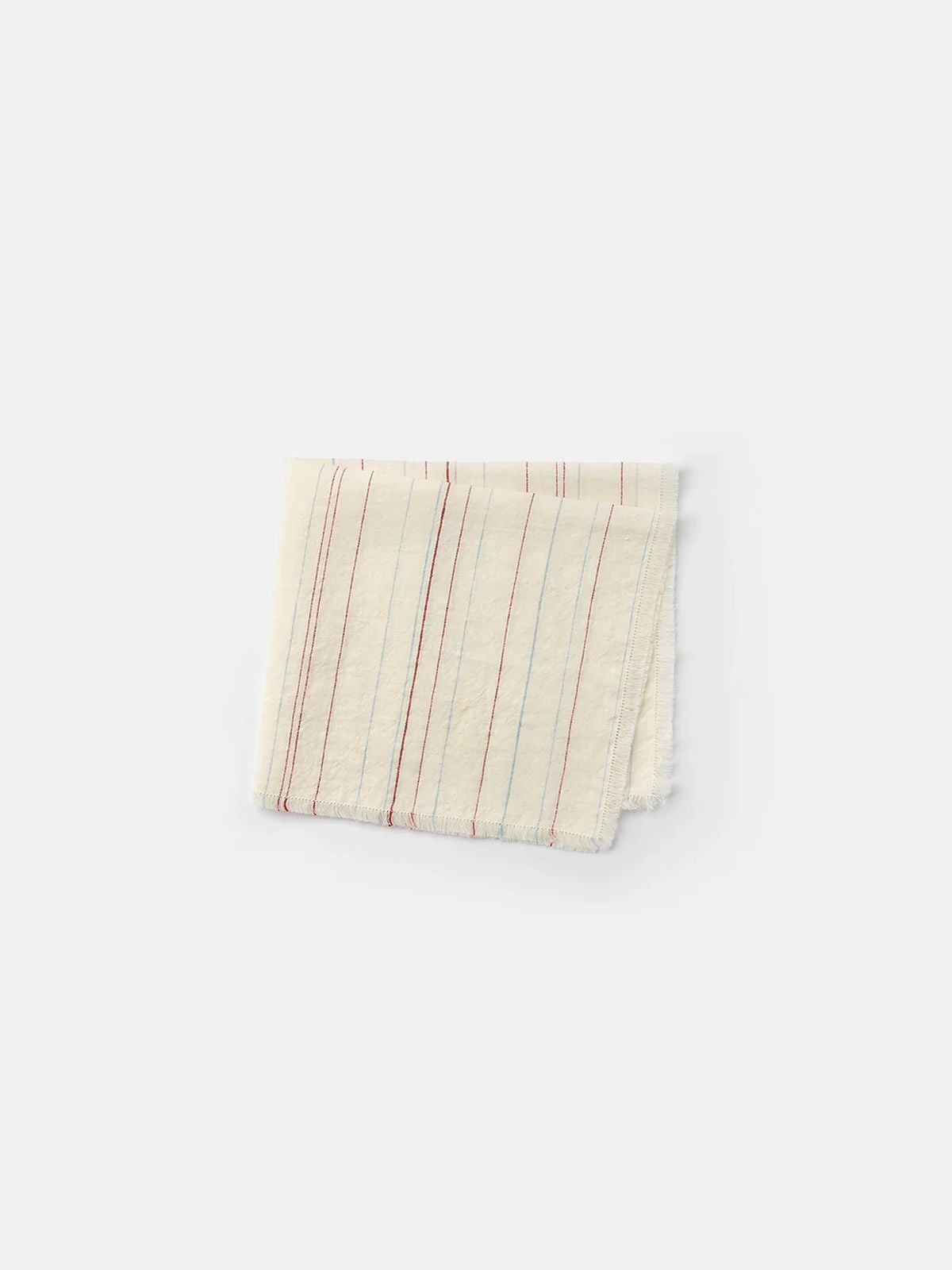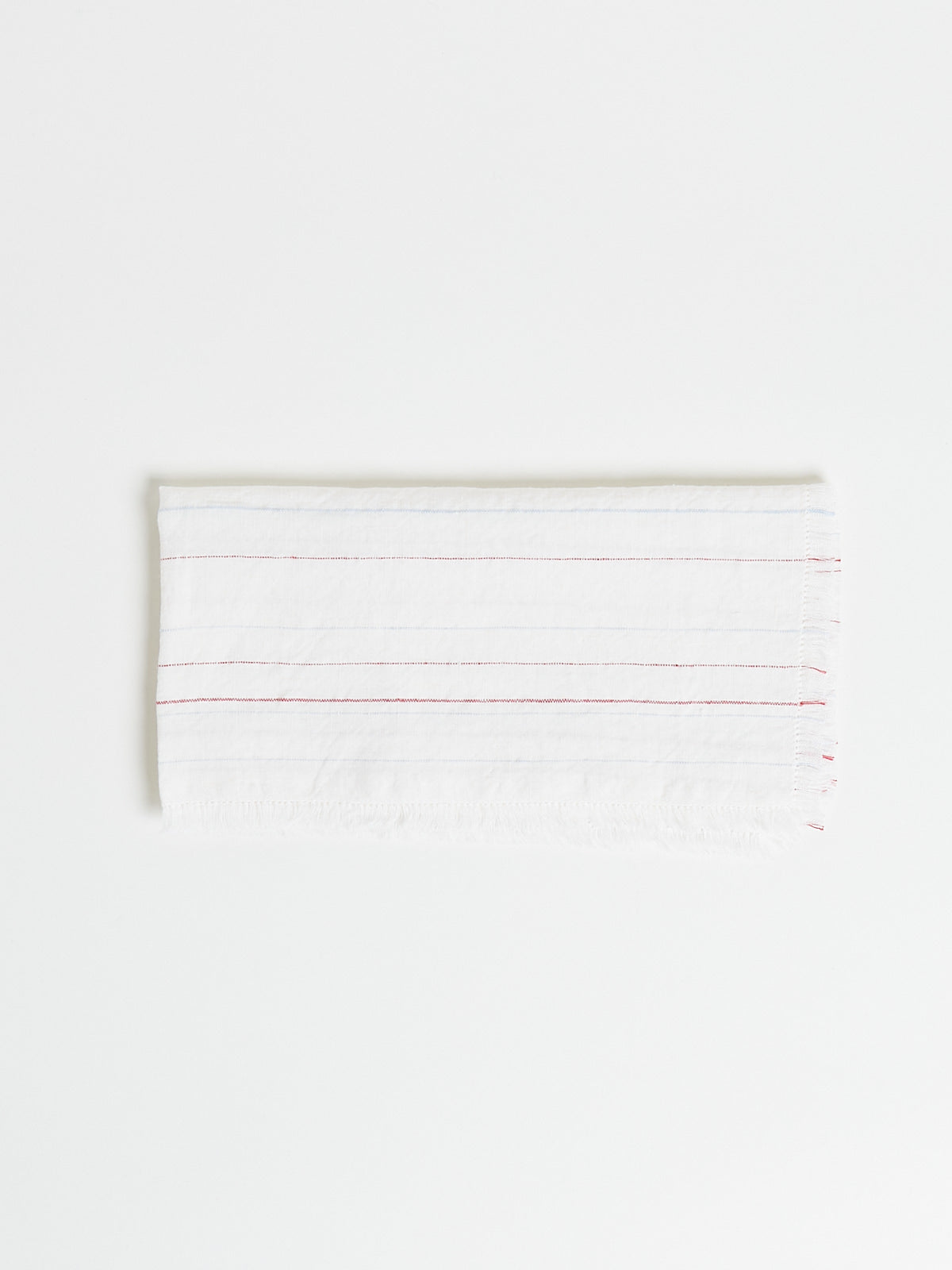 Napkin made from pure pre-washed white linen with red stripes. The colours are “indanthren”, which means a range of dyes with maximum fastness to light, washing and chlorine. The thin stripes are created using a double twisted thread.