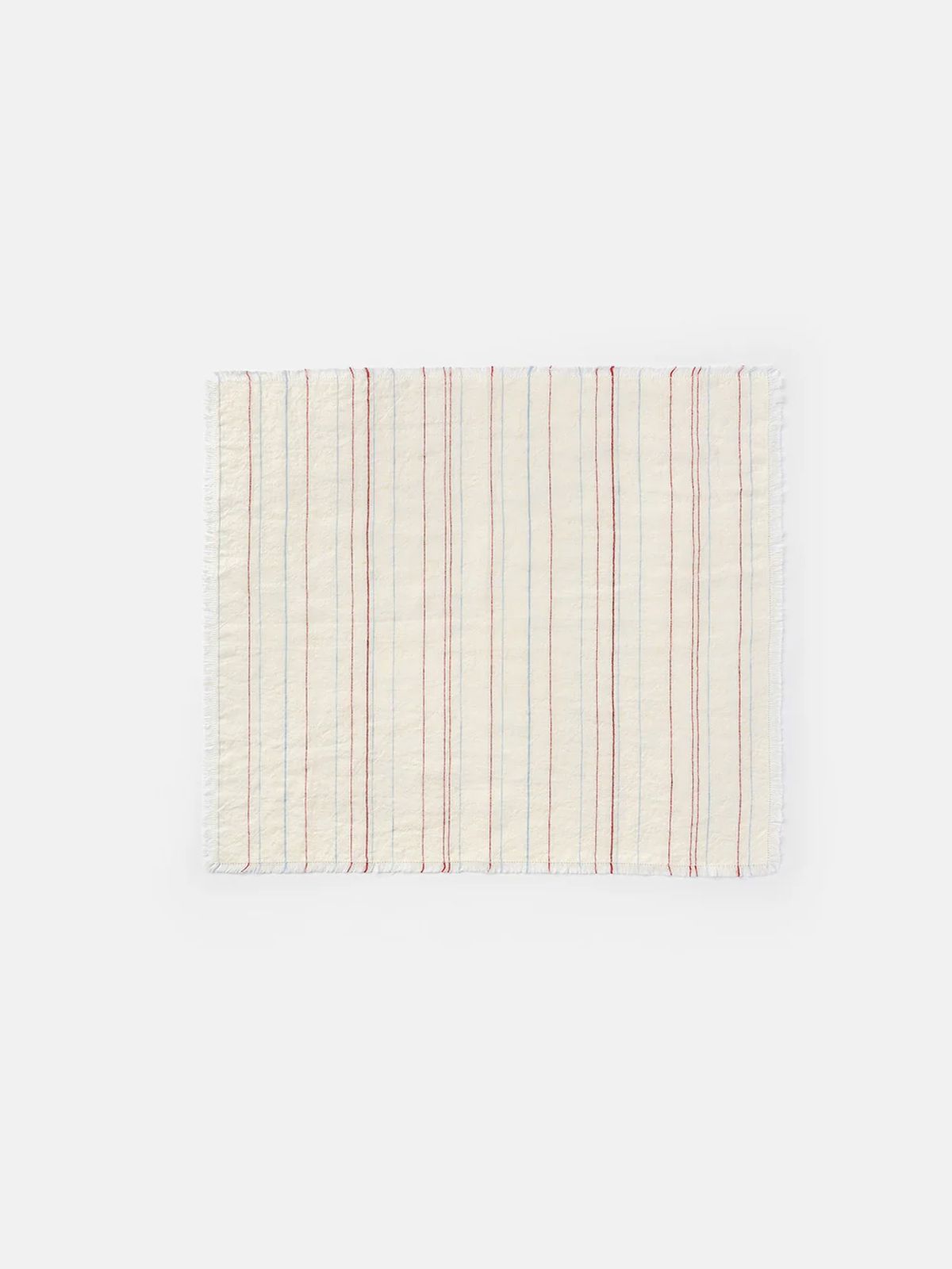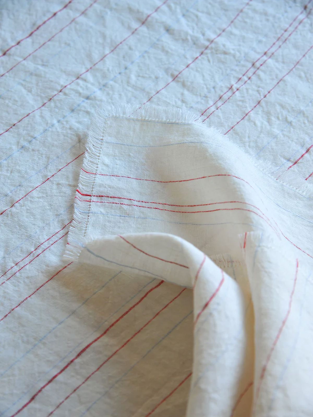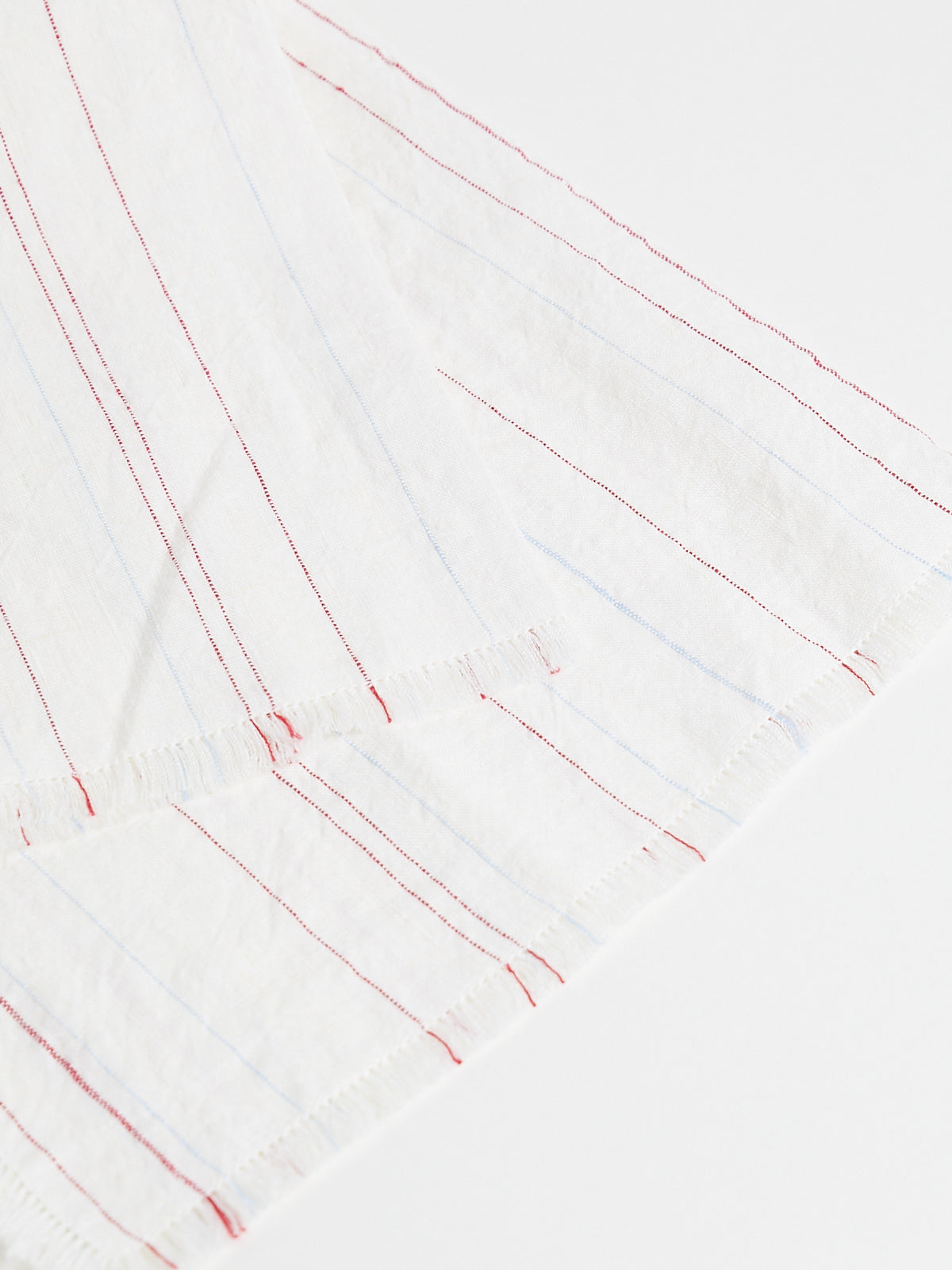 Napkin made from pure pre-washed white linen with red stripes. The colours are “indanthren”, which means a range of dyes with maximum fastness to light, washing and chlorine. The thin stripes are created using a double twisted thread.
