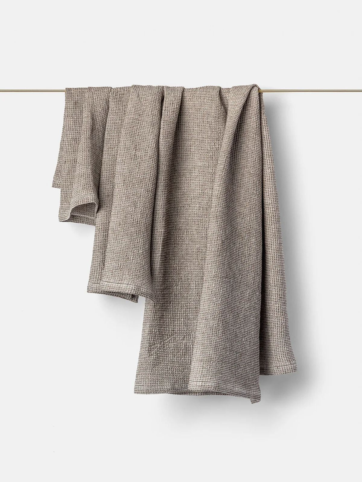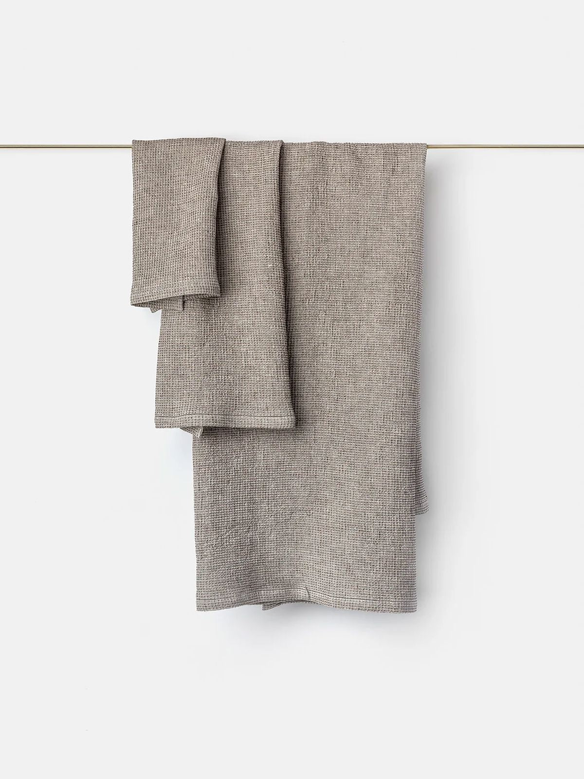 Towel made from brown yarn-dyed linen waffle. The pattern itself combined with the quality of the linen, makes this product easy to dry, therefore antibacterial and naturally hypoallergenic. These towels have been pre-washed during the production process to make the fabric softener and ready for use.
