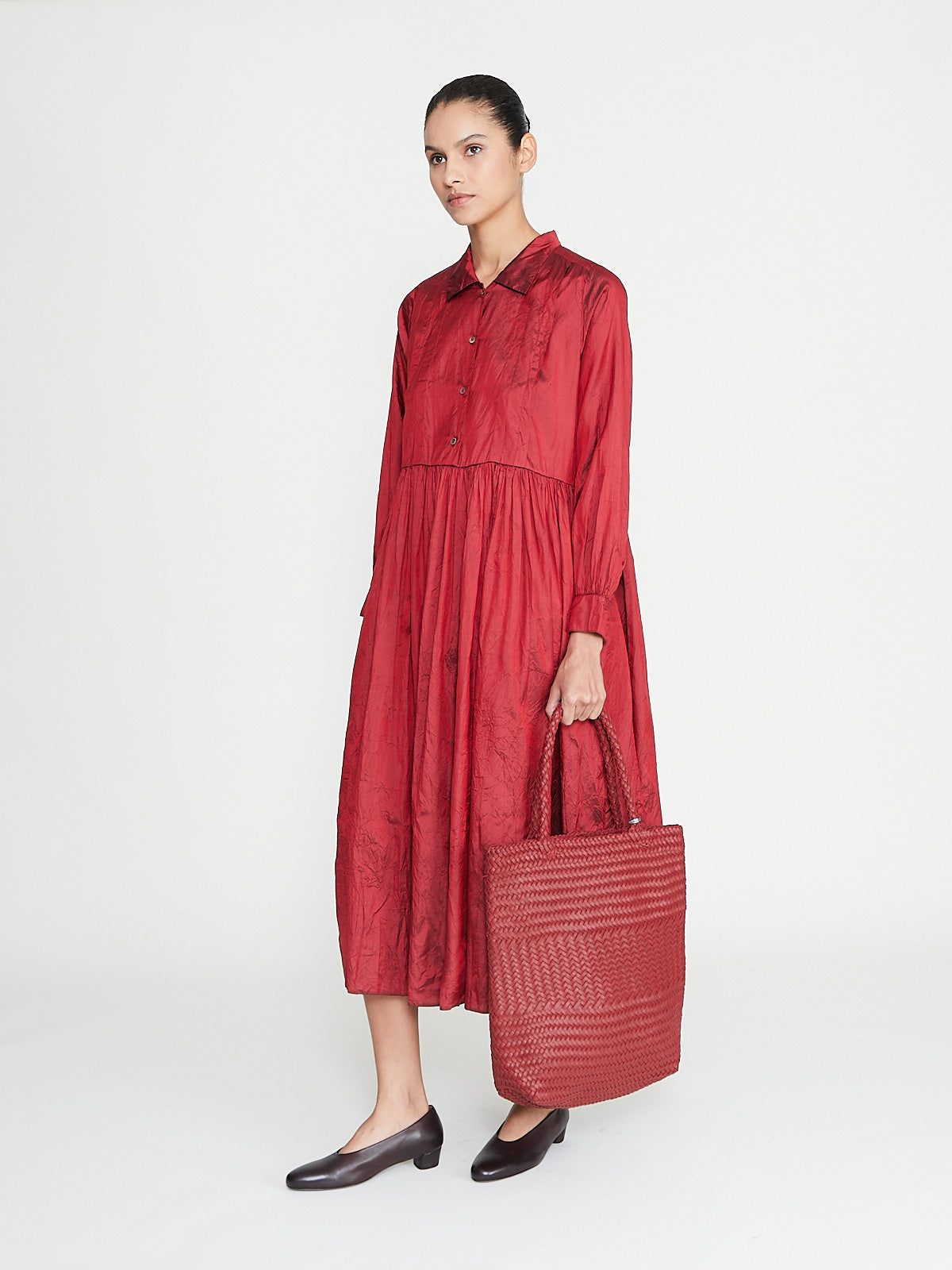 Large tote bag in red cow leather. Two top handles. Unlined with no interior pockets.