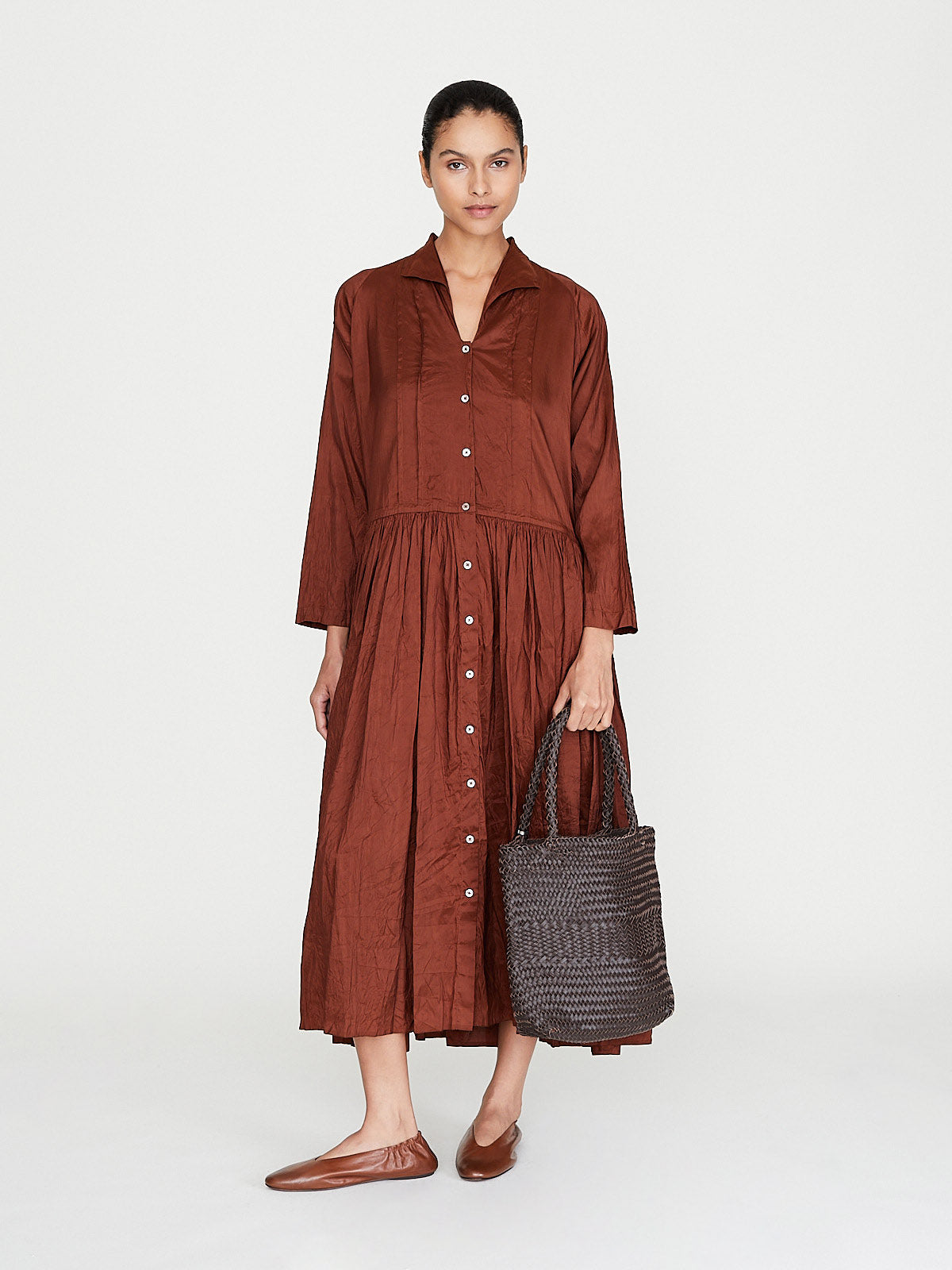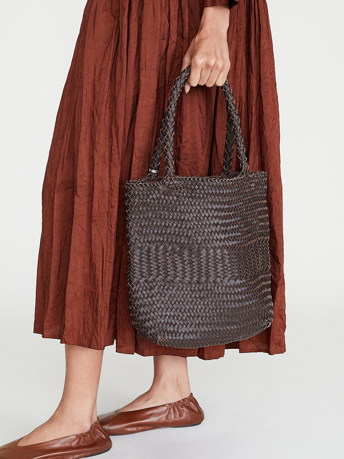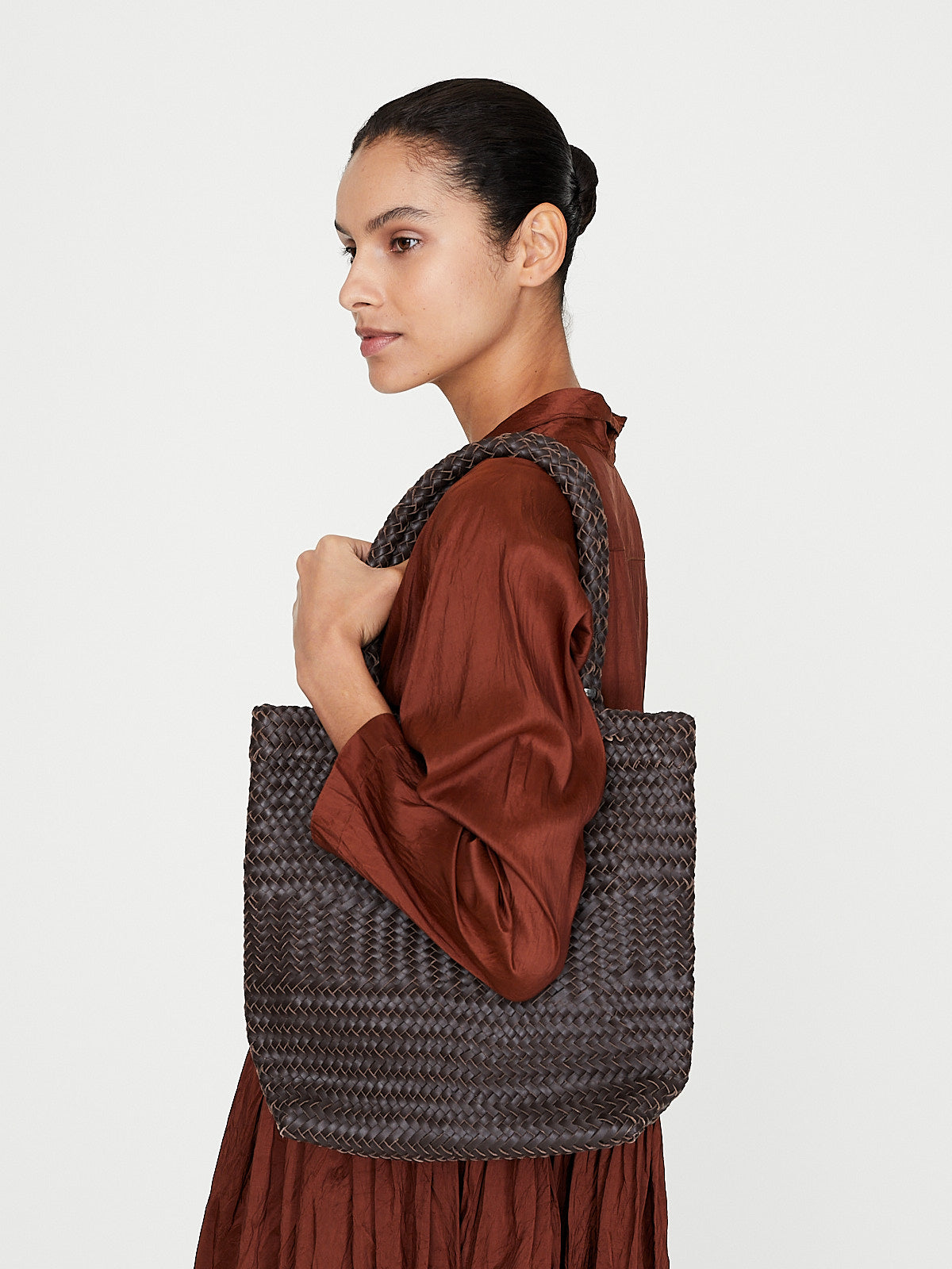 Tote bag in dark brown cow leather. Two top handles. Unlined with no interior pockets.