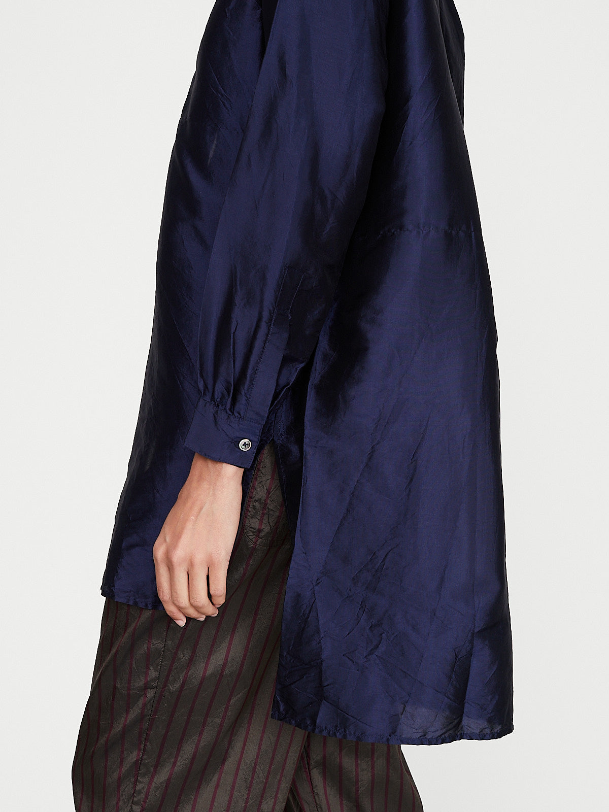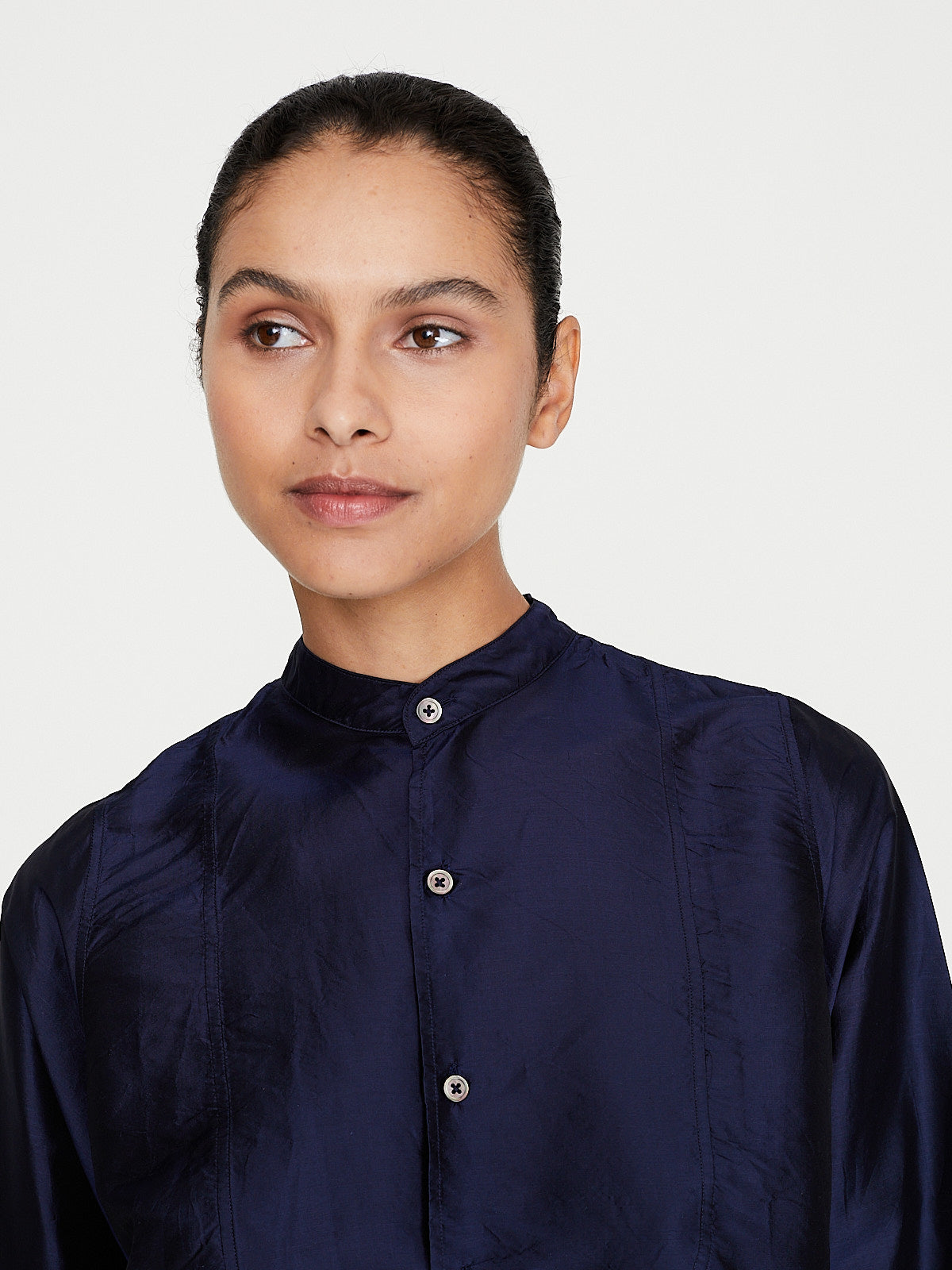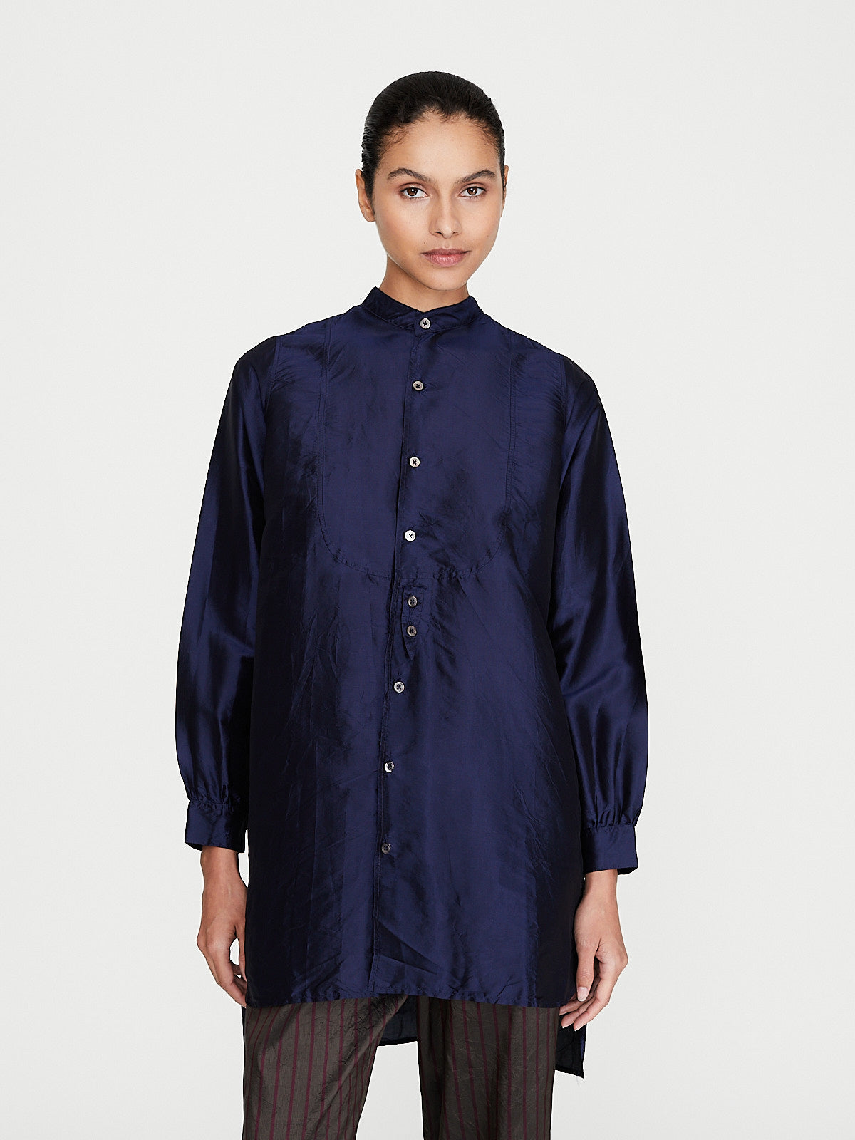 Long silk blouse in navy silk. Banded collar, front button fastening and cropped sleeves with buttoned cuffs. Features a bib detail on the front, a back yoke with a box pleat detail. Side slits at the bottom hem that is longer at the back. Relaxed fit.
