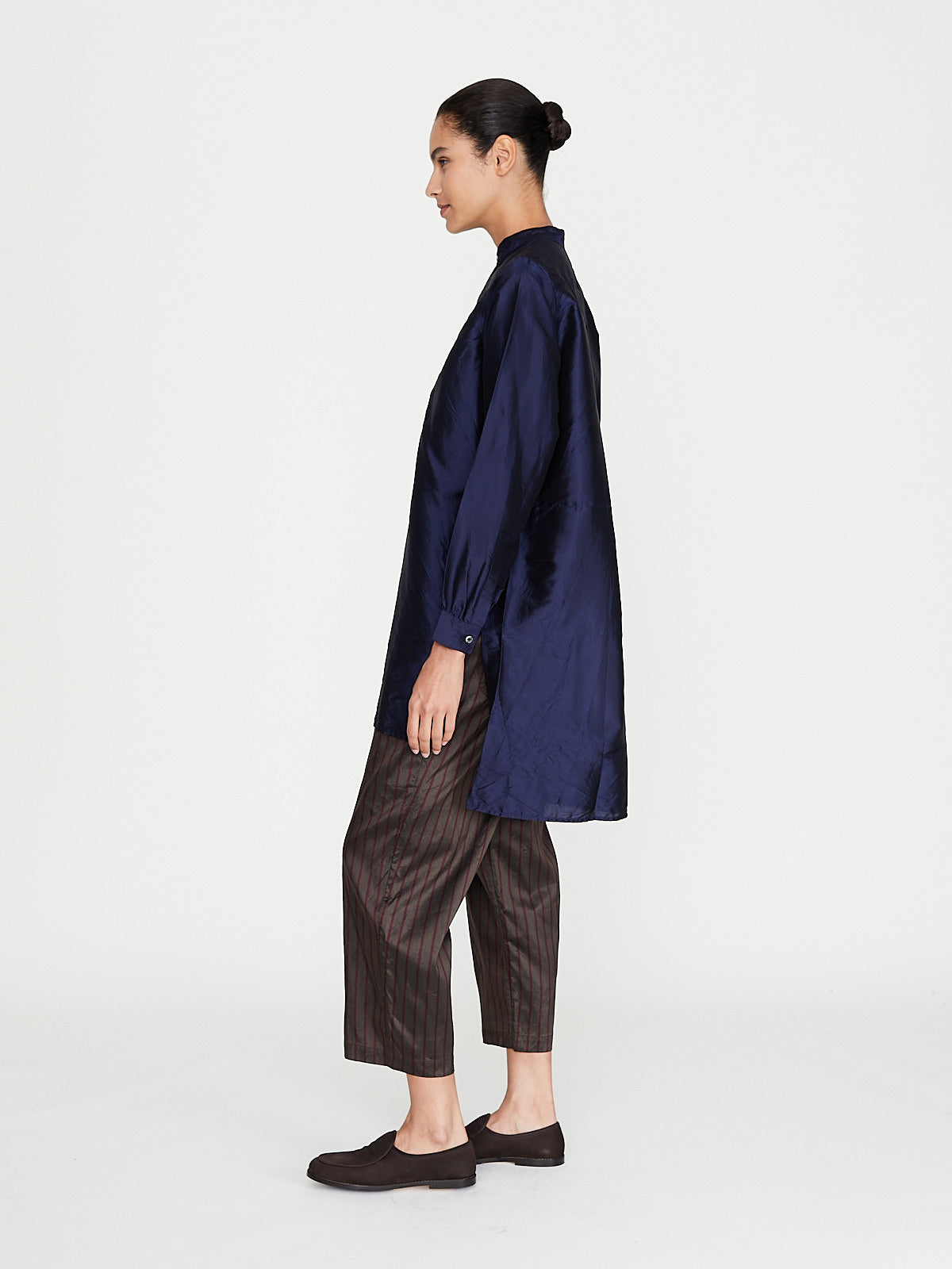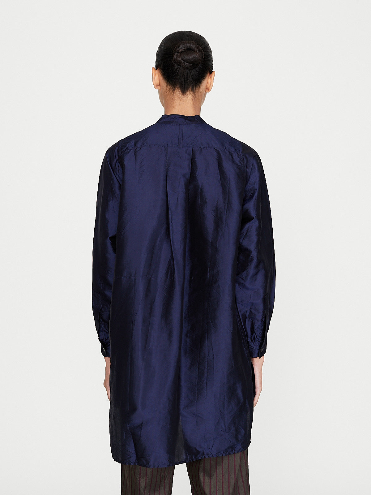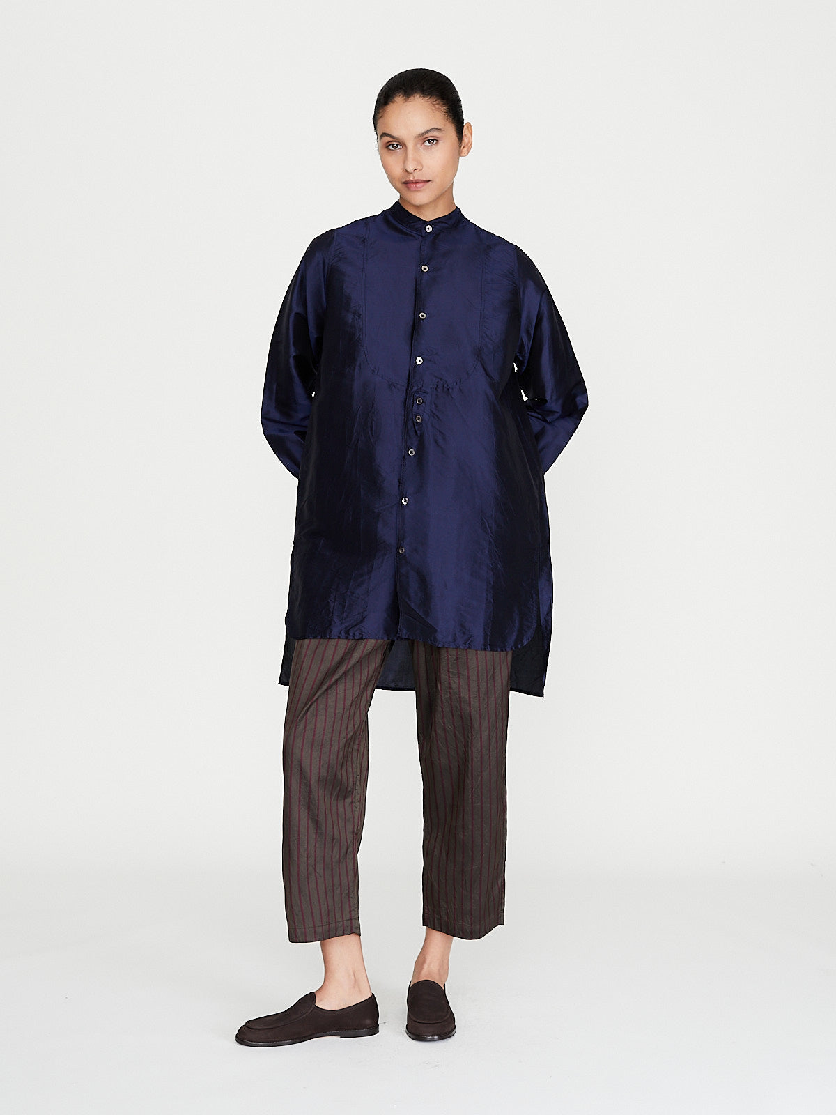 Long silk blouse in navy silk. Banded collar, front button fastening and cropped sleeves with buttoned cuffs. Features a bib detail on the front, a back yoke with a box pleat detail. Side slits at the bottom hem that is longer at the back. Relaxed fit.