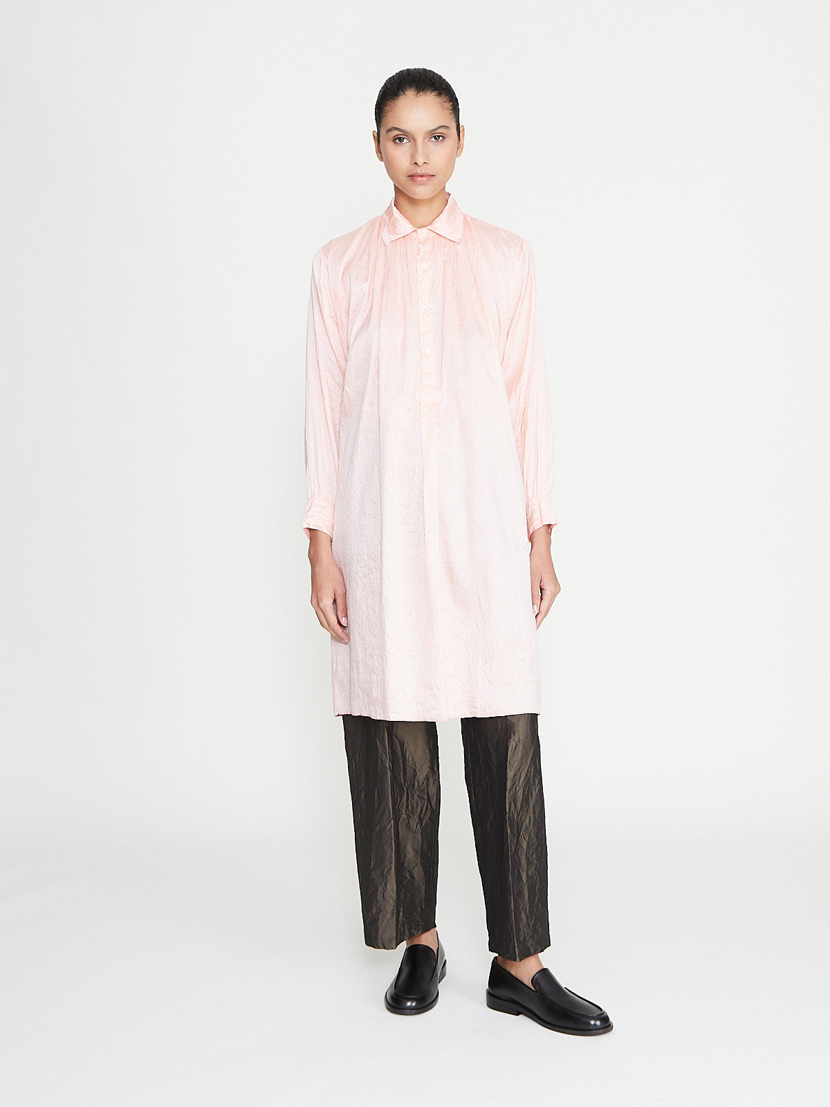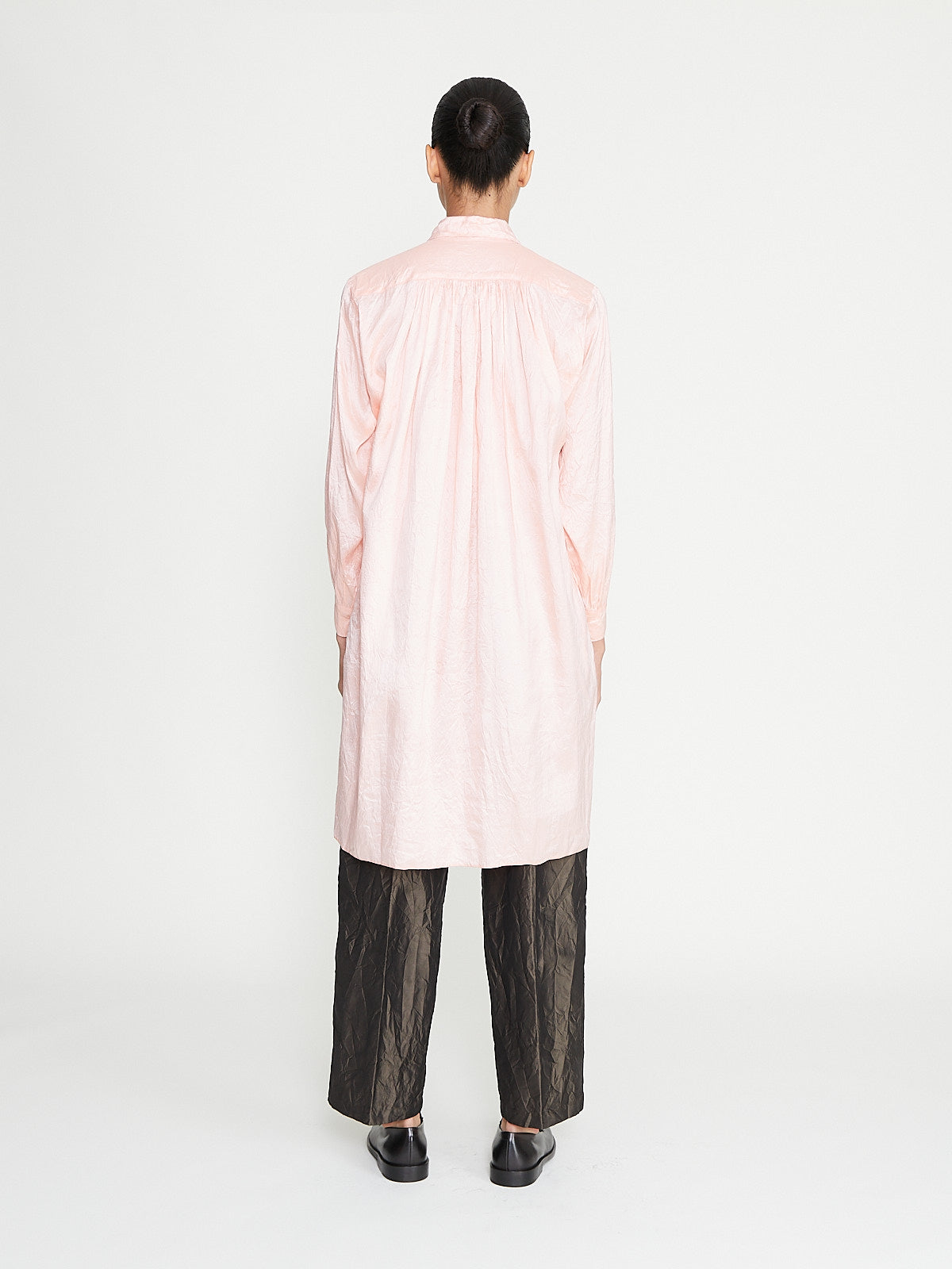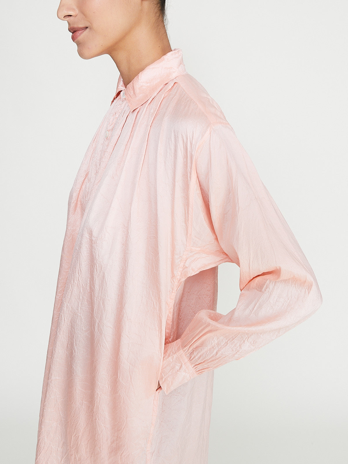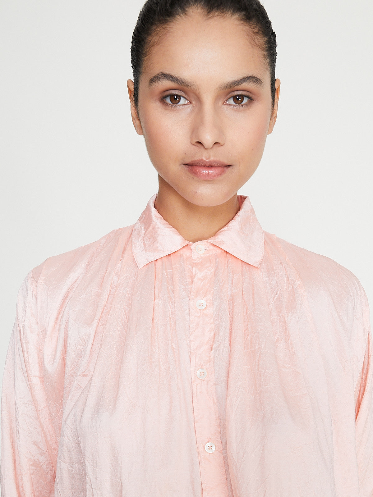 Long silk blouse in pale pink silk. Spread collar, partial front button fastening and cropped dolman sleeves with buttoned cuffs. Features tuck pleats on the front of the neck and a back yoke with a gathering detail. Relaxed fit.