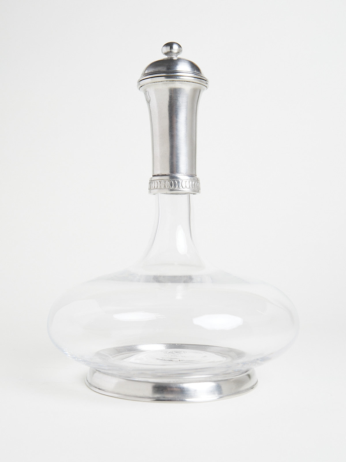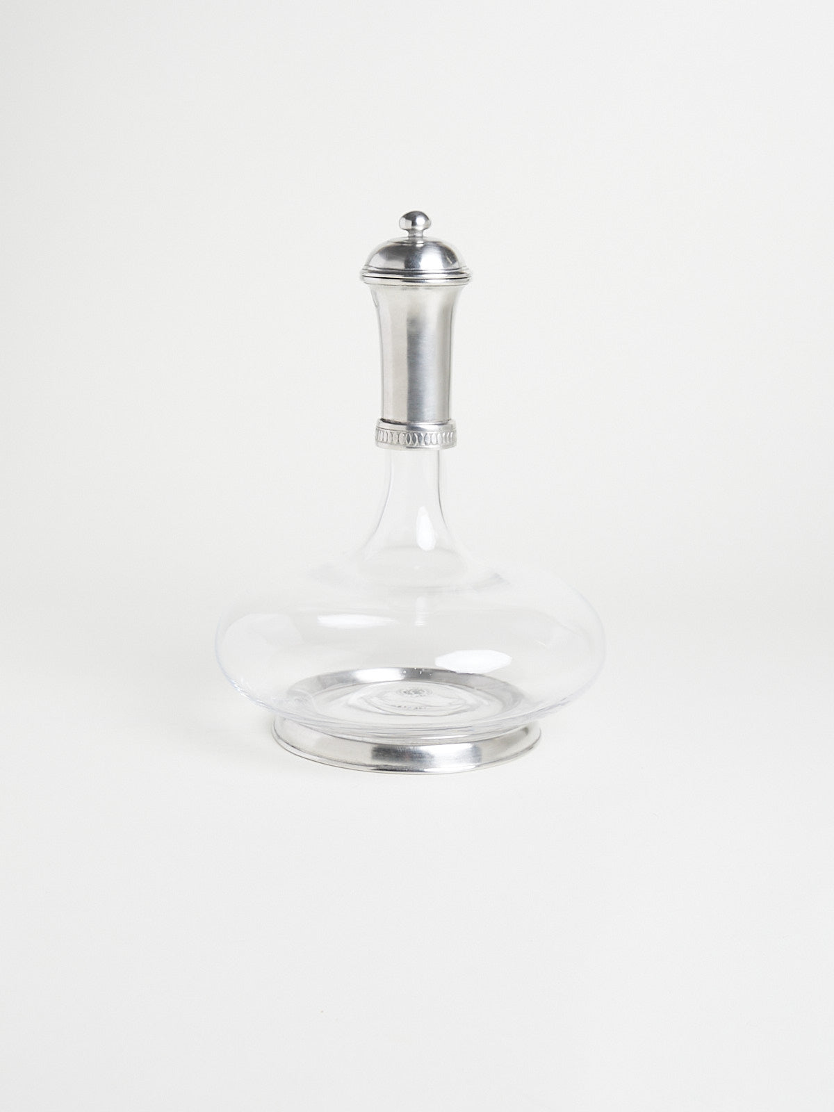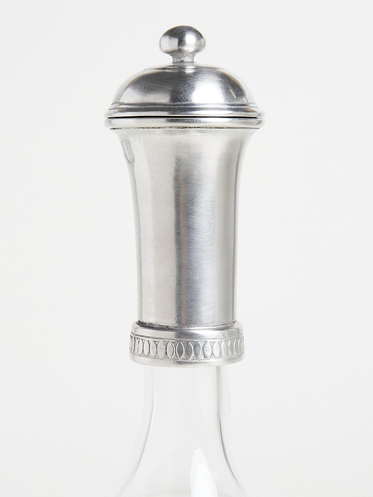 Handcrafted glass decanter with a neck, base and top made from lead-free Italian pewter.