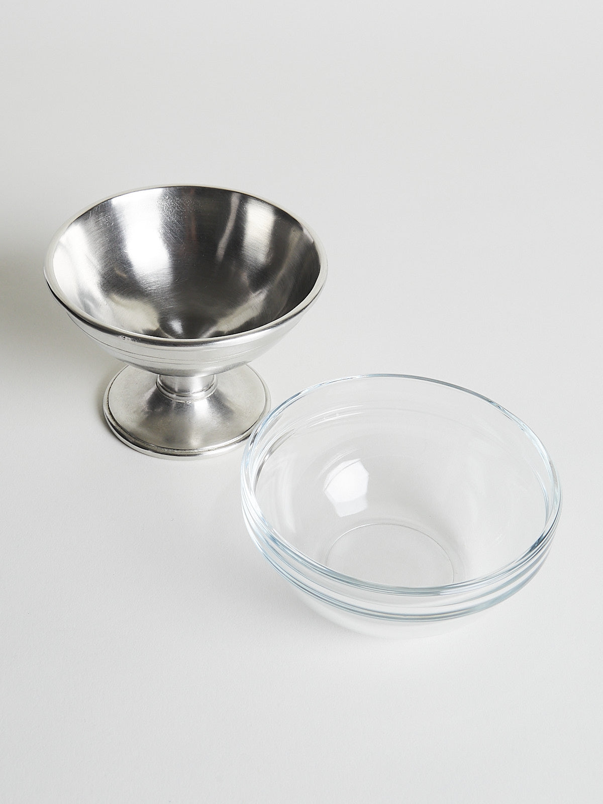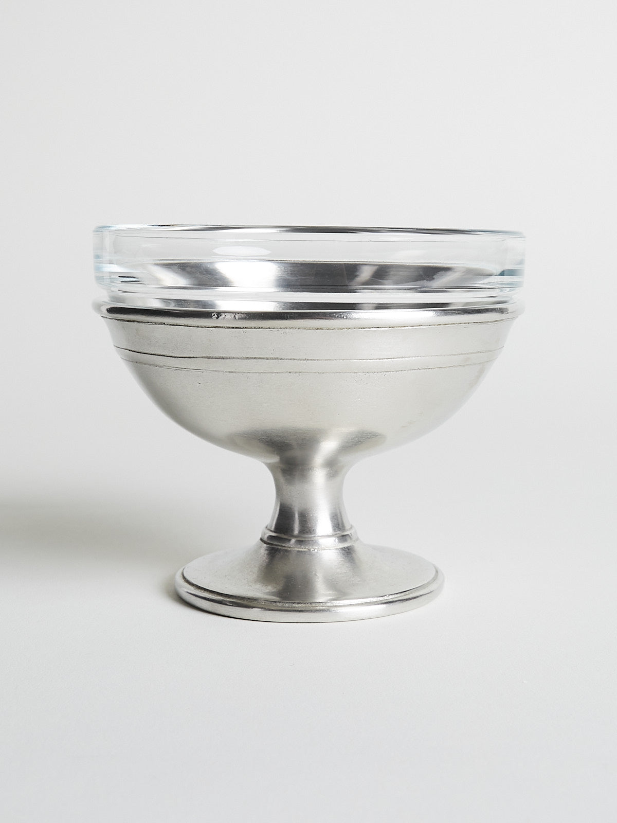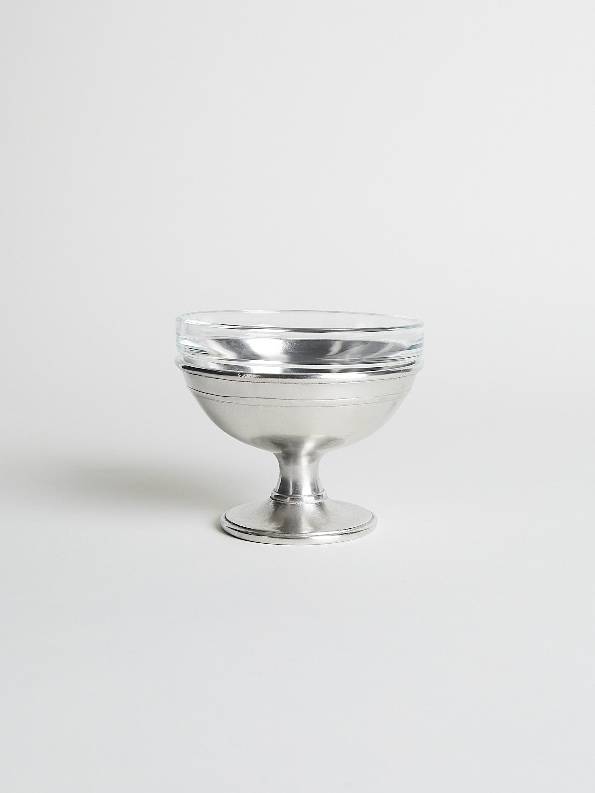 Footed ice cream dish made from pewter with a removable glass bowl.