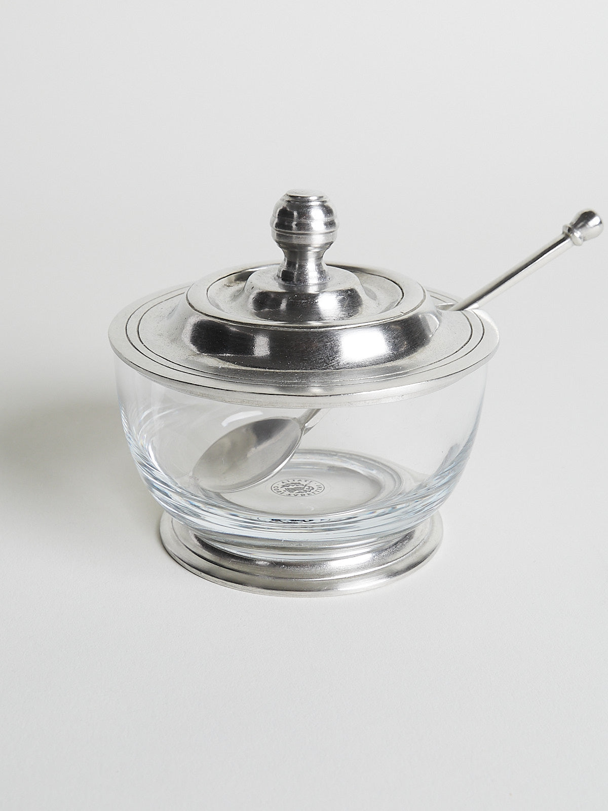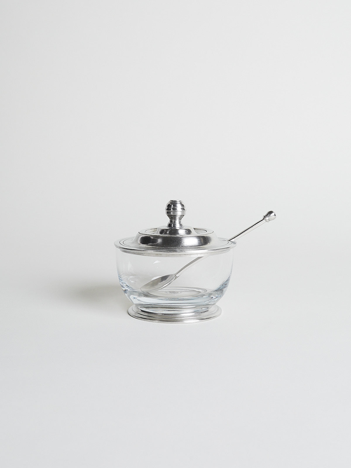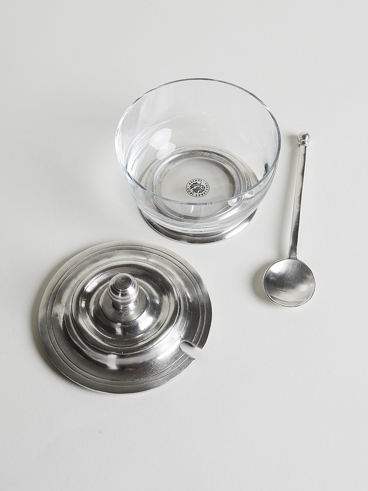 Sugar/jam bowl made from lead-free crystal glass with a pewter base. Comes with a spoon and lid.