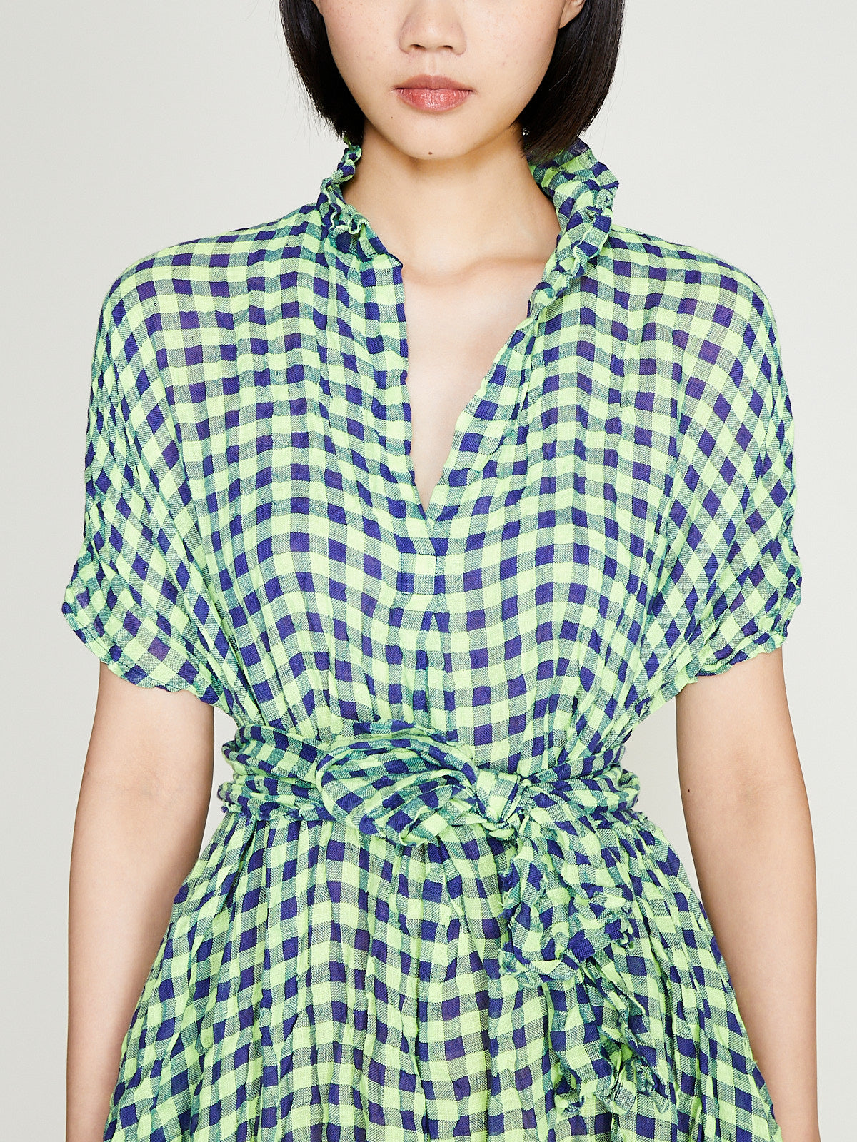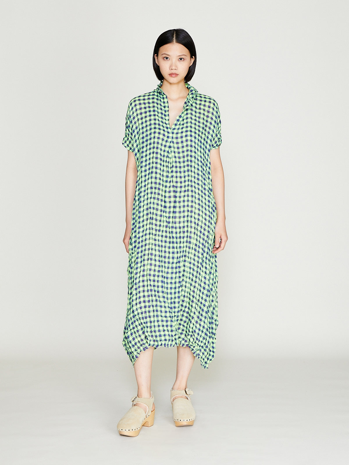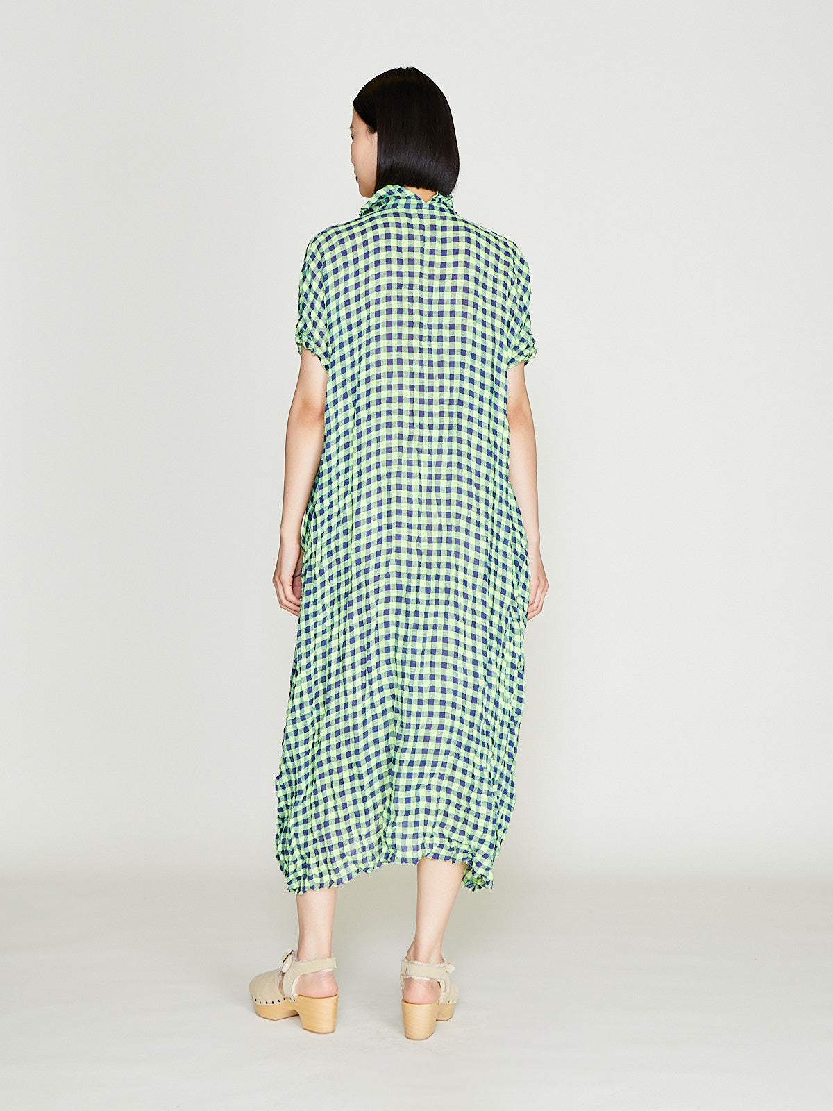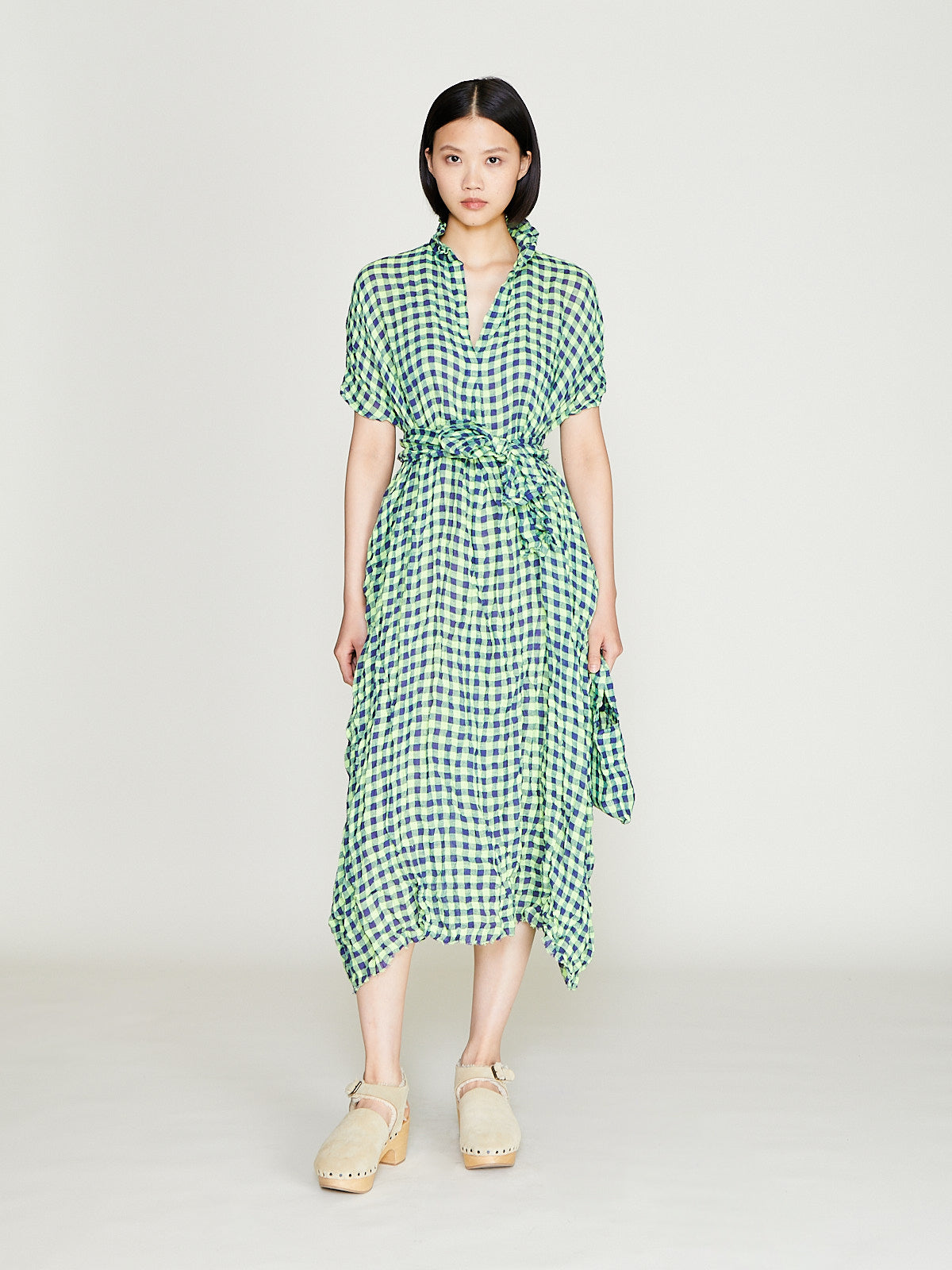 Relaxed dress in washed blue/neon yellow checked linen. V-neckline with a small collar and short dolman sleeves. Side seam pockets and midi length. Cinch the silhouette with the removable fabric belt. Comes with a small matching tote bag. 1cm checks.