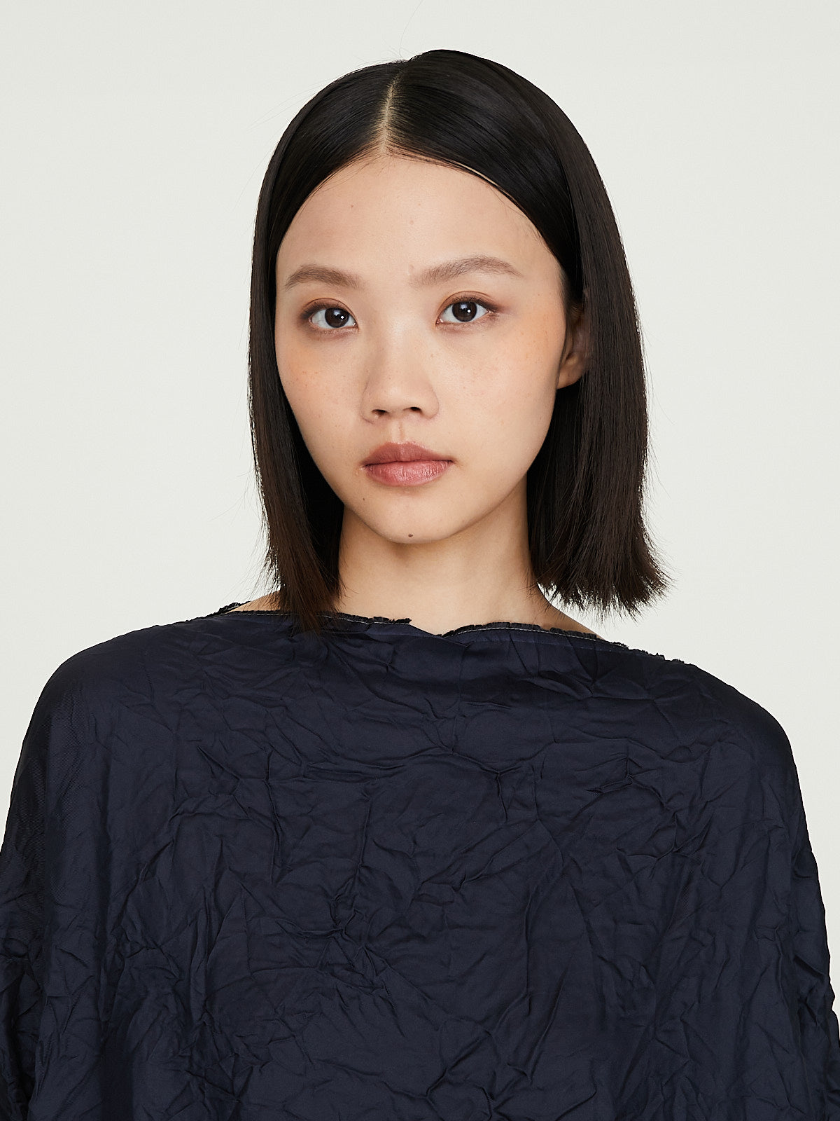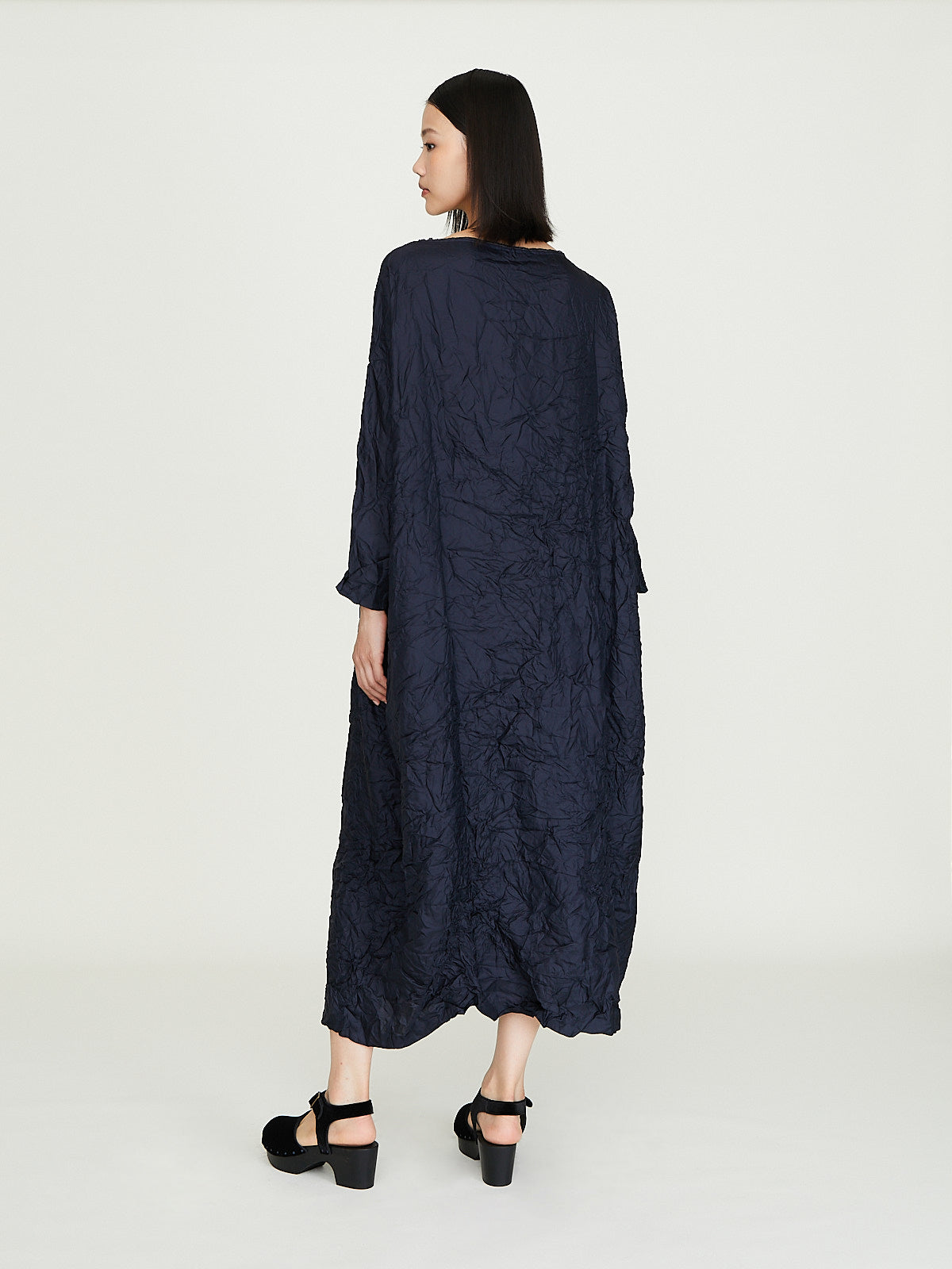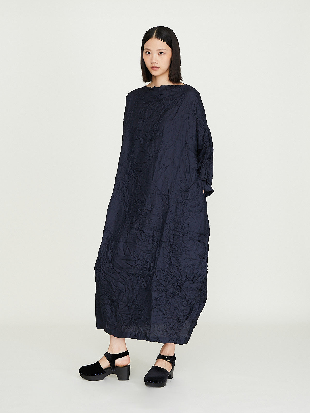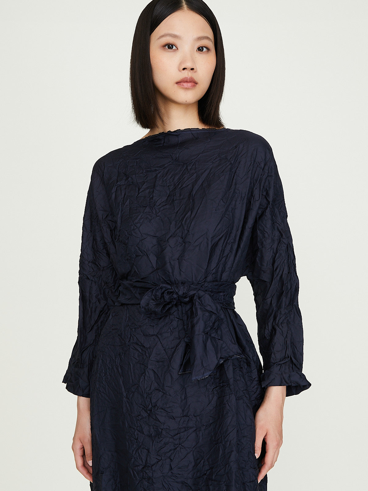Oversized dress in washed navy blue silk. Boatneck, cropped dolman sleeves and side seam pockets. Subtle cocoon silhouette. Raw edges throughout. Cinch the silhouette with the removable fabric belt.
