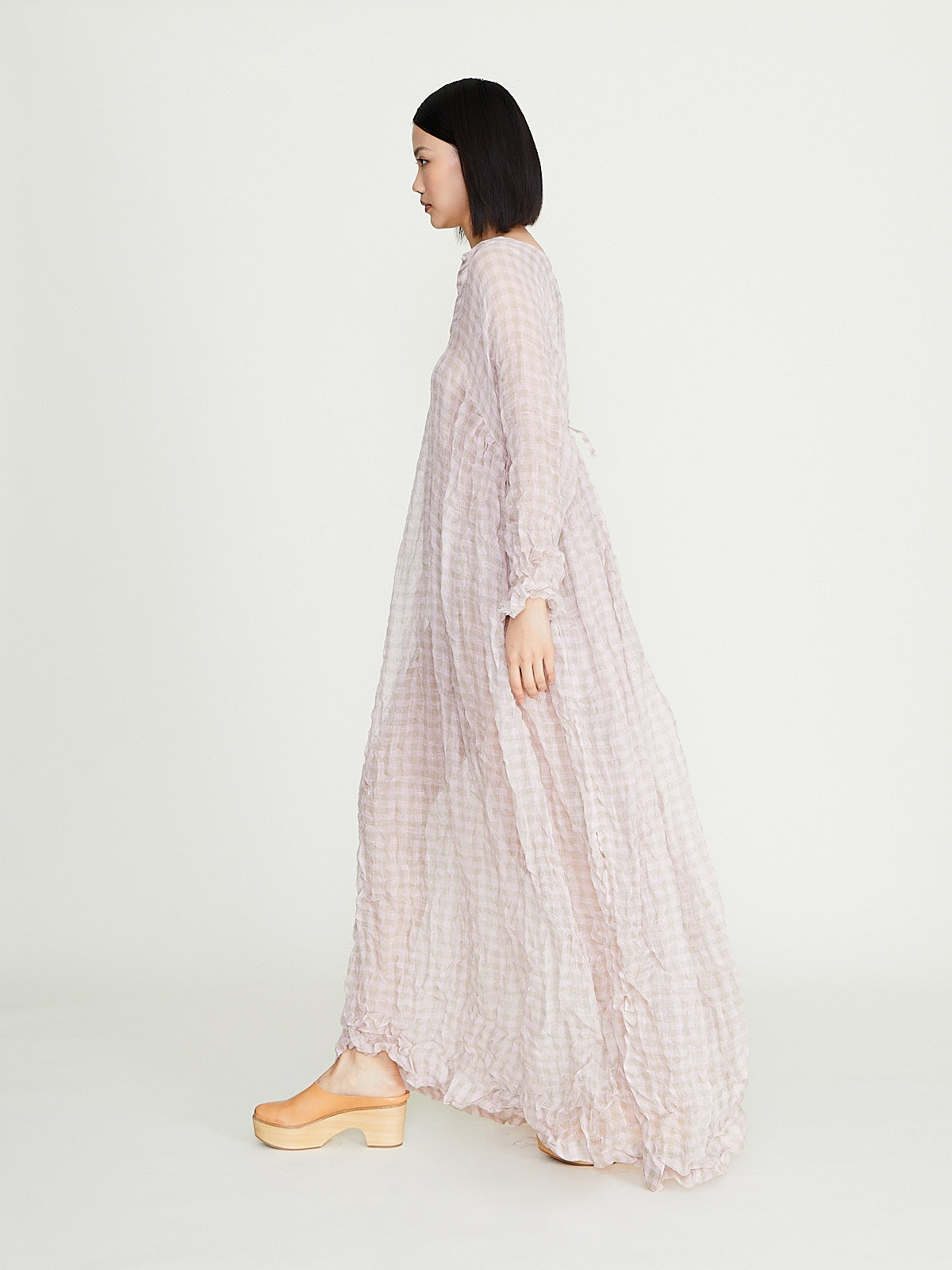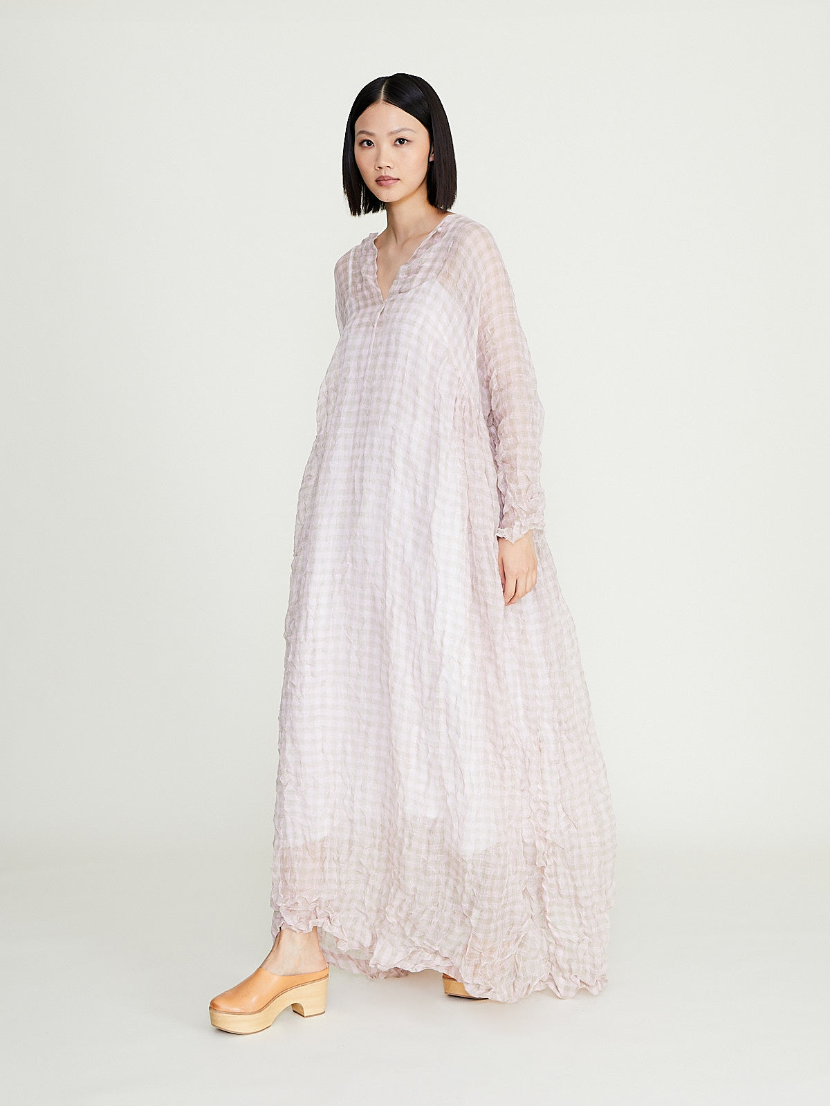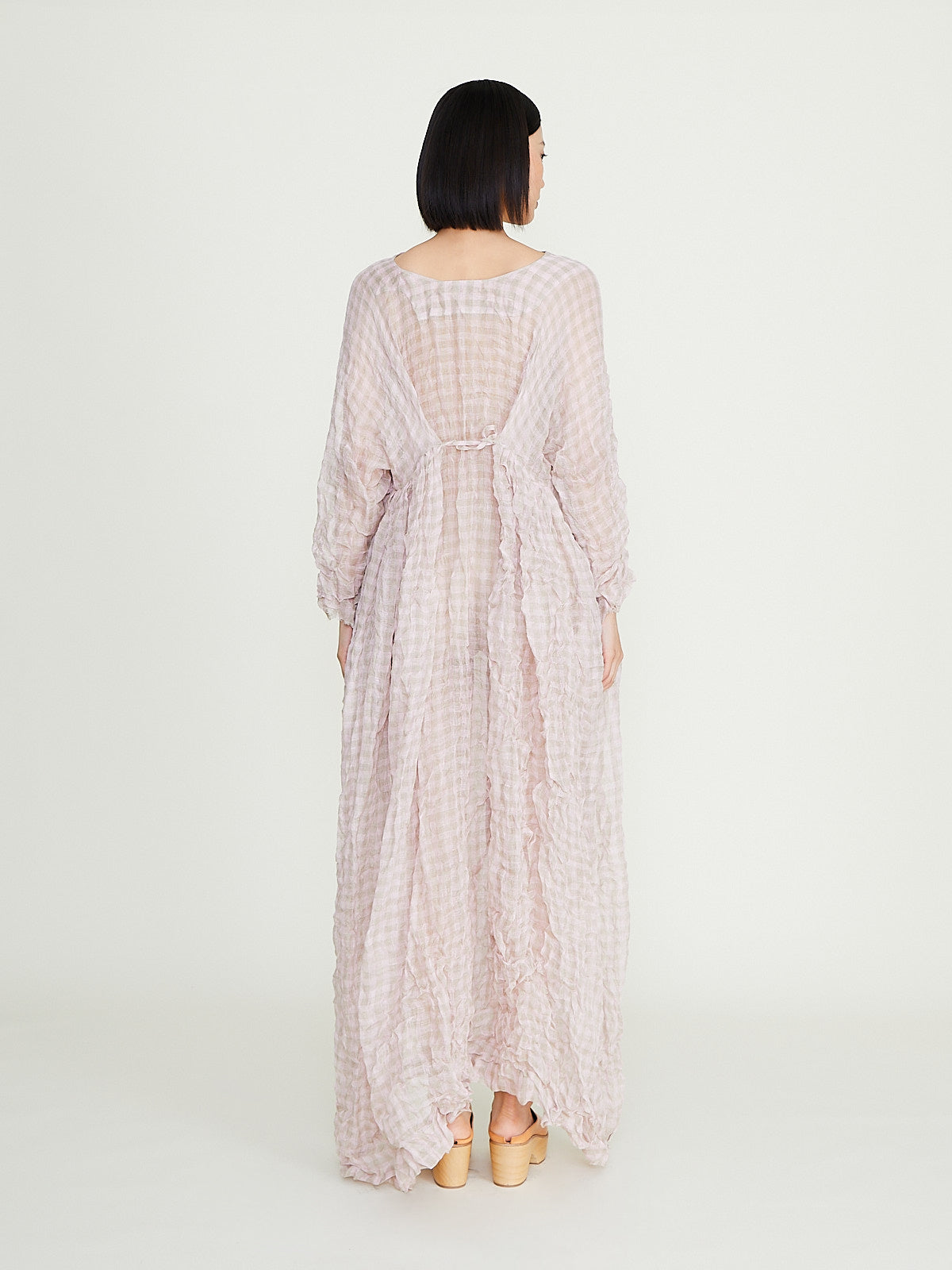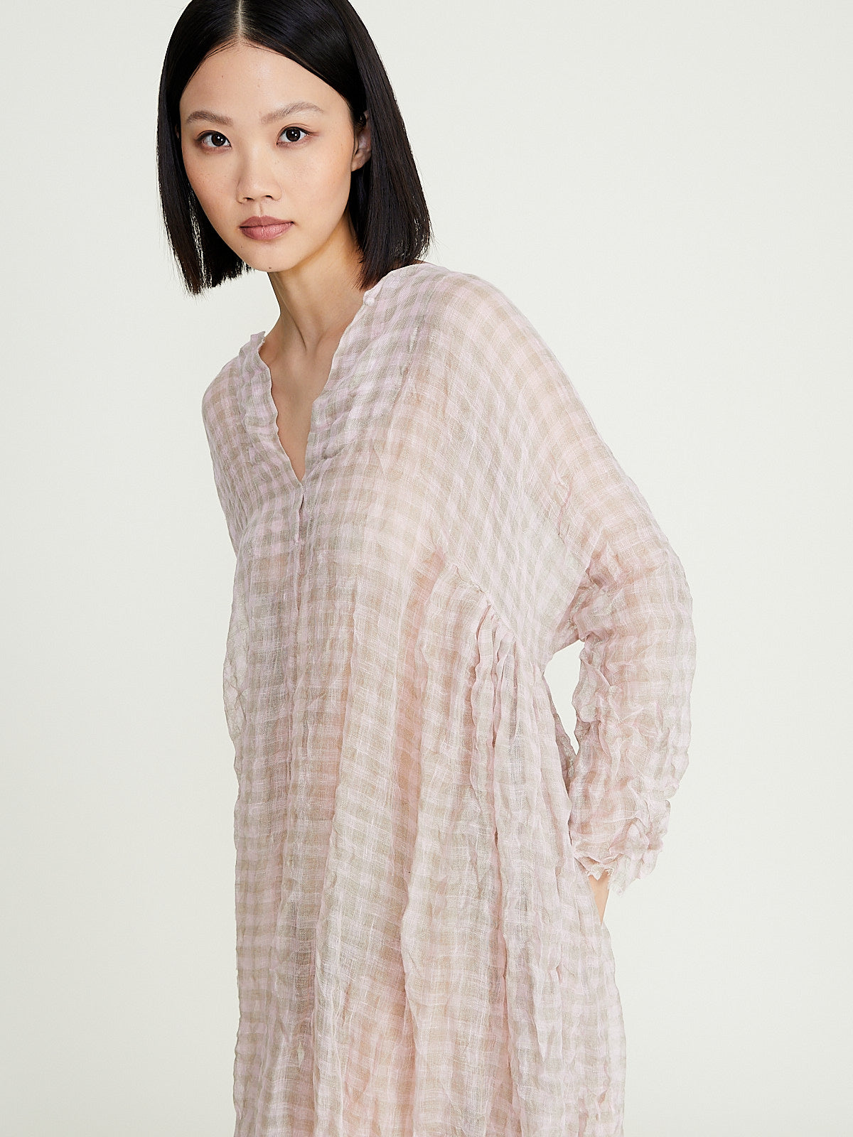 Oversized maxi dress in washed and slightly sheer checked natural/pale pink linen. Boatneck with a raw hem and 3/4 sleeves with raw cuffs. Features side seam pockets and beautiful gathering details on the sides. Thin tie fastening on one side. A-line silhouette. Can also be worn back-to-front.