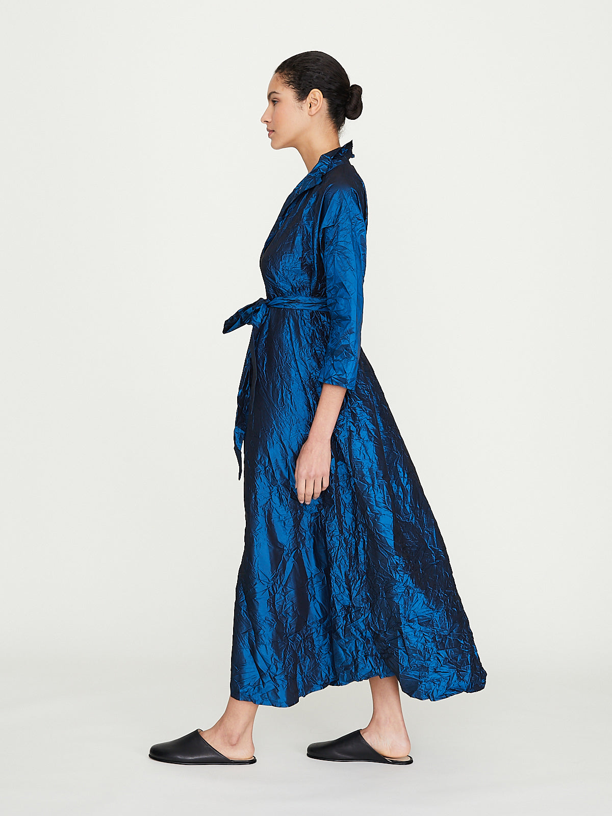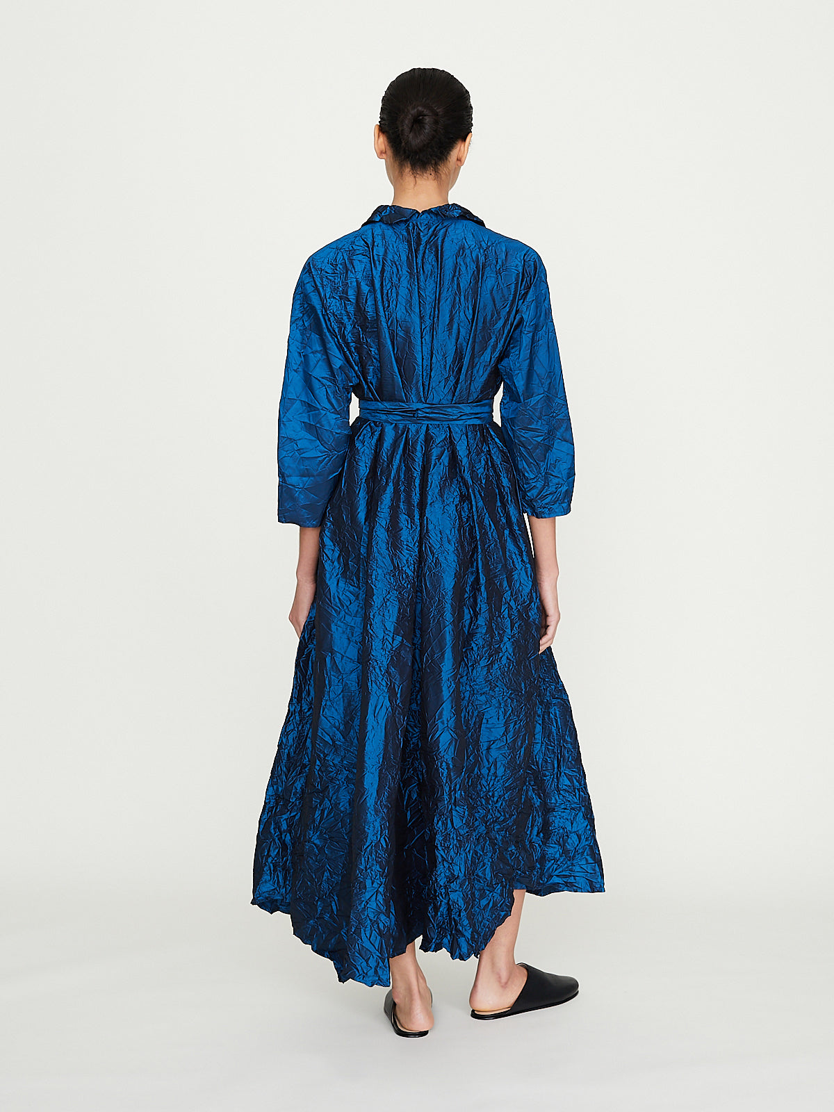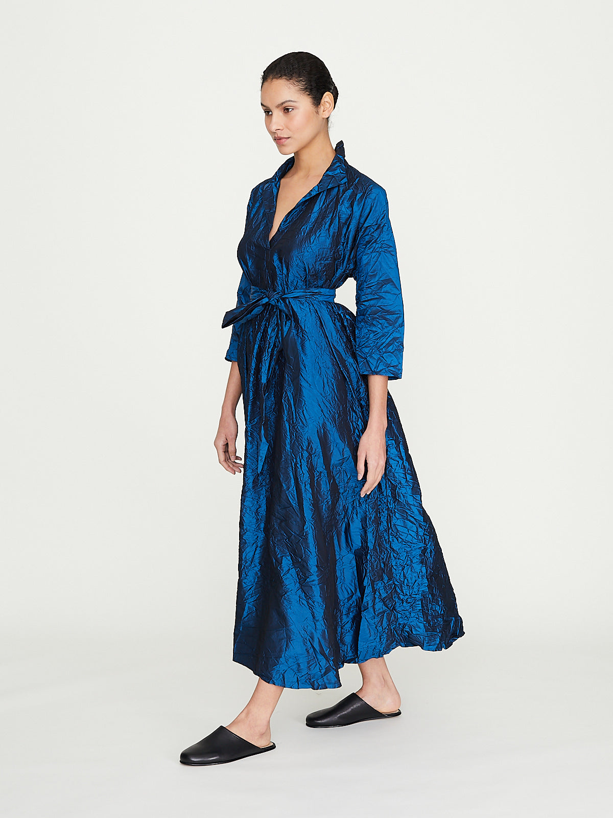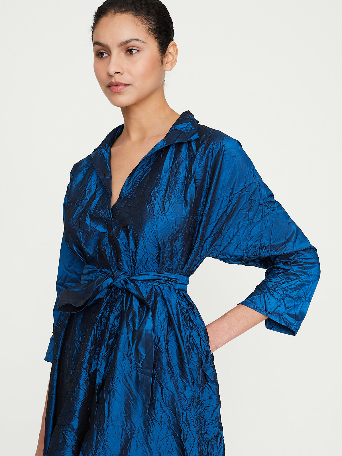 Relaxed dress in washed petrol blue silk. Open collar with a v-neckline and 3/4 dolman sleeves with raw cuffs. Pleat detail below the placket and side seam pockets. Cinch the silhouette with the removable fabric belt. Calf length.