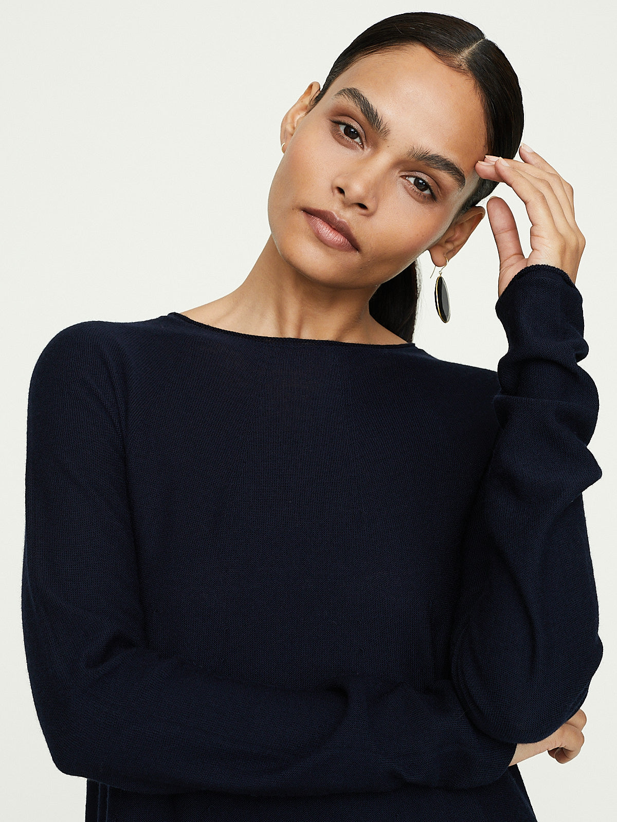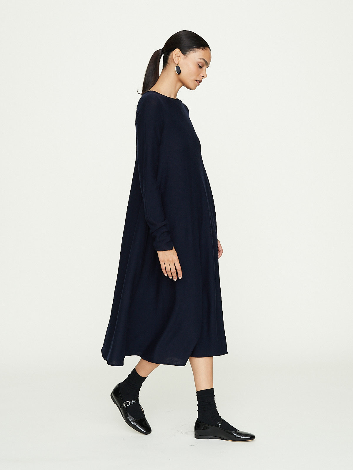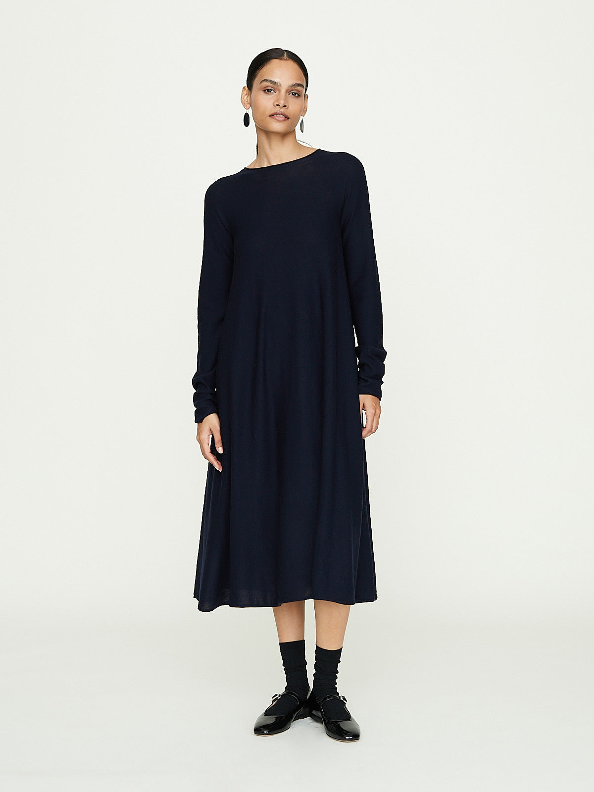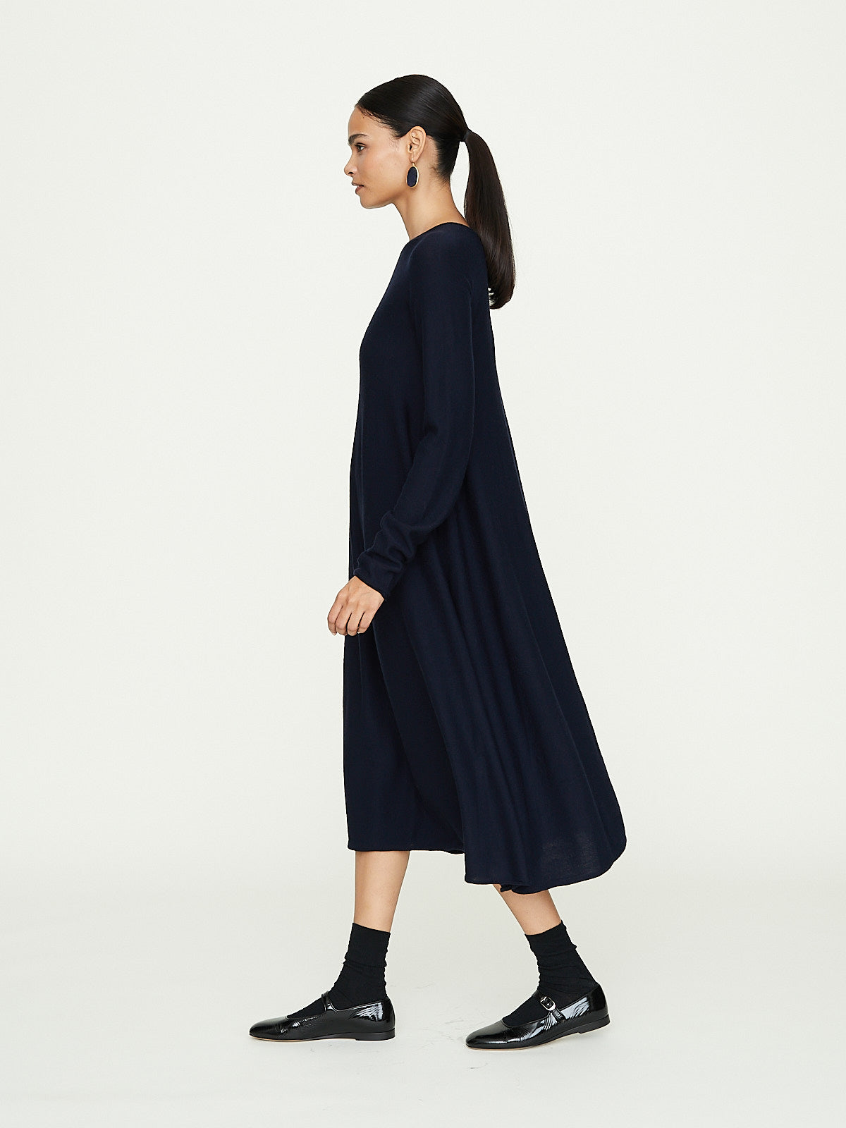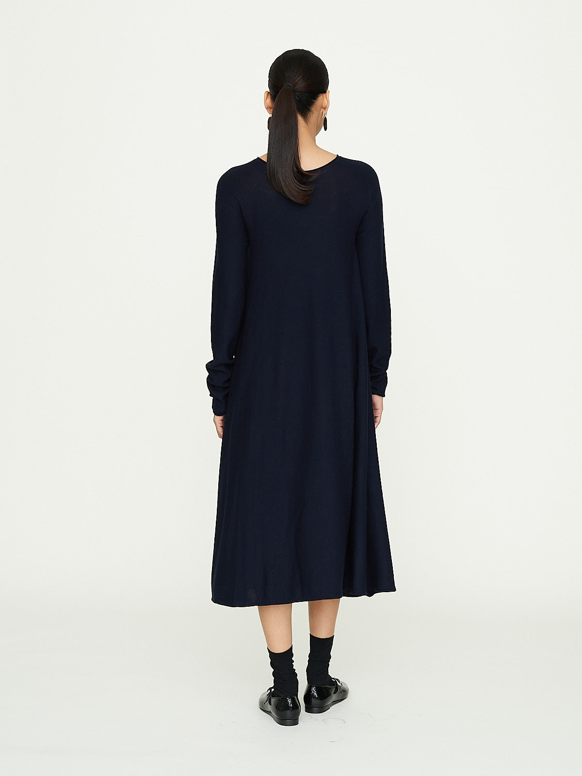 Knitted dress in navy blue wool. Round neckline and long sleeves. A-line skirt. Cuts below-the-knee.