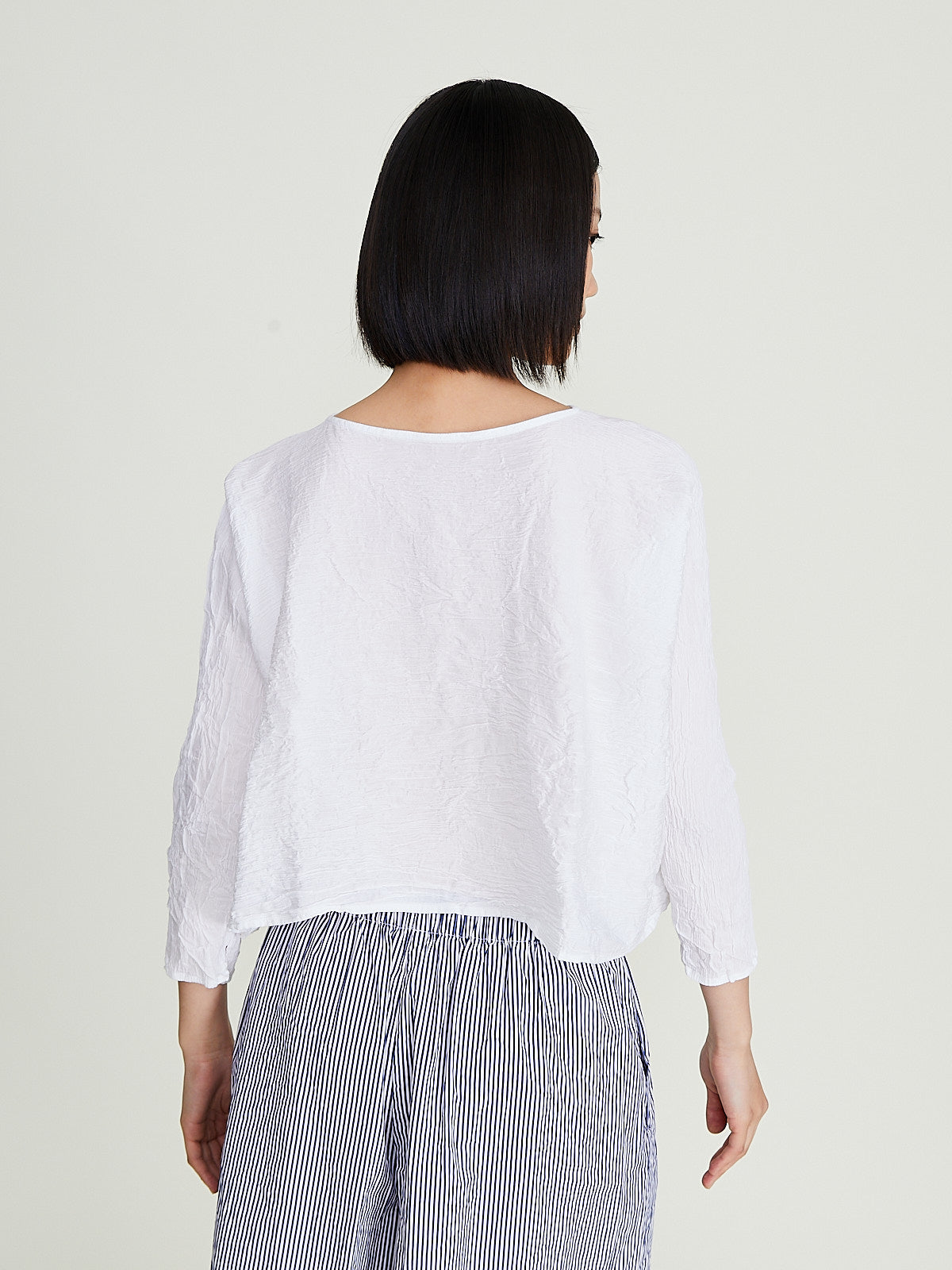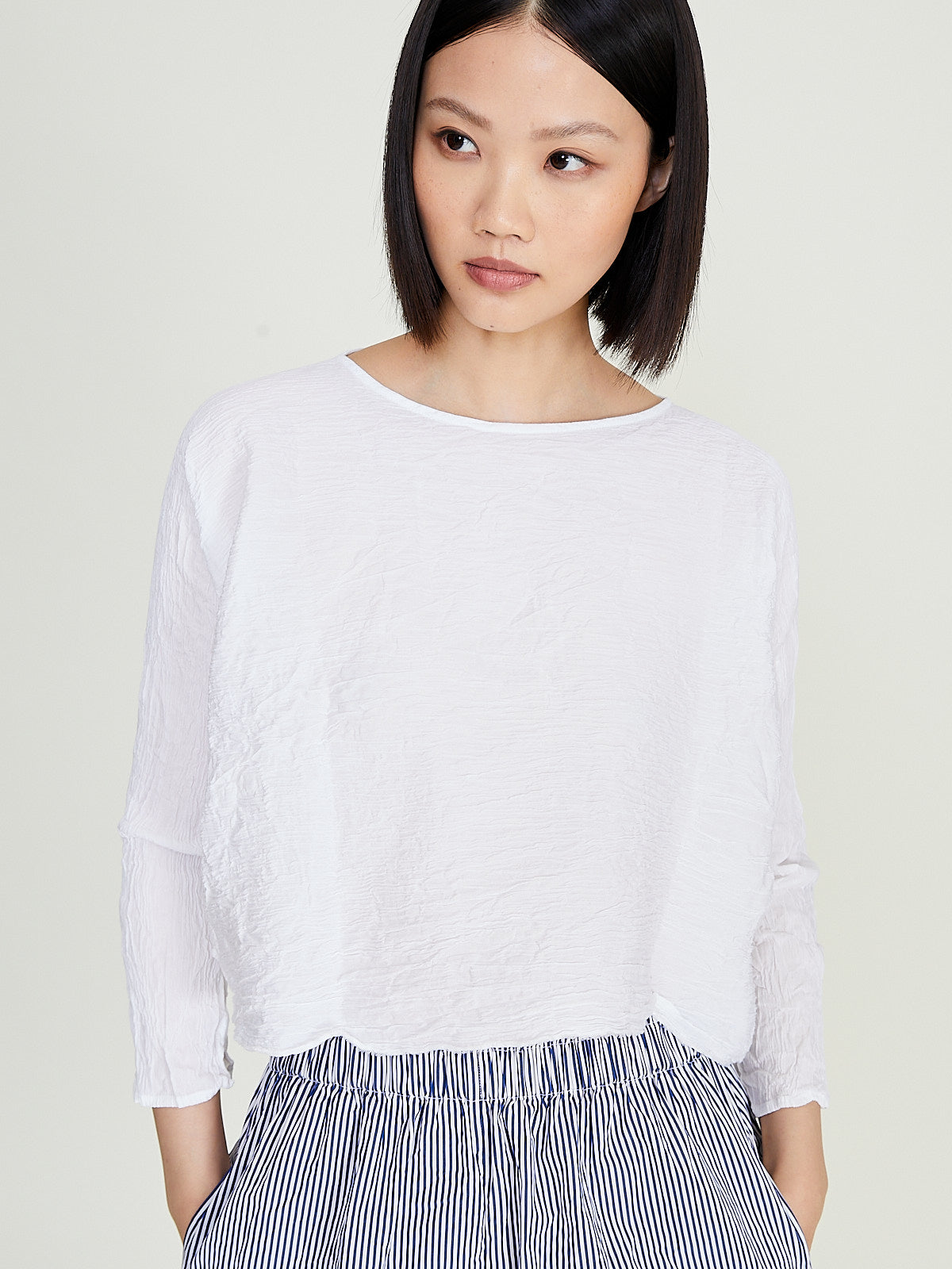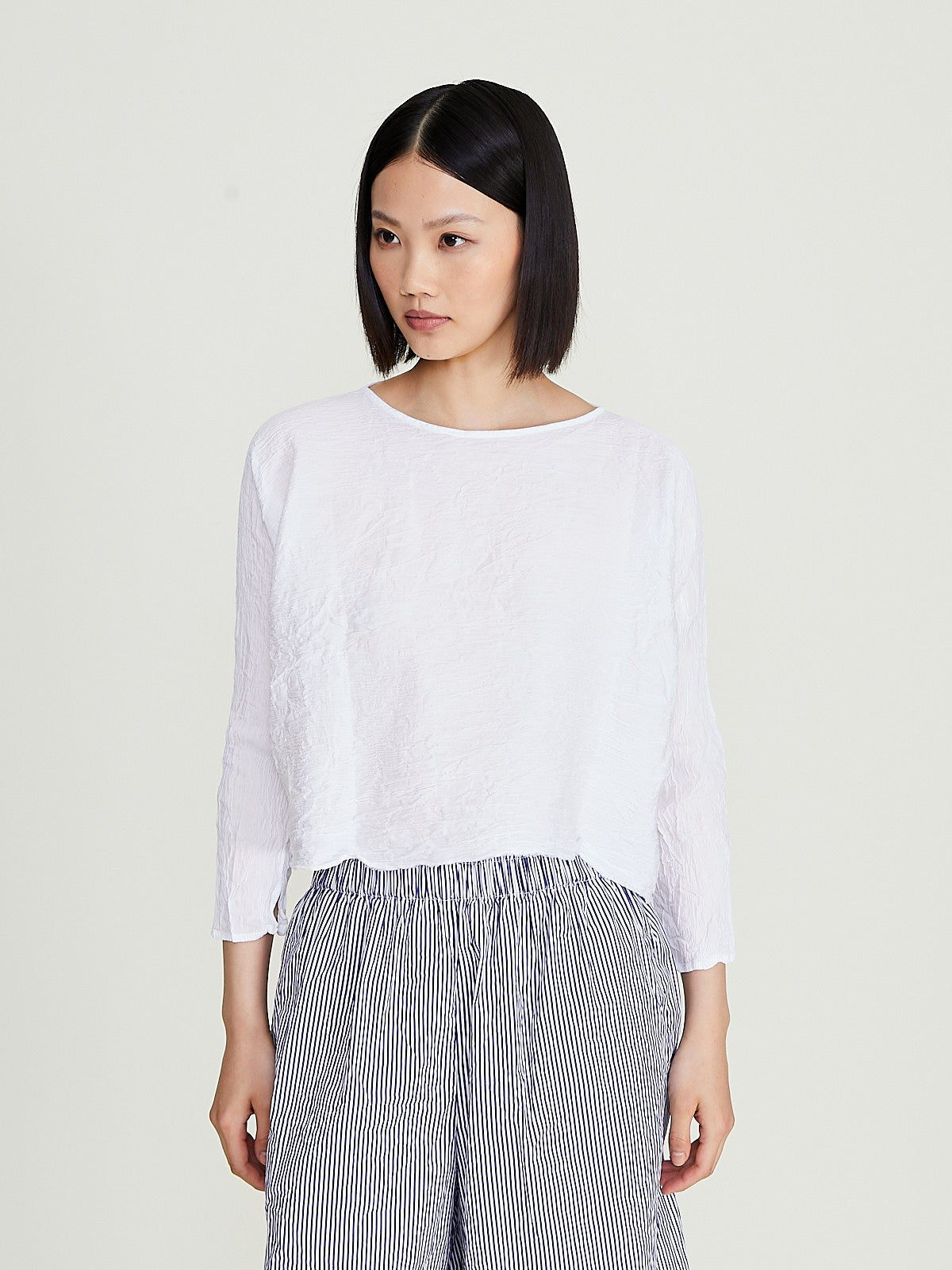 Cropped top in washed white cotton. Wide round neckline and 3/4 dolman sleeves. Cinch the silhouette with the removable fabric belt. Boxy fit.