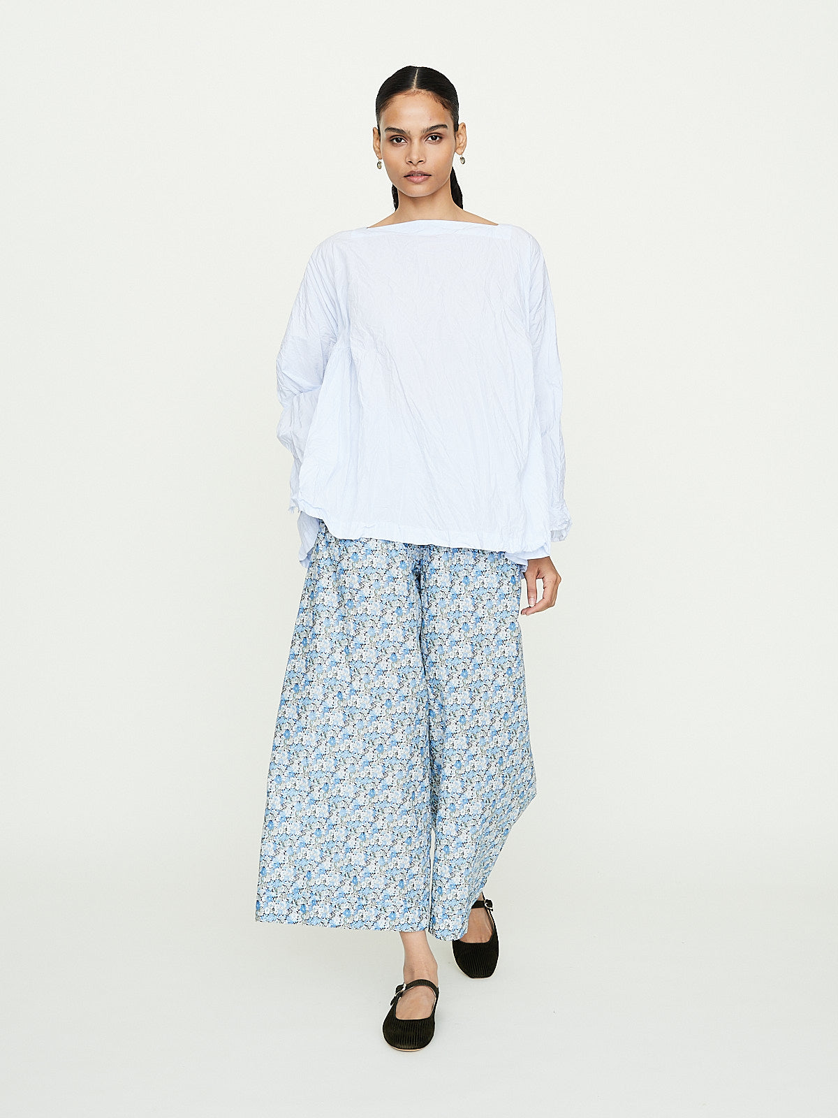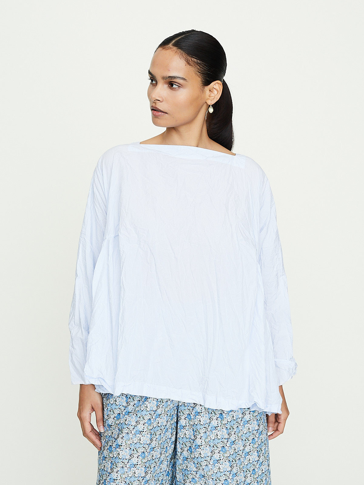 Oversized shirt in washed pale blue micro-checked cotton. Boatneck, 3/4 sleeves and with beautiful gathering details on the sides. Features side seam pockets and a thin tie detail on one side. A-line silhouette. Can also be worn front-to-back.