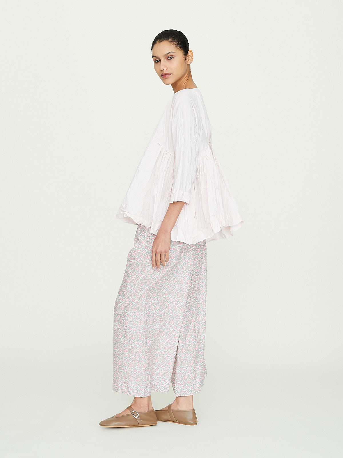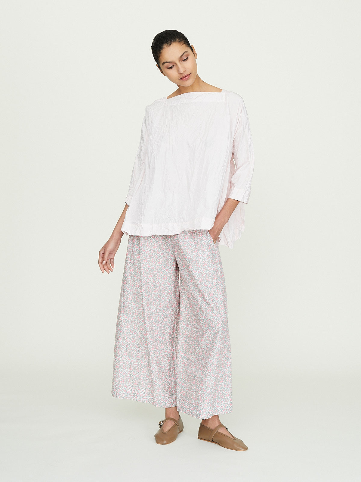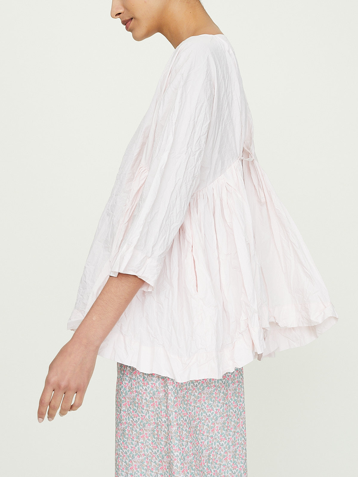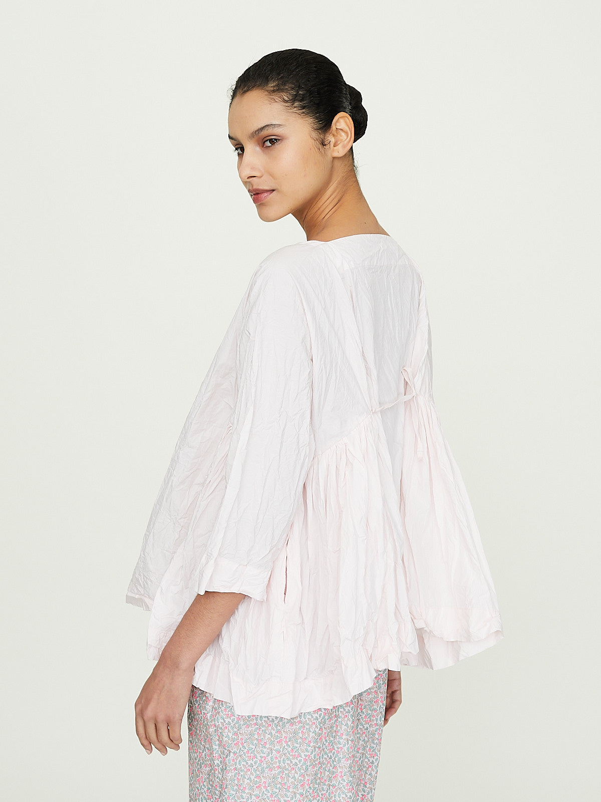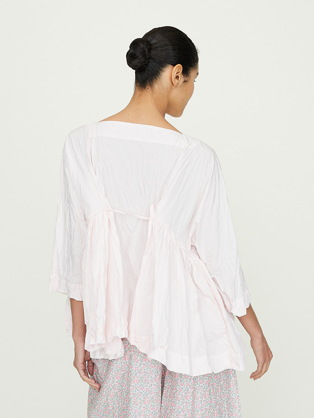 Oversized shirt in washed pale pink cotton. Boatneck, 3/4 sleeves and with beautiful gathering details on the sides. Features side seam pockets and a thin tie detail on one side. A-line silhouette. Can also be worn front-to-back.
