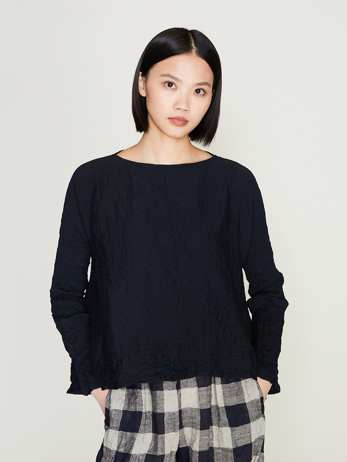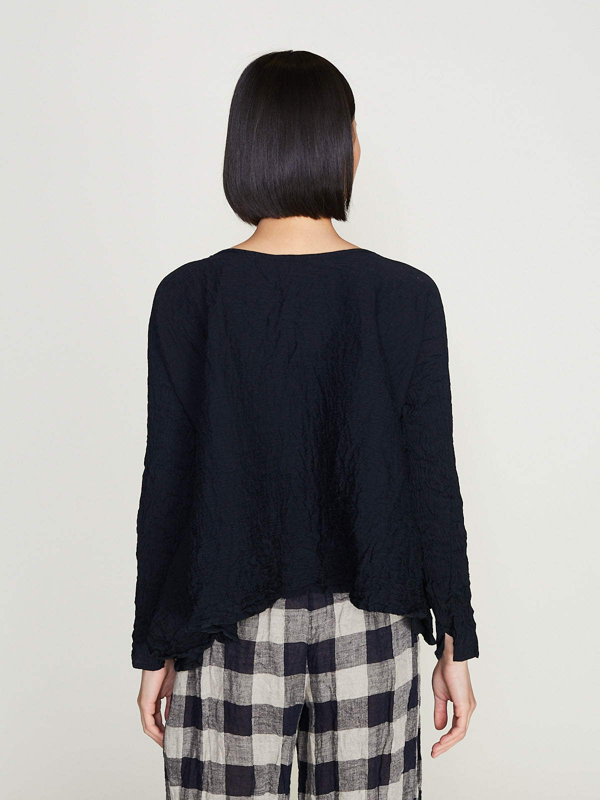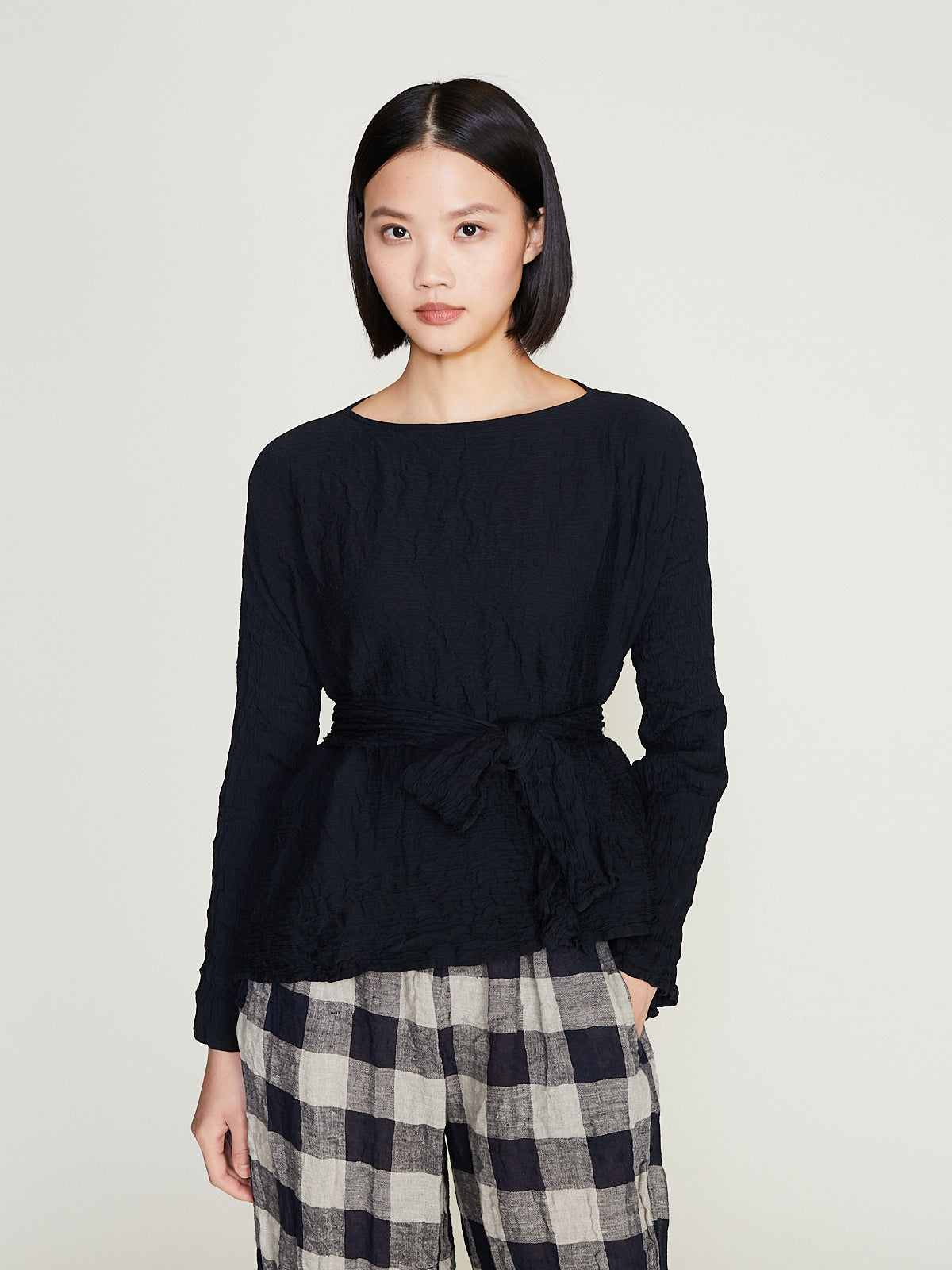 Relaxed top in washed black cotton. Wide round neckline and cropped dolman sleeves. Cinch the silhouette with the matching fabric belt. Subtle a-line silhouette. Curved hemline on the back.