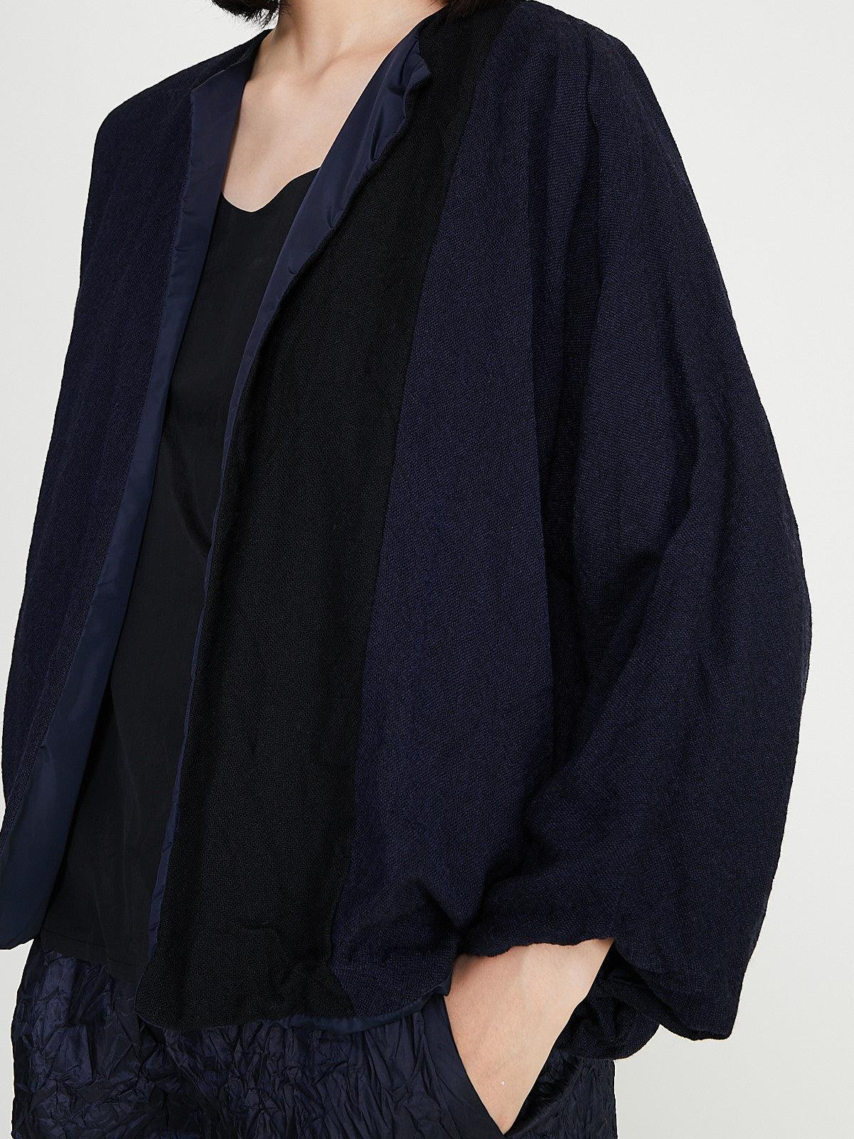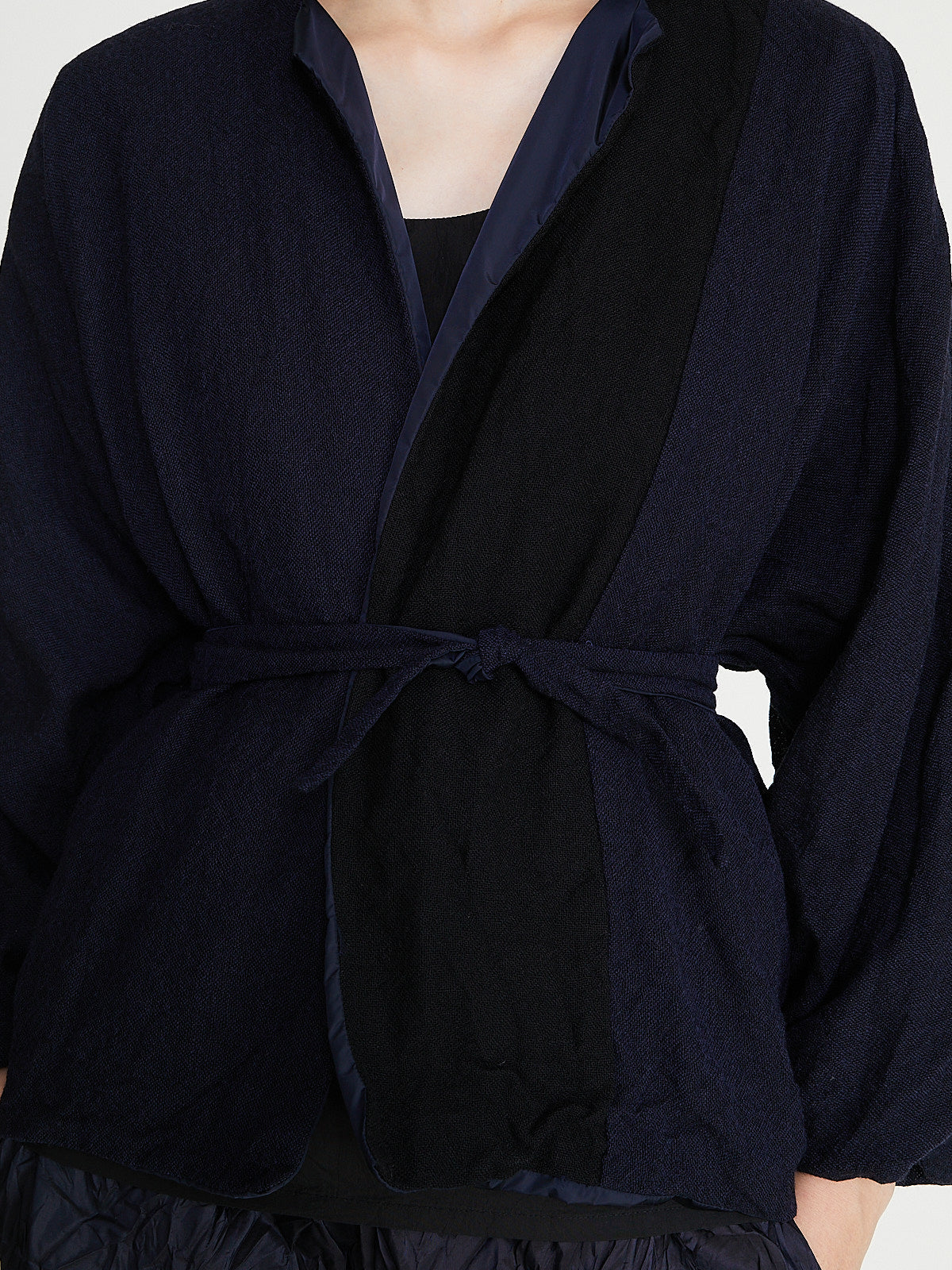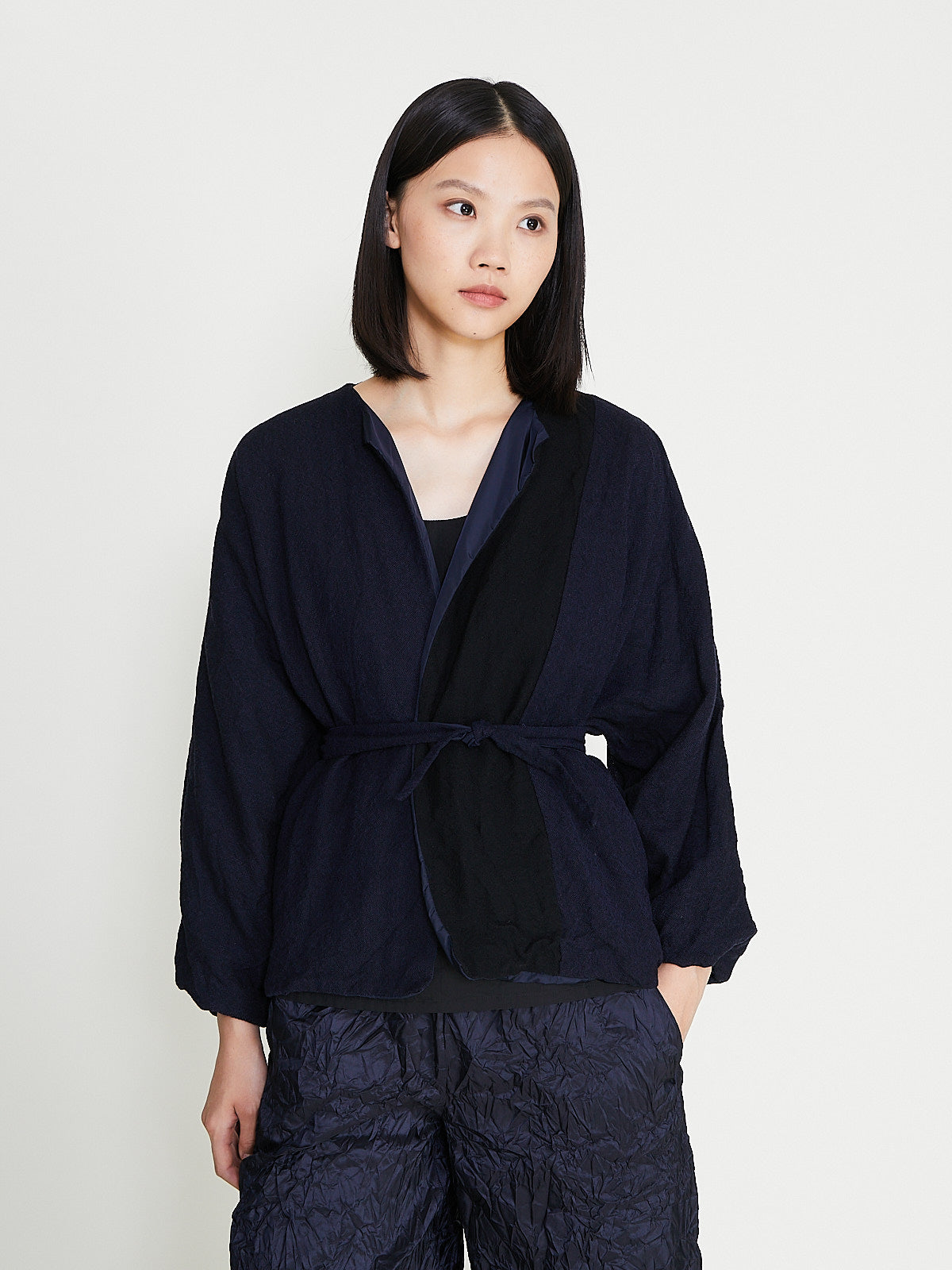 Boxy reversible jacket that is washed dark blue wool on one side that has a darker panel on the front. The other side is navy polyethylene. Round neckline, open front and bracelet sleeves with a dropped shoulder. Side seam pockets. Cinch the silhouette with the removable fabric belt.