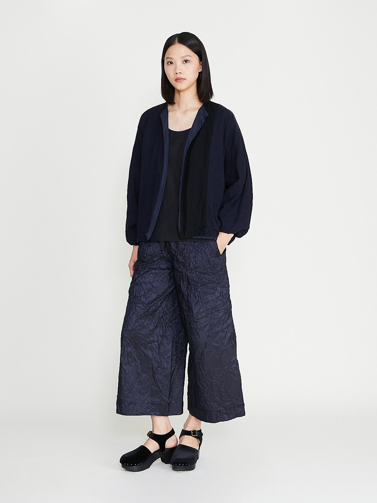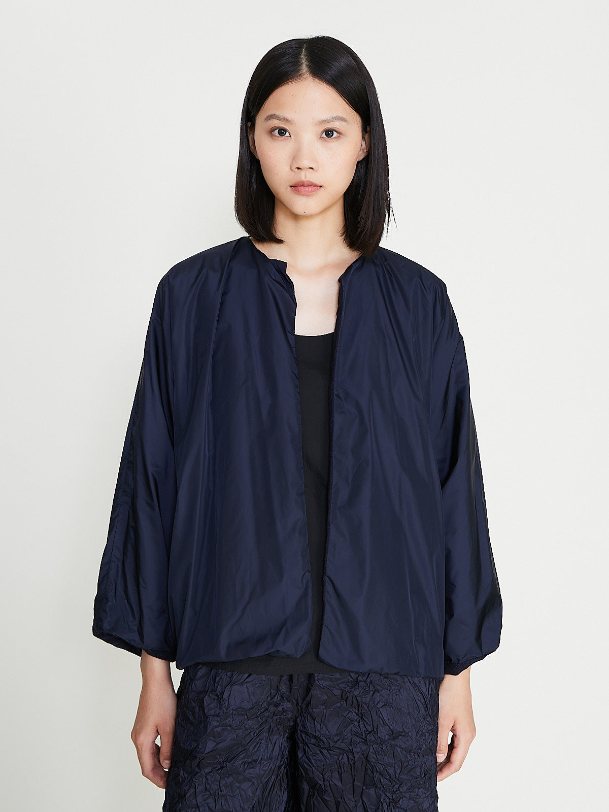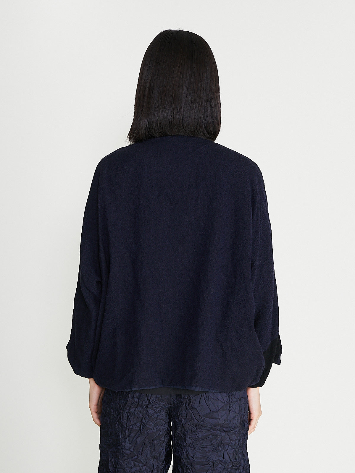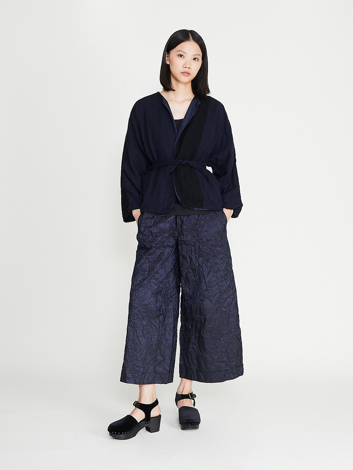 Boxy reversible jacket that is washed dark blue wool on one side that has a darker panel on the front. The other side is navy polyethylene. Round neckline, open front and bracelet sleeves with a dropped shoulder. Side seam pockets. Cinch the silhouette with the removable fabric belt.