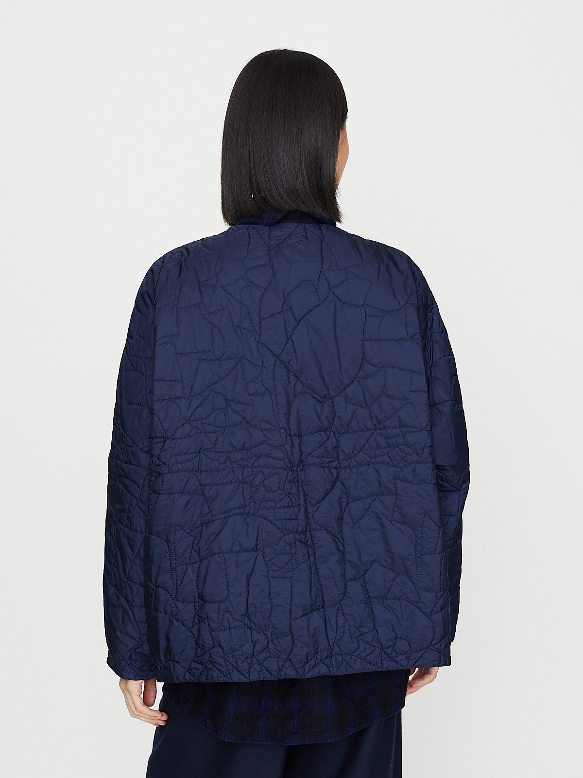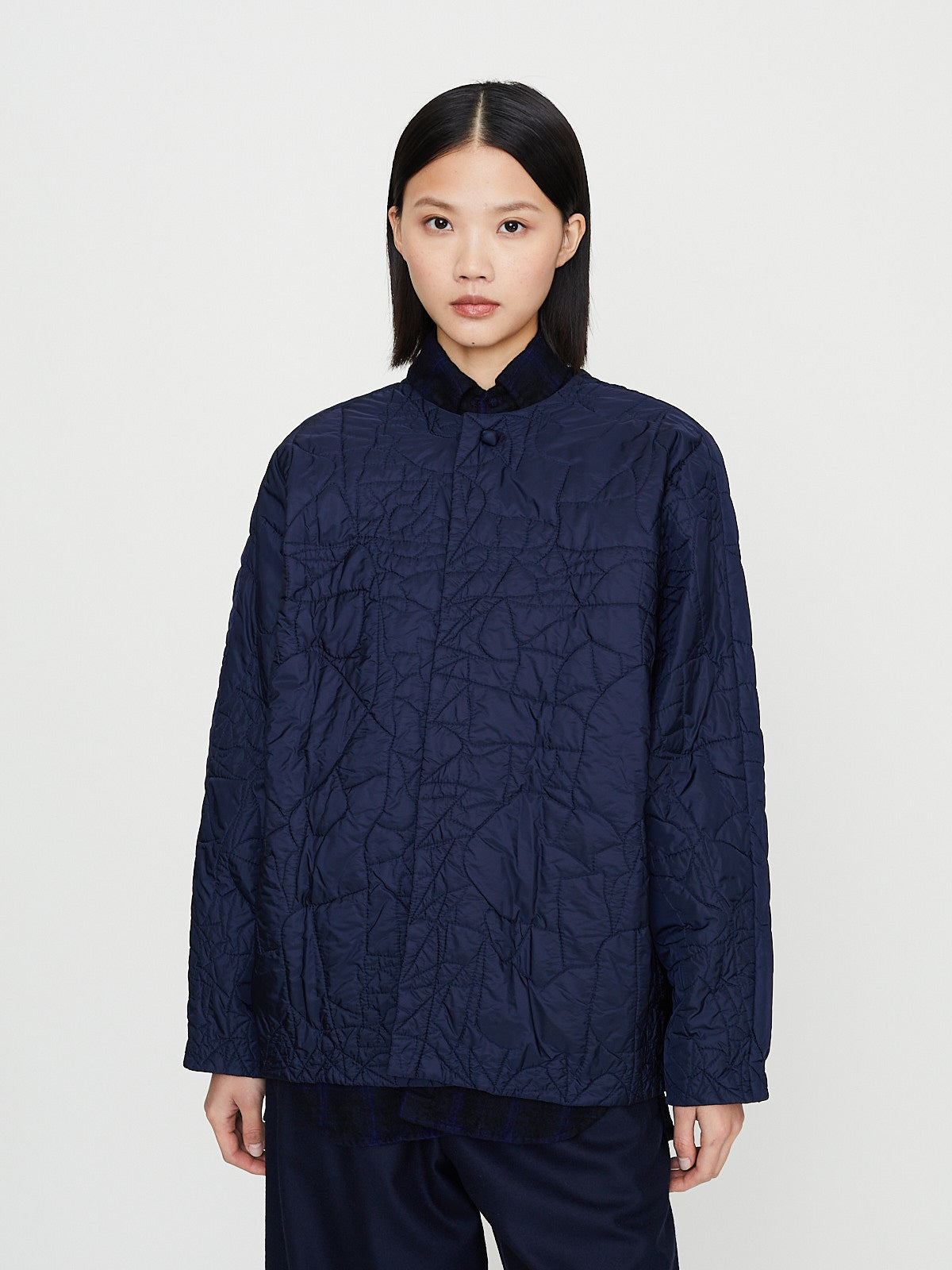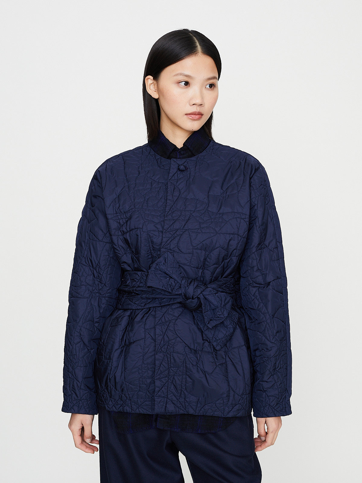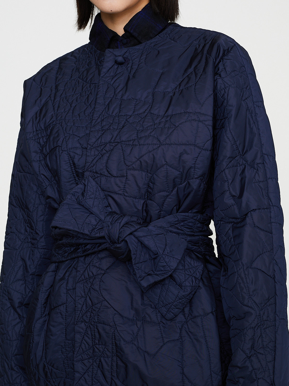 Boxy quilted jacket in washed dark blue polyamide. Collarless, single button fastening at the neck and long sleeves. Side seam pockets. Cinch the silhouette with the removable fabric belt.