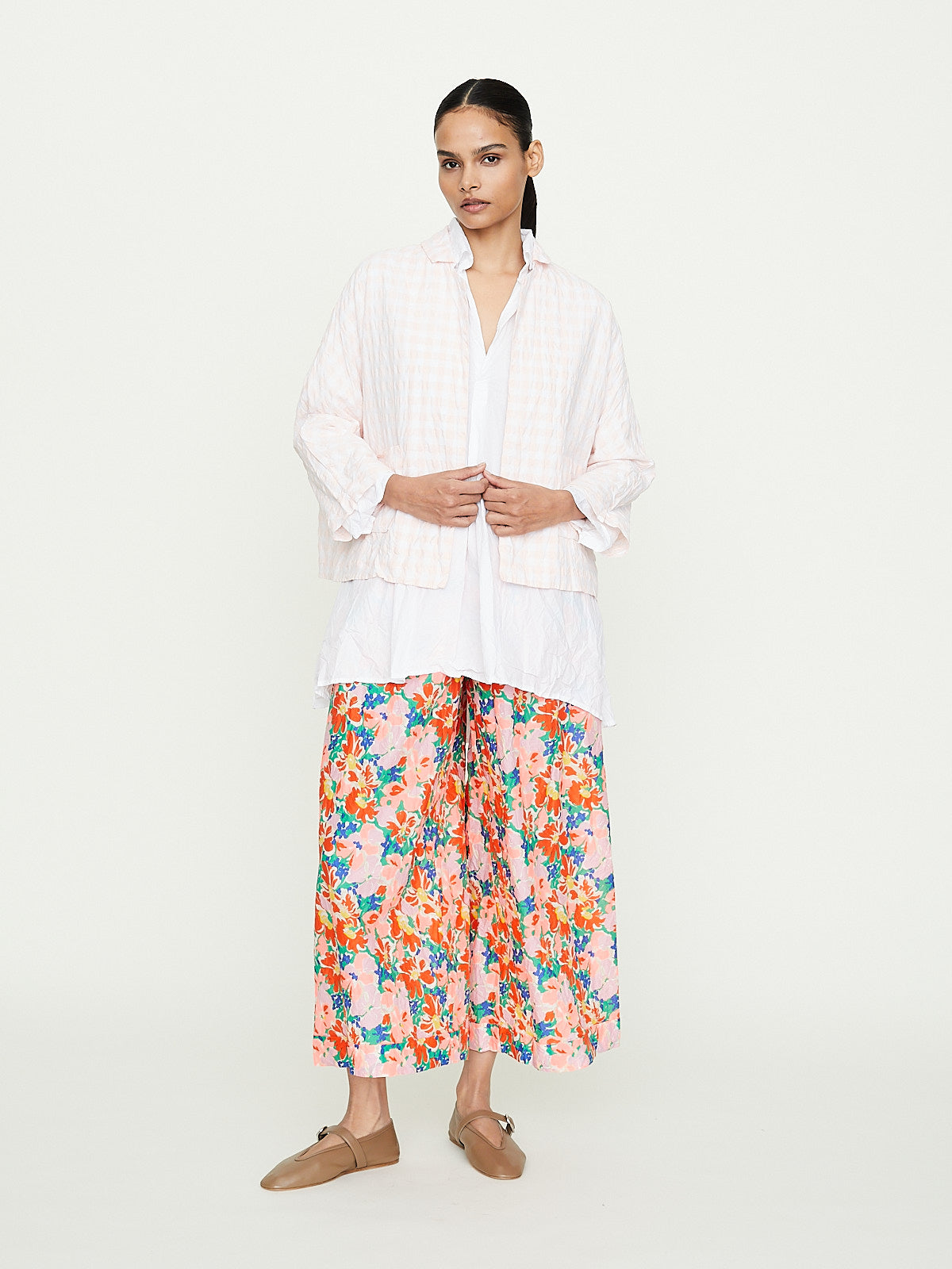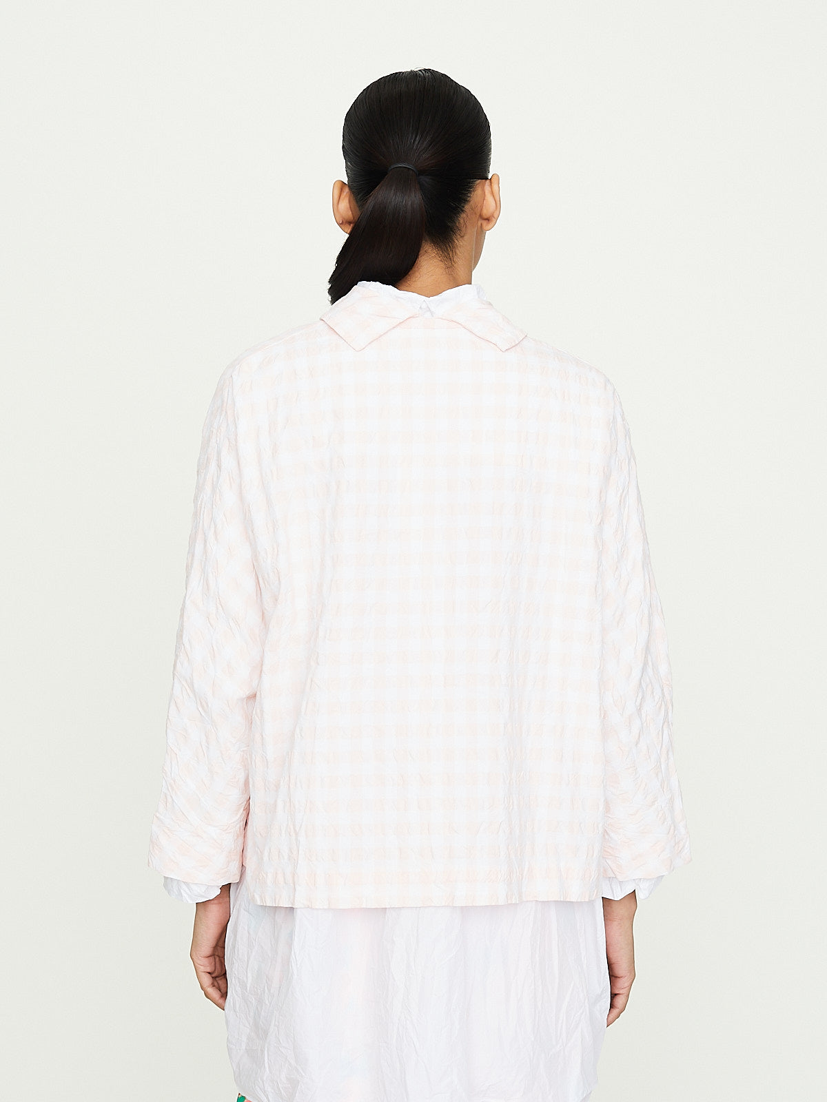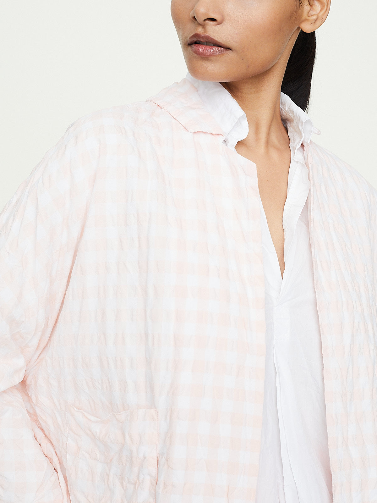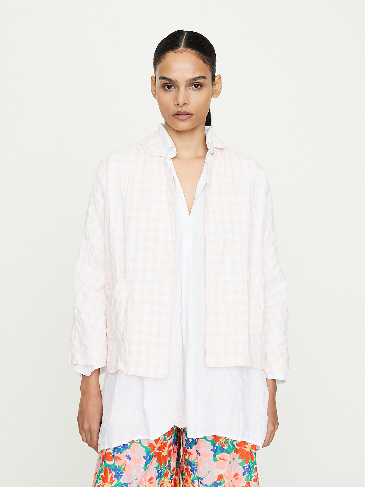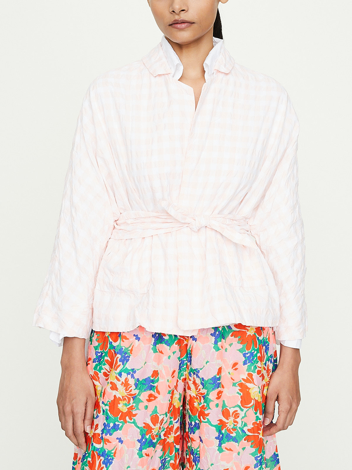 Boxy jacket in a washed checked white/pale pink seersucker cotton. Open front, convertible collar and cropped sleeves with slits at the cuffs. Patch pockets on the front. Cinch the silhouette with the removable fabric belt. 1cm checks.
