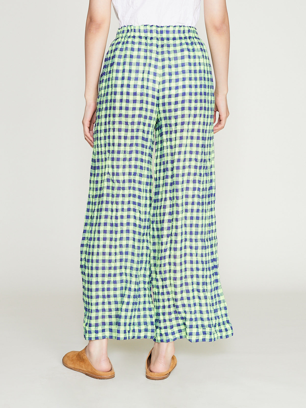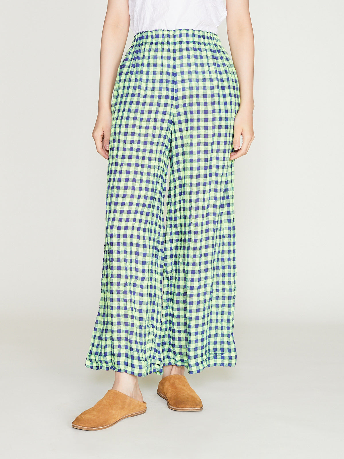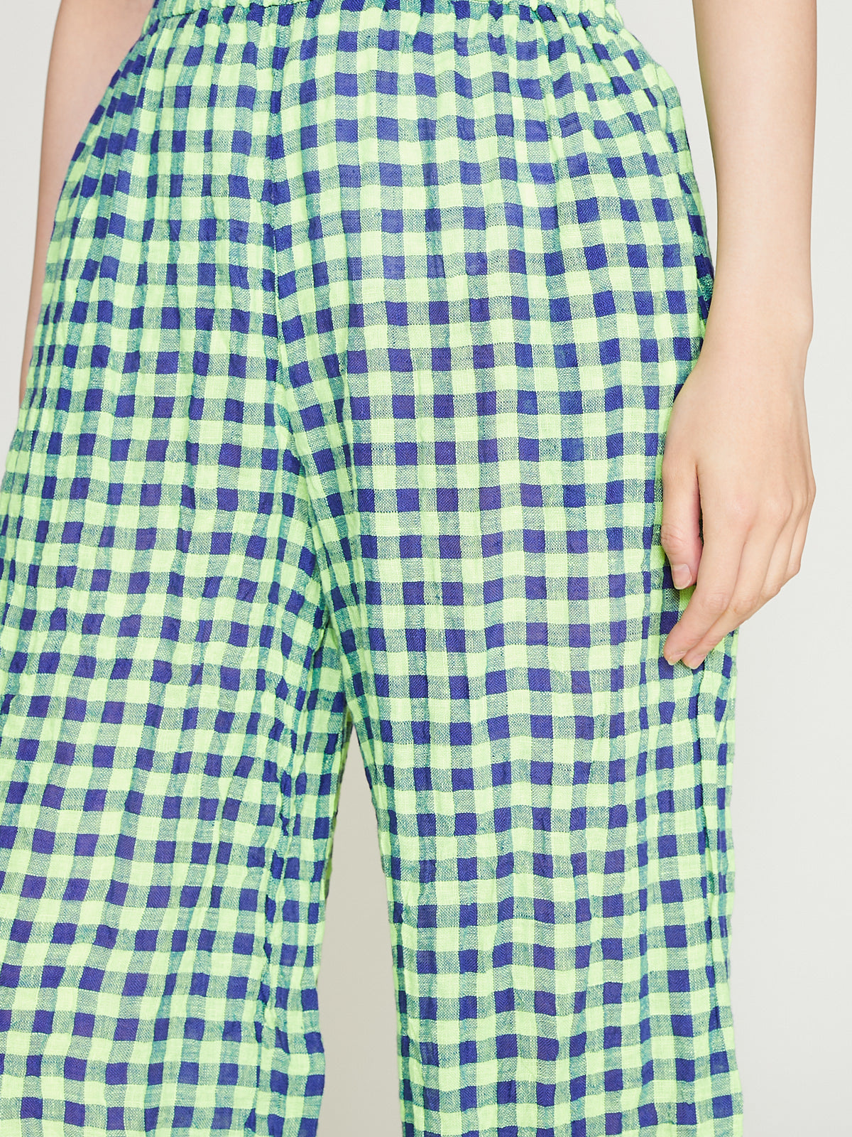 Relaxed trouser in blue/neon yellow checked linen. Pull-on stye with an elasticated waistband and side seam pockets. Wide straight legs and turned-up cuffs. 1cm checks.