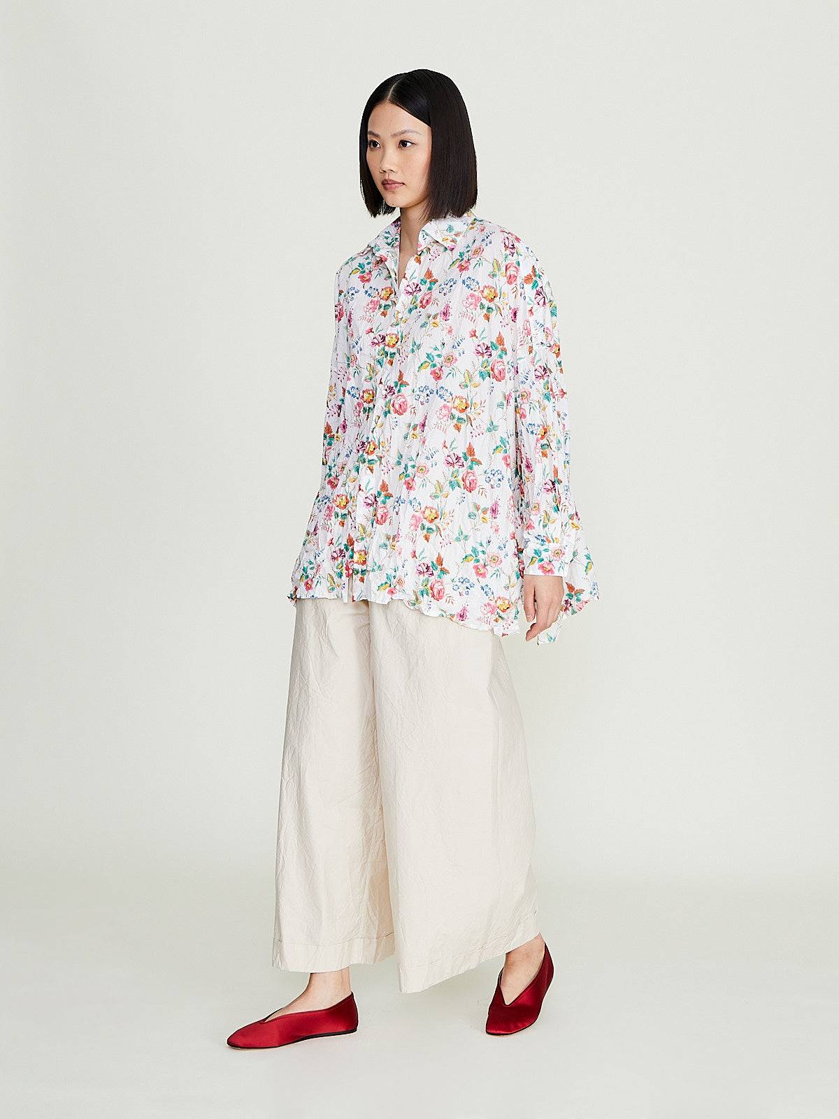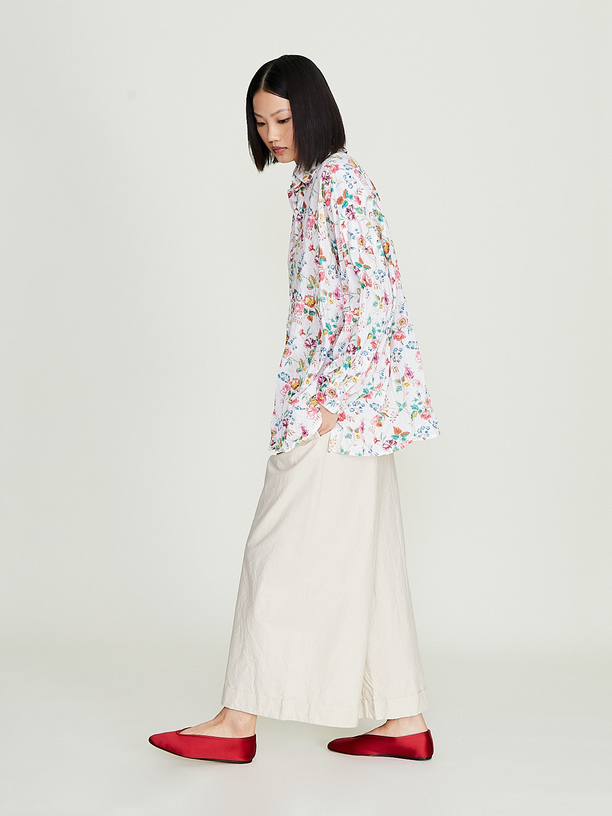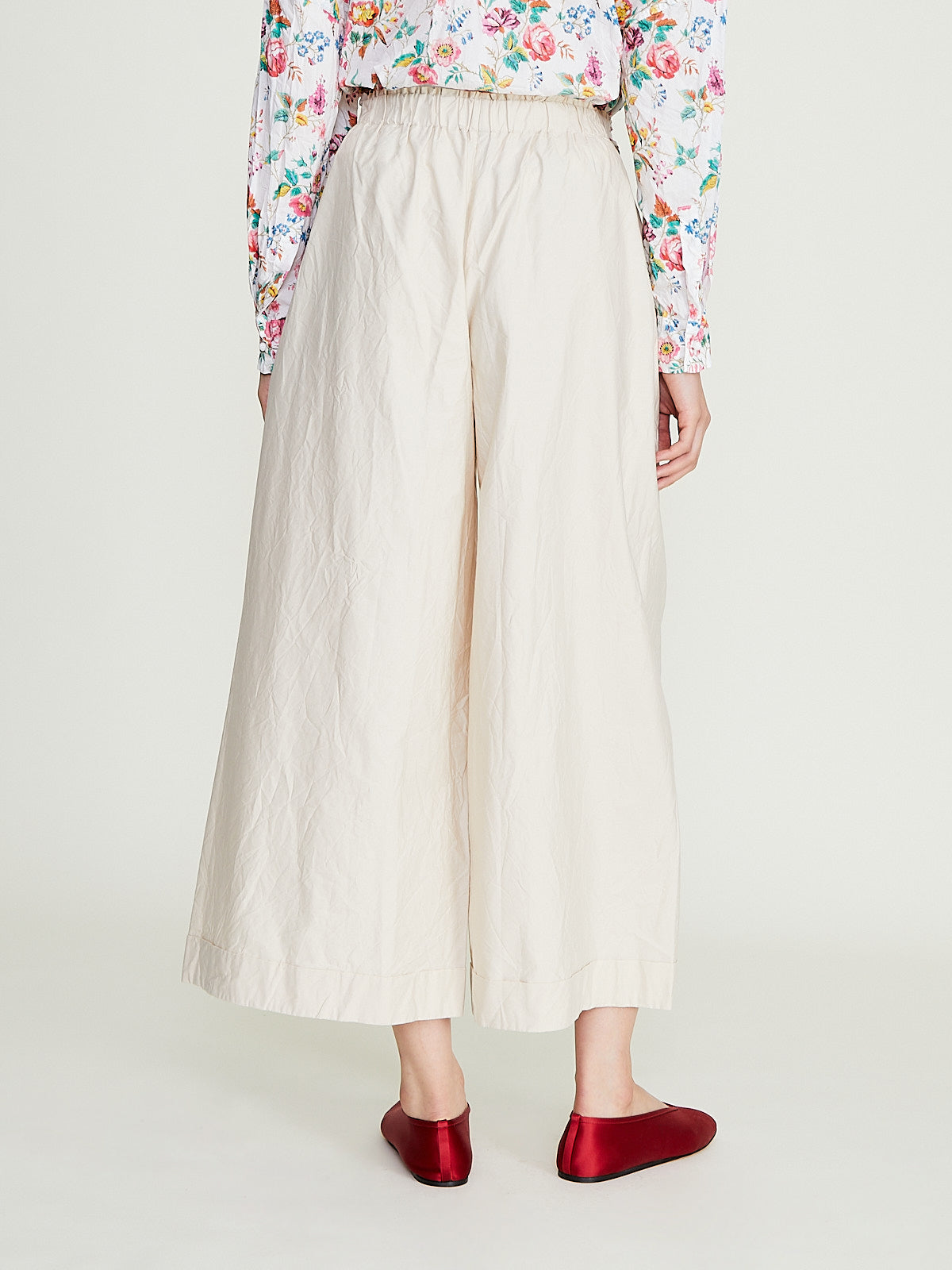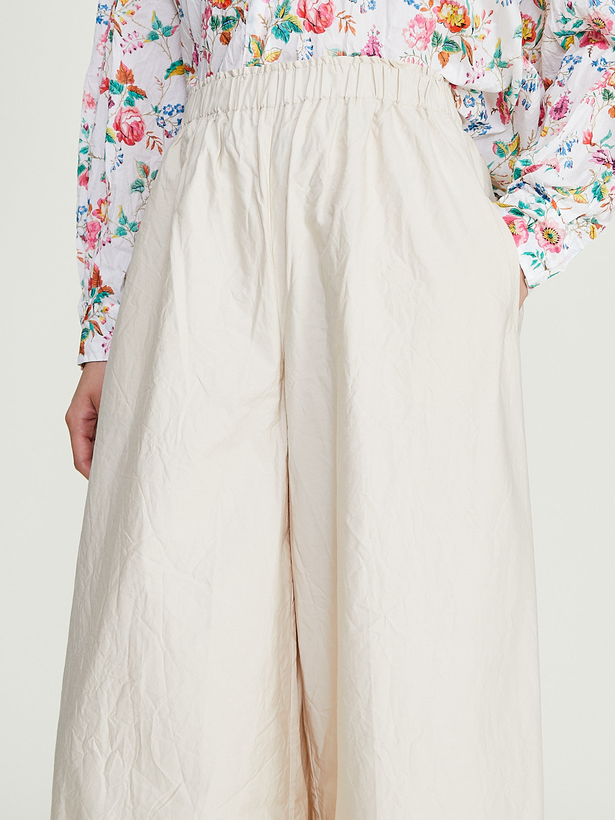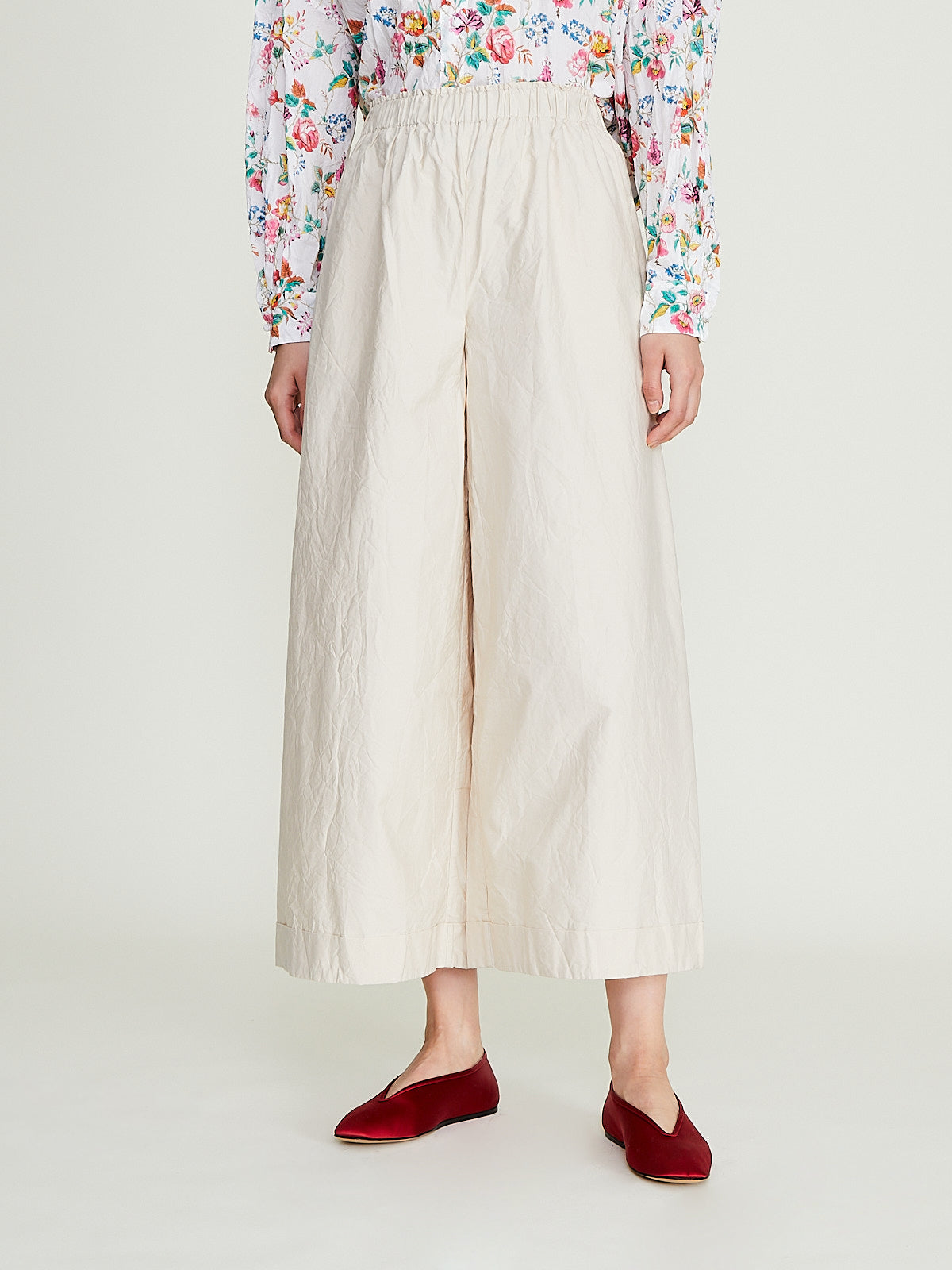Culotte-style trouser in washed cream cotton. Pull-on style with an elasticated waistband and side seam pockets. Turned-up cuff.