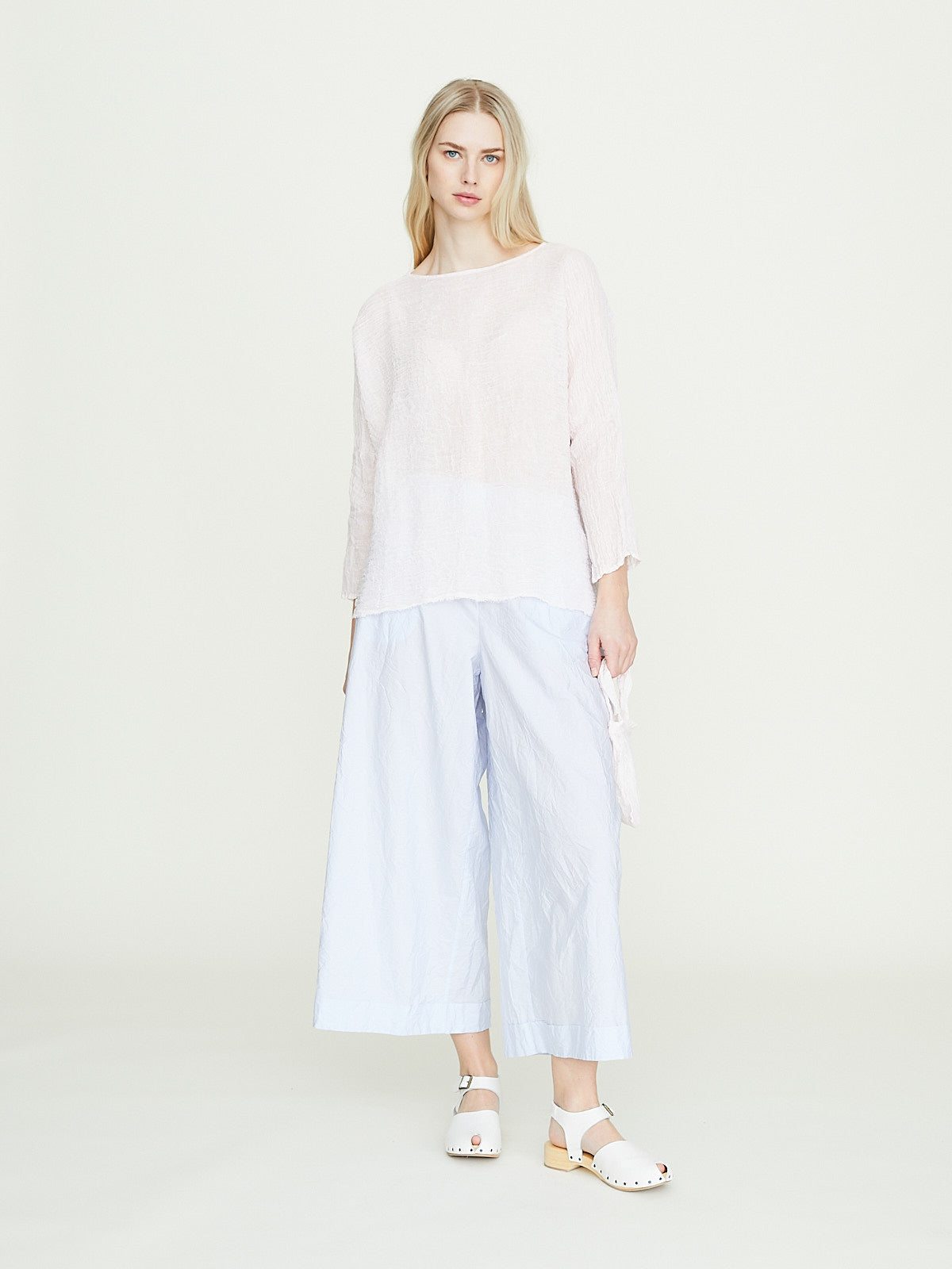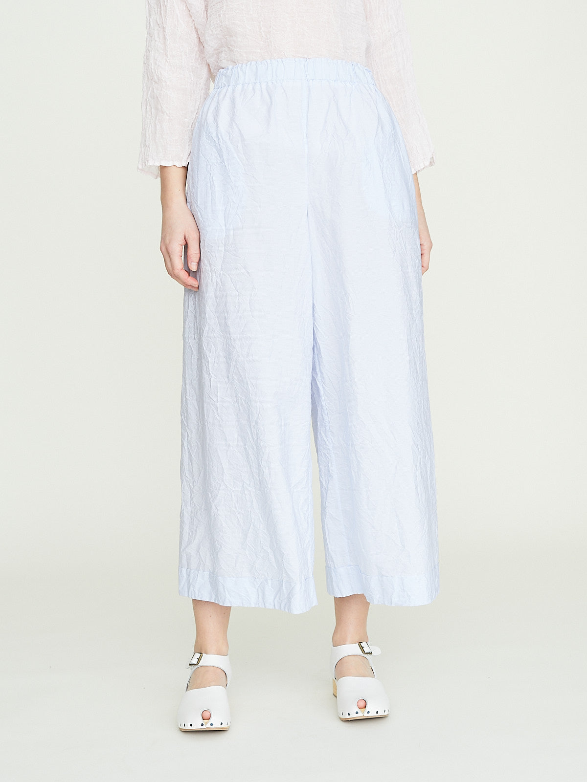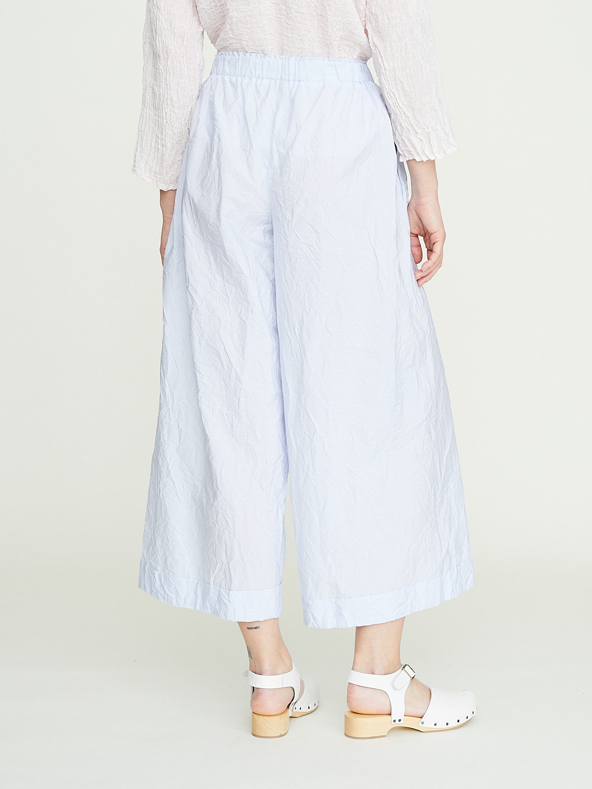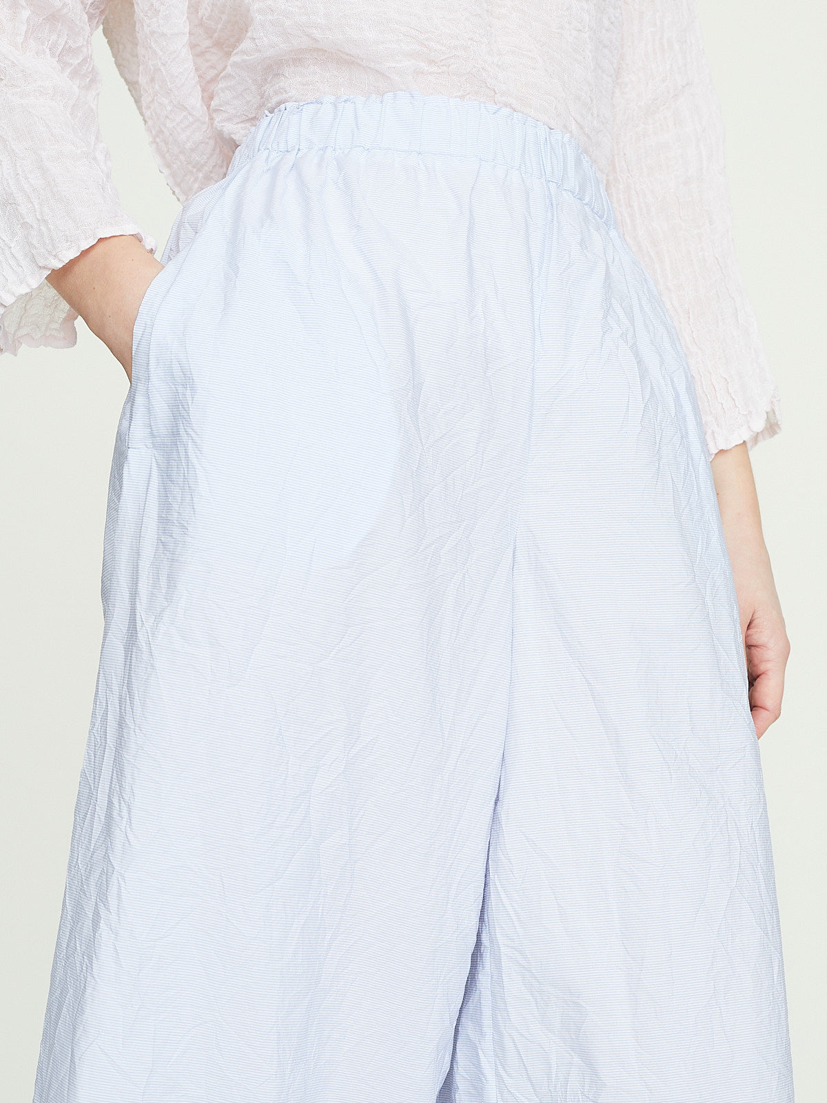 Culotte-style trouser in washed thin-striped cotton. Pull-on style with an elasticated waistband and side seam pockets. Turned-up cuff.