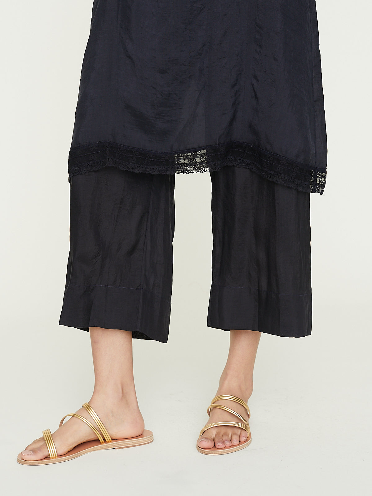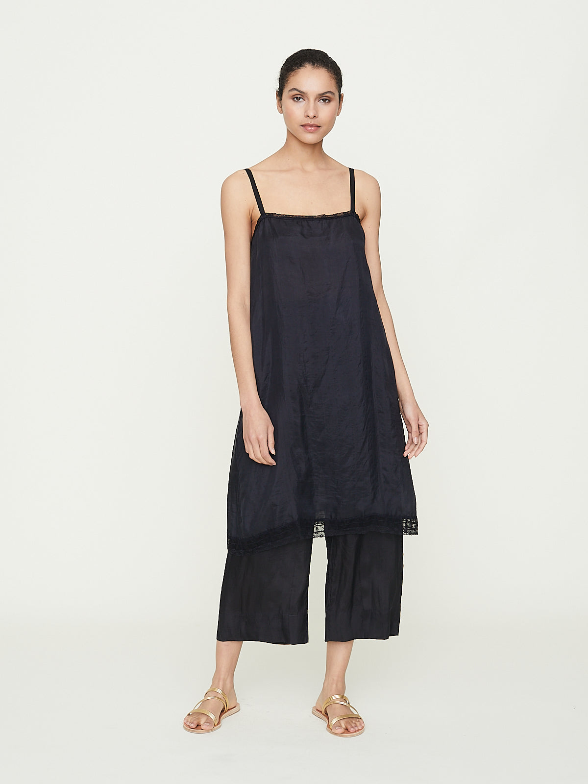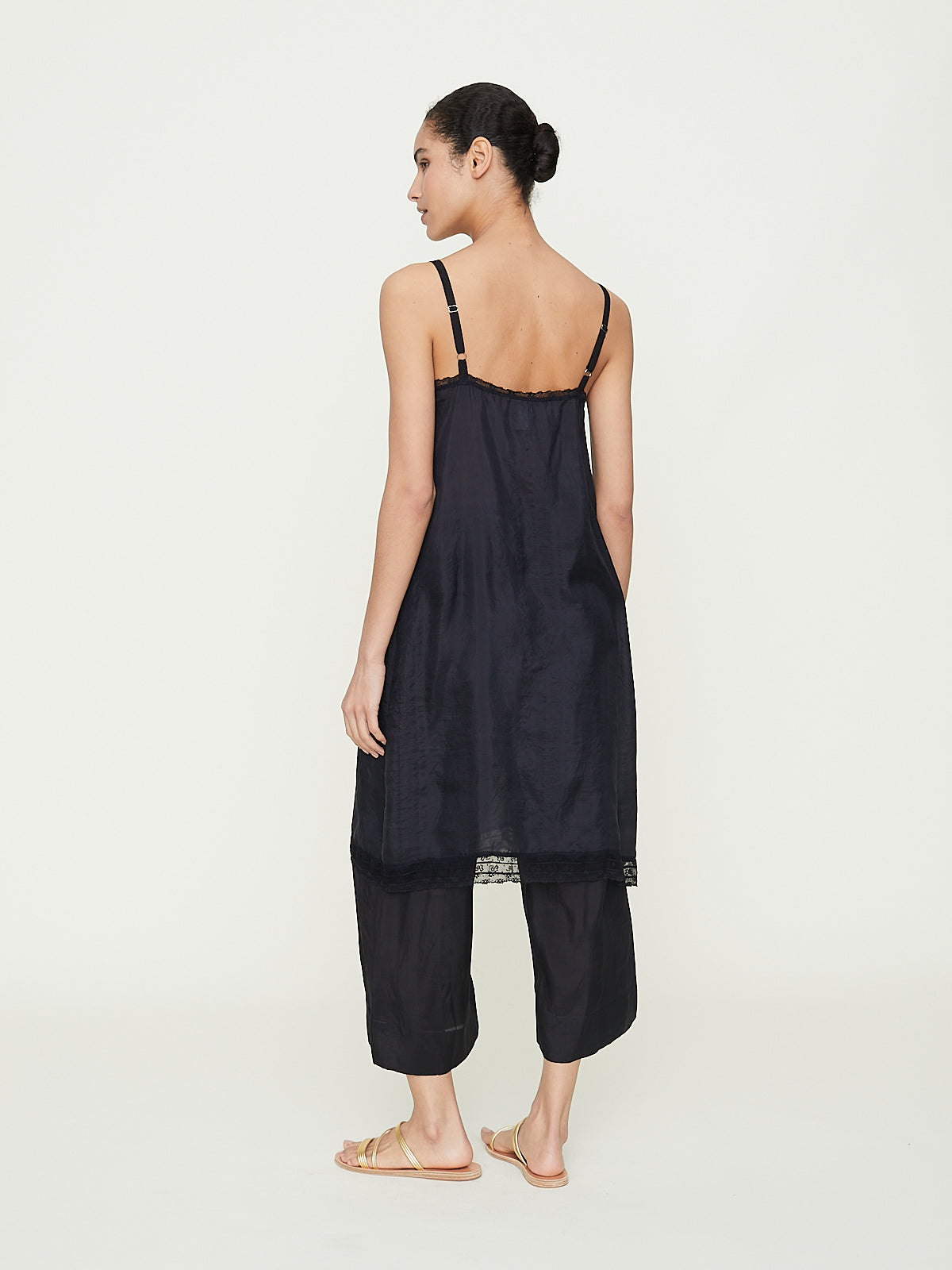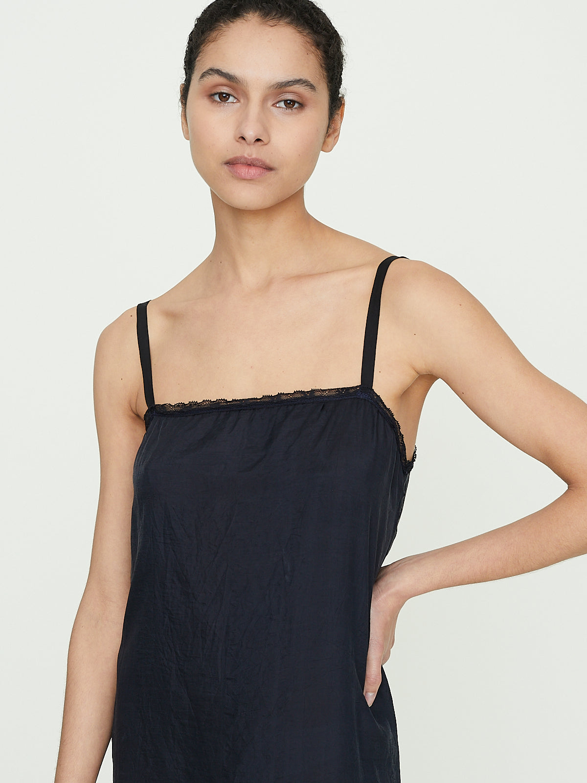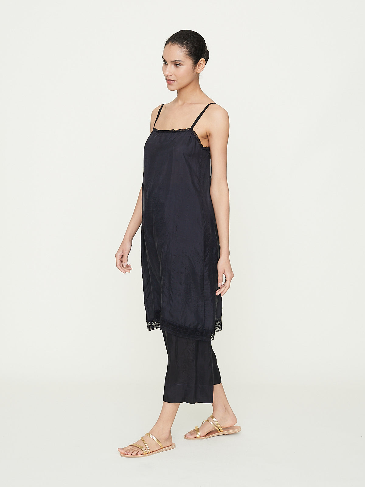 Knee-length slip in washed lightweight midnight khadi silk. Thin adjustable shoulder strap. Features a lace detail at the neckline and bottom hem. Straight cut.