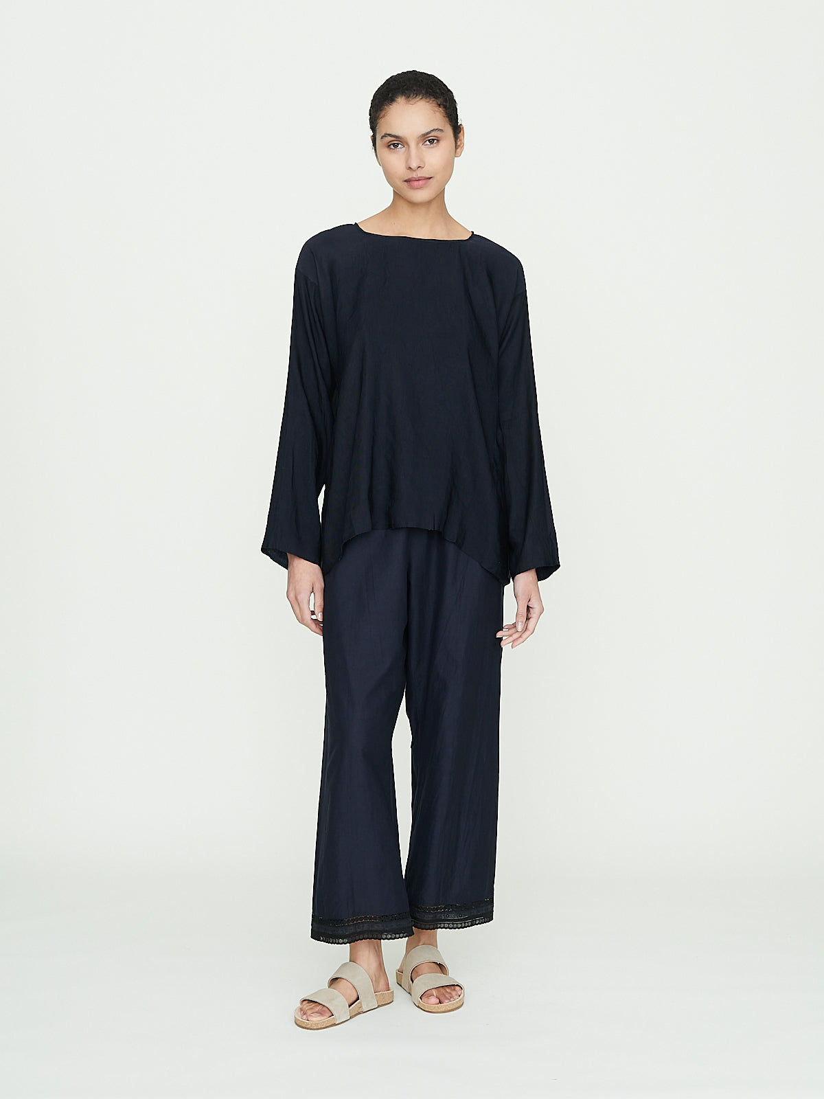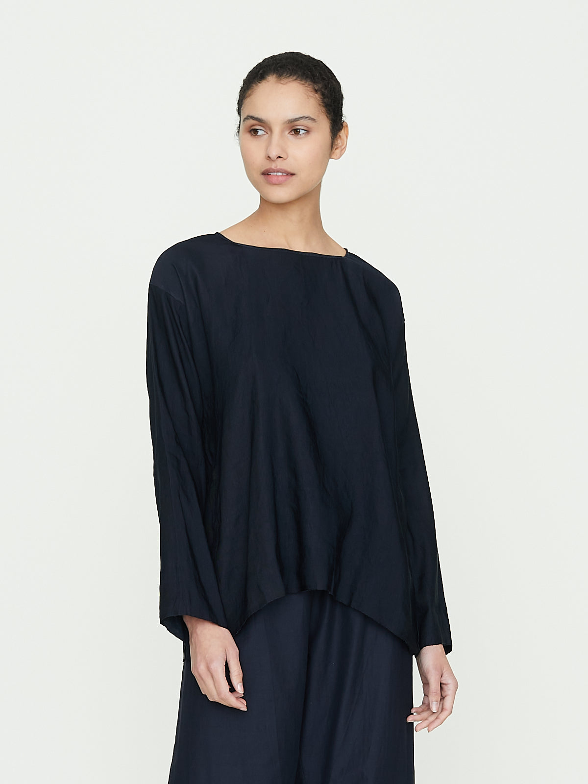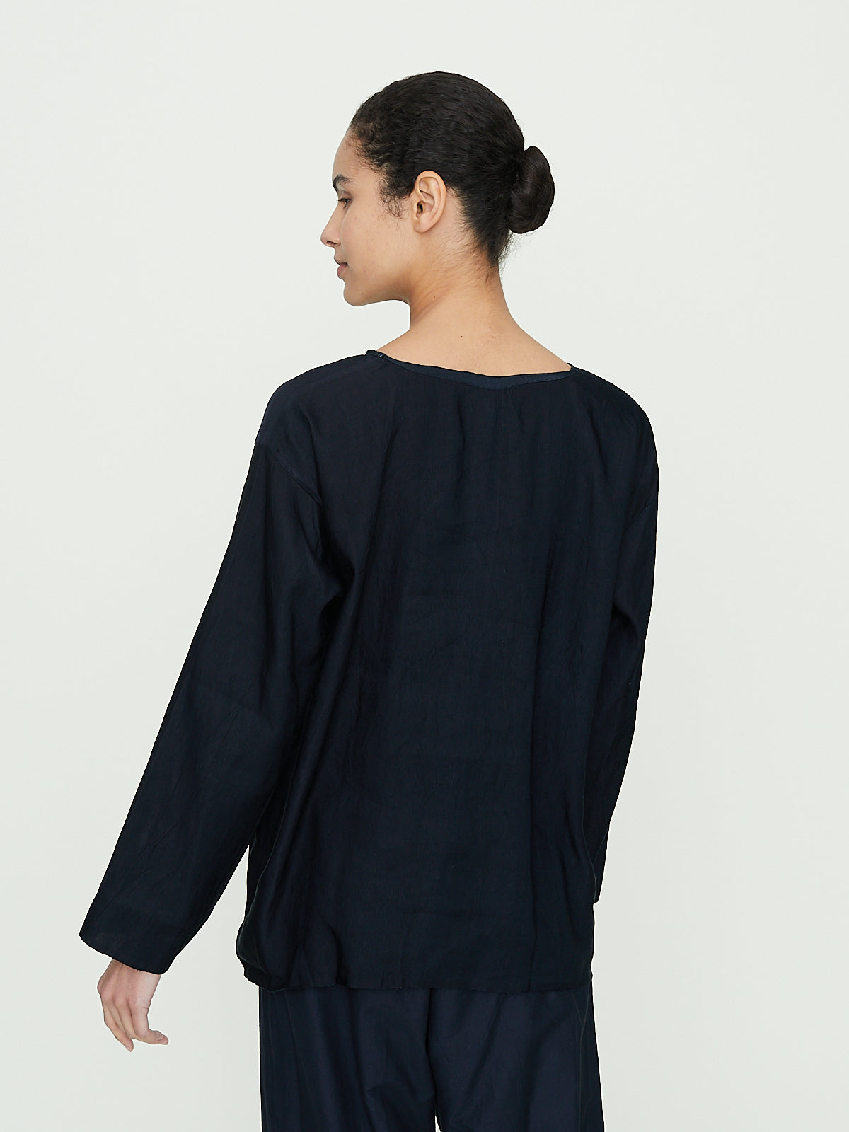 Relaxed top in washed midnight silk and linen blend. Round neckline, long sleeves and side seam pockets. Features hand-stitching details throughout. Boxy fit.