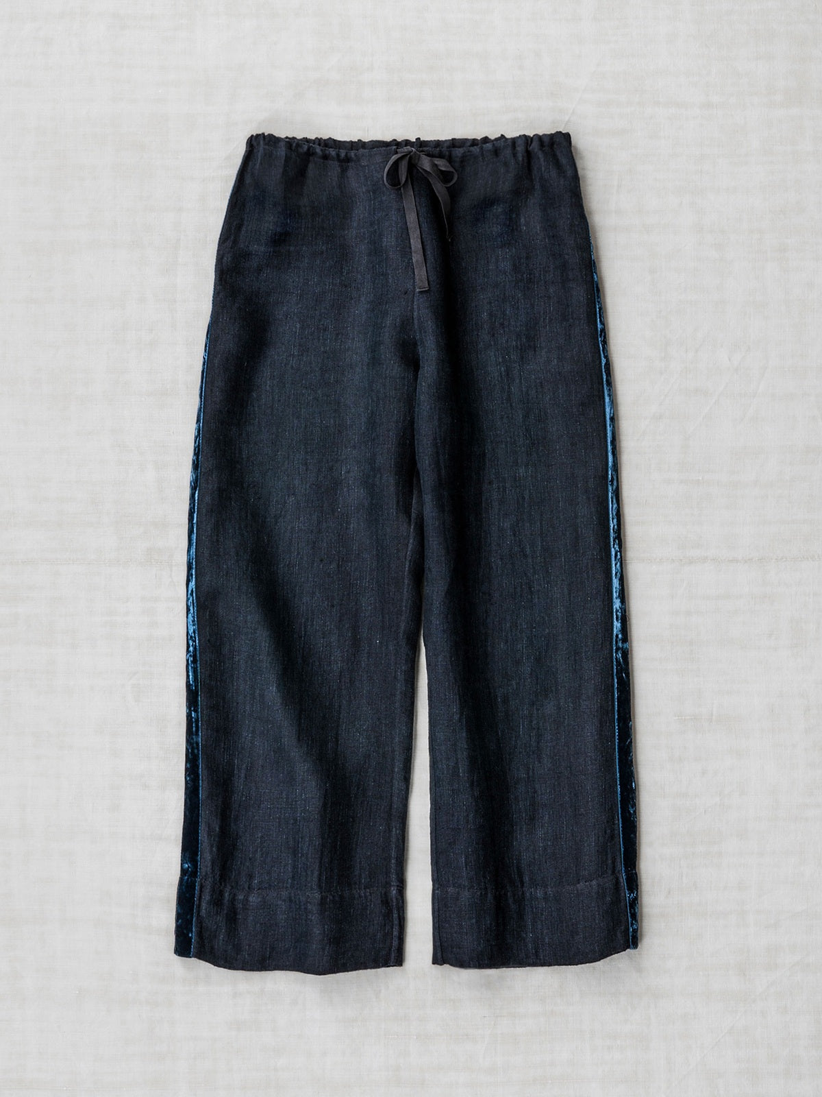 Cropped wide pant in a midnight blue linen cloth, inspired by Japanese mosquito nets. Pull-on style with an adjustable drawstring and wide cuffs. Features a blue velvet ribbon on the sides.