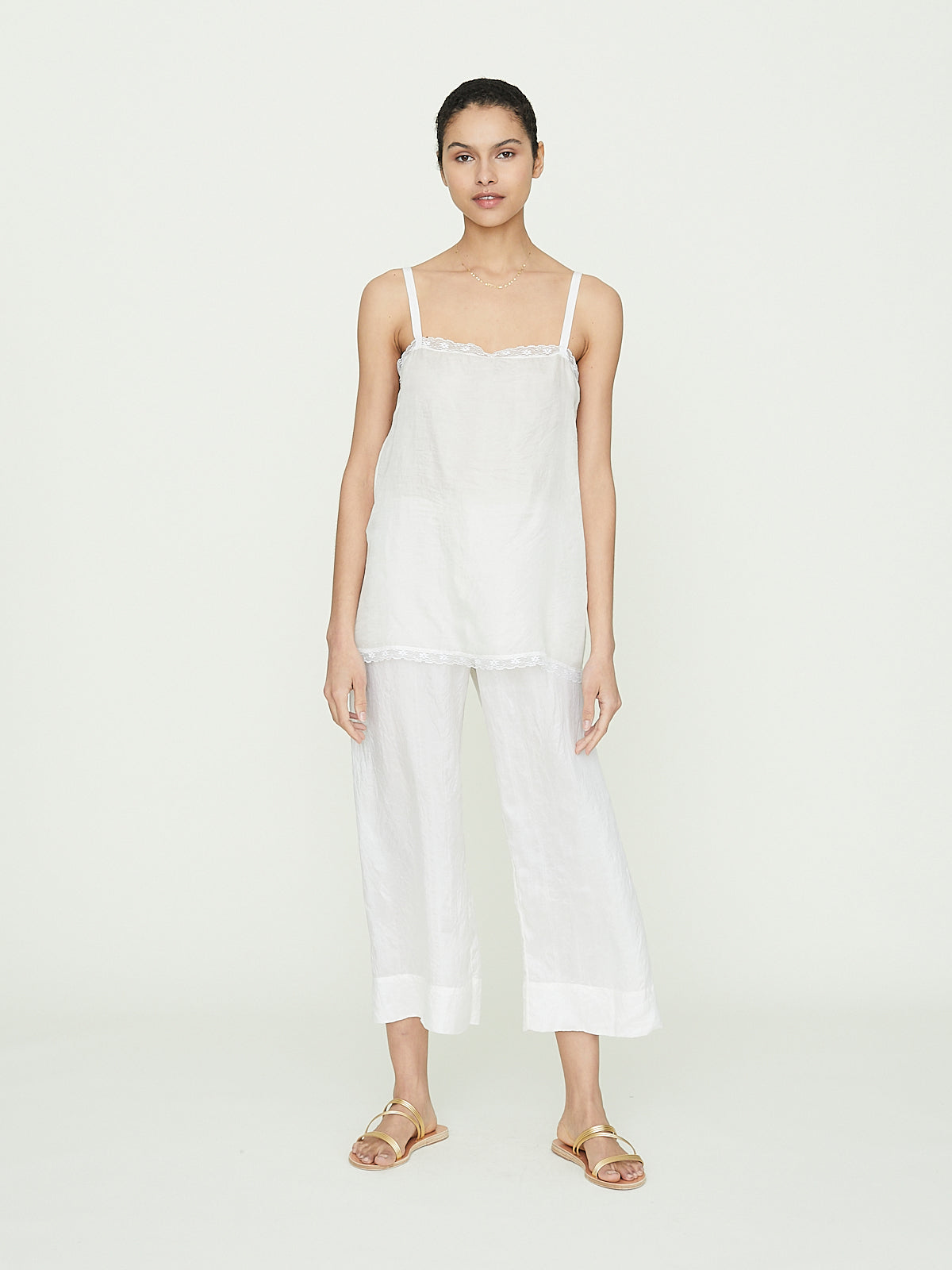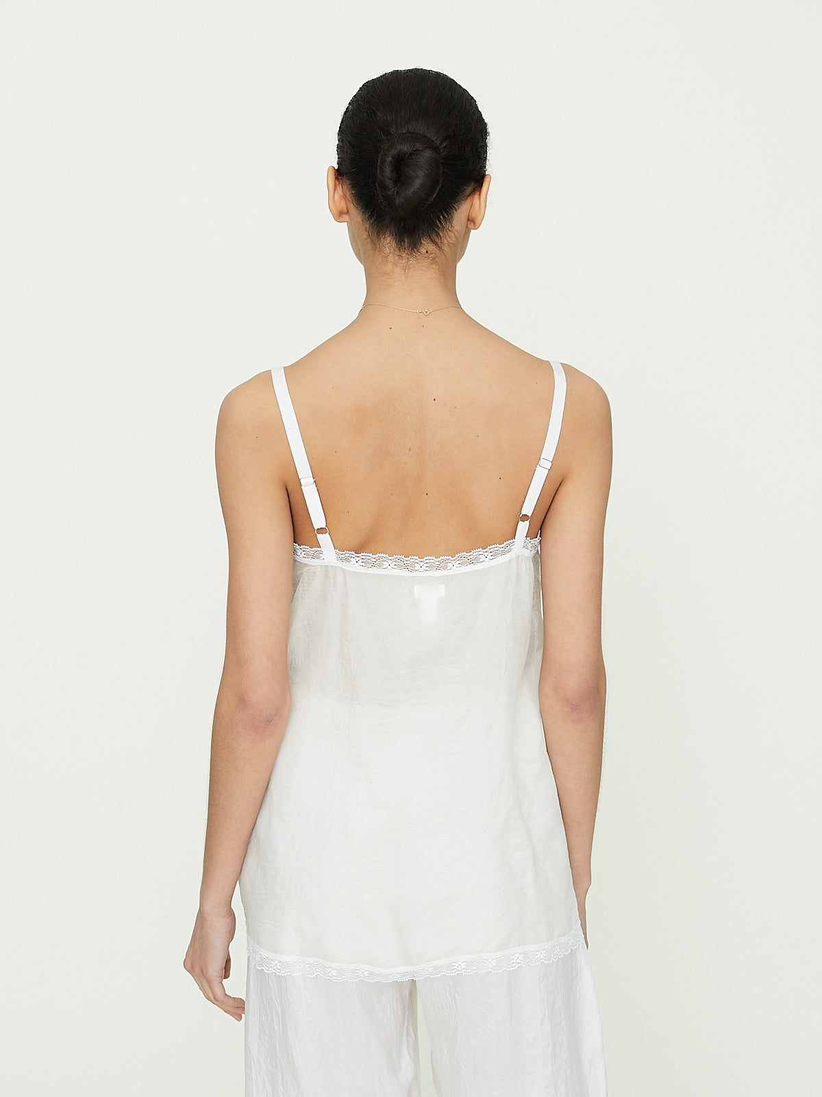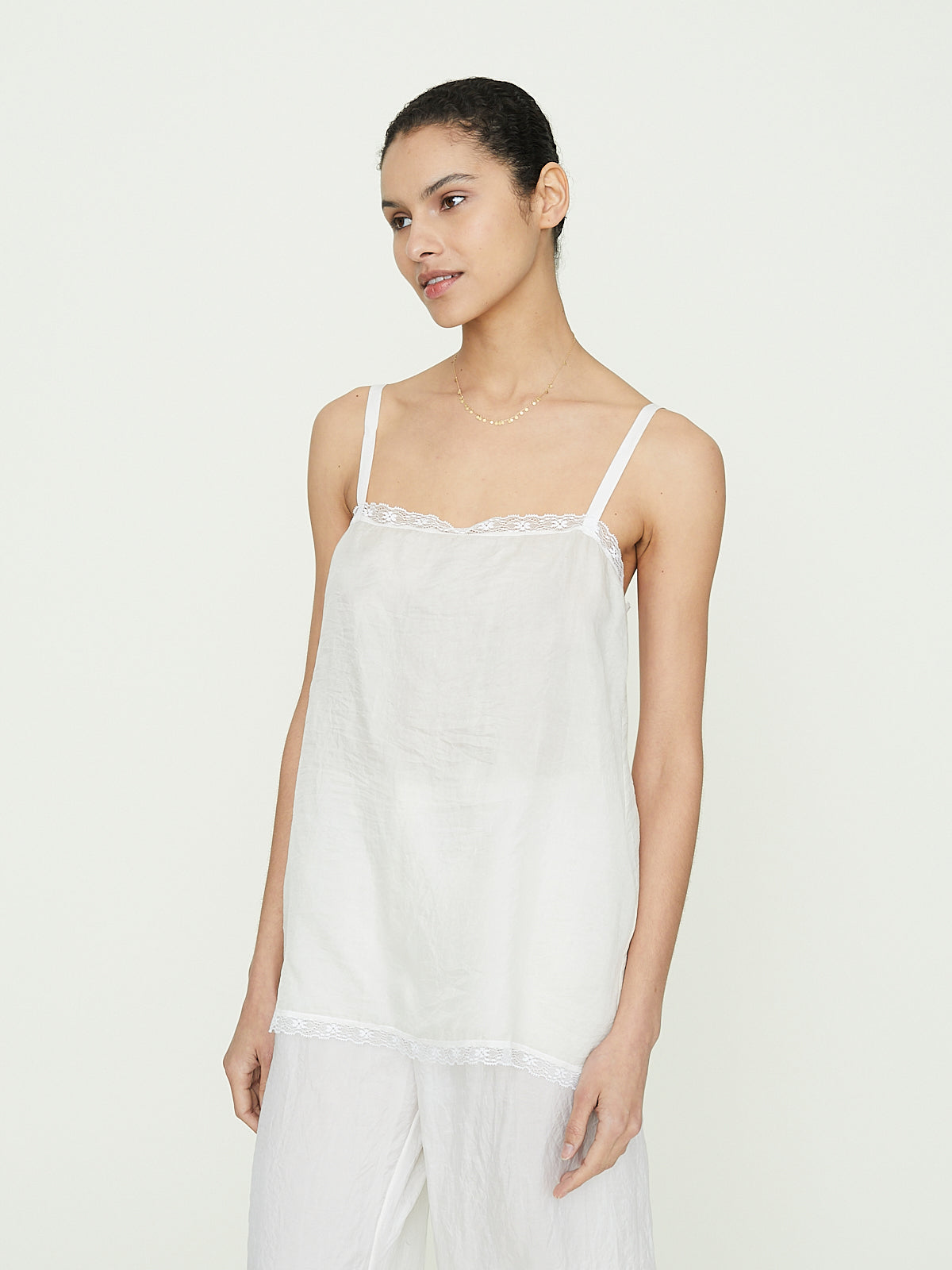 Tank top in lightweight white khadi silk. Square neckline and thin adjustable shoulder straps. Features a lace trim at the bust and bottom hem. Straight cut and relaxed fit.