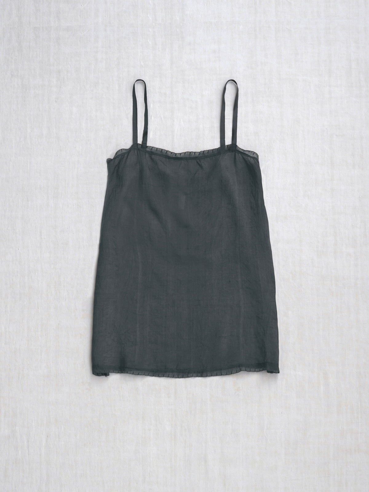 Tank top in lightweight washed charcoal brown khadi silk. Square neckline and thin adjustable shoulder straps. Features a lace trim at the bust and bottom hem. Straight cut and relaxed fit.