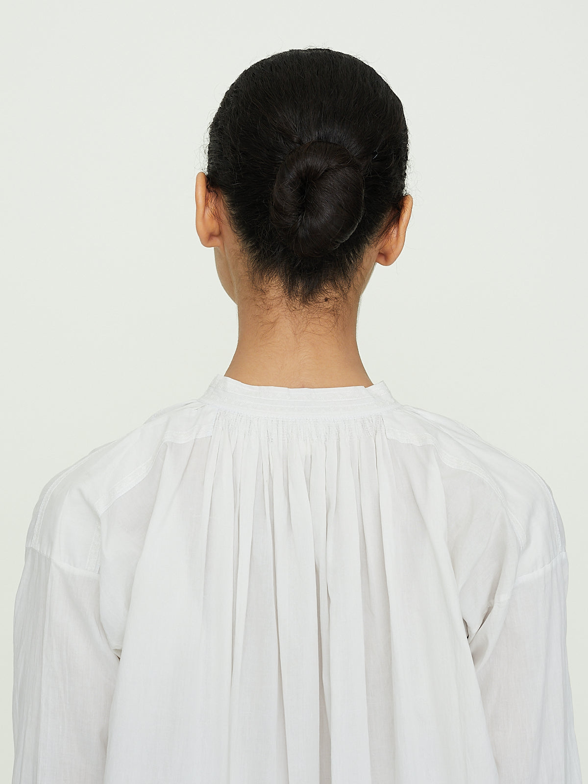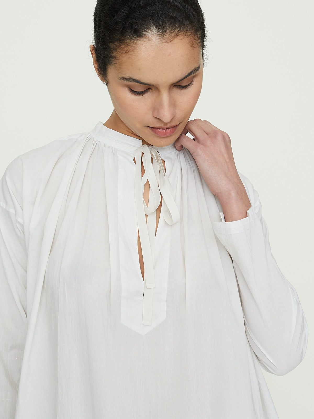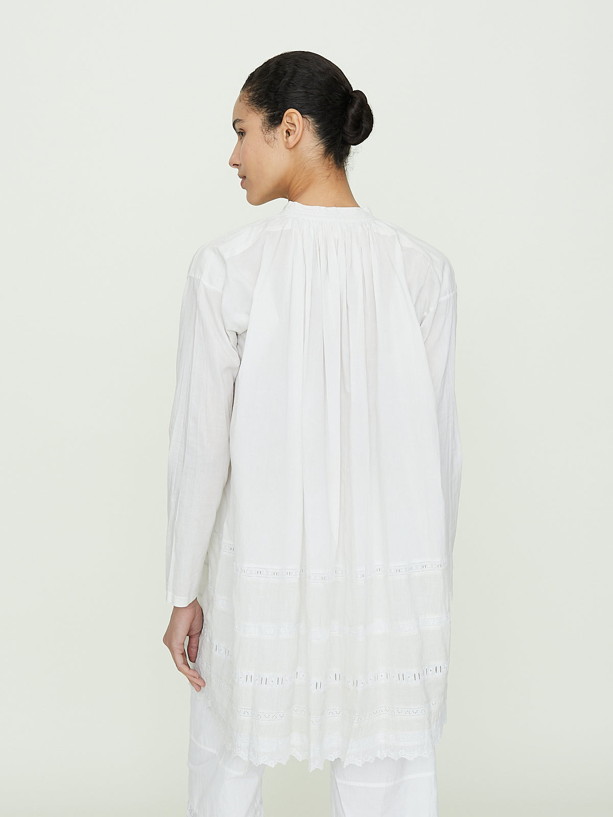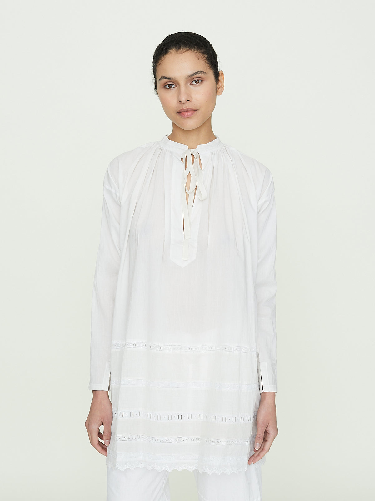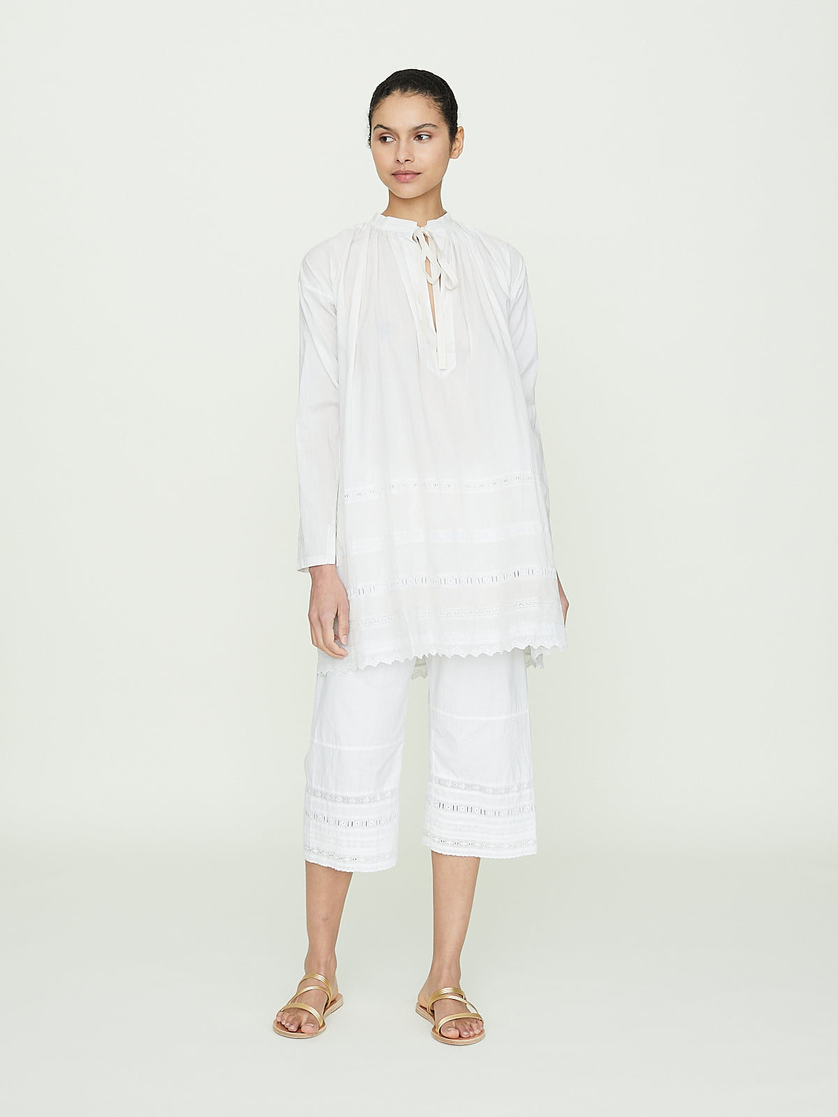 Relaxed tunic in washed lightweight white cotton. Blouson-style, stand collar with a slit neckline and a ribbon tie fastening at the neck. 3/4 sleeves with a dropped shoulder and a gathering detail at the back of the neck. Features vintage lace details throughout and a scalloped trim at the bottom hem.