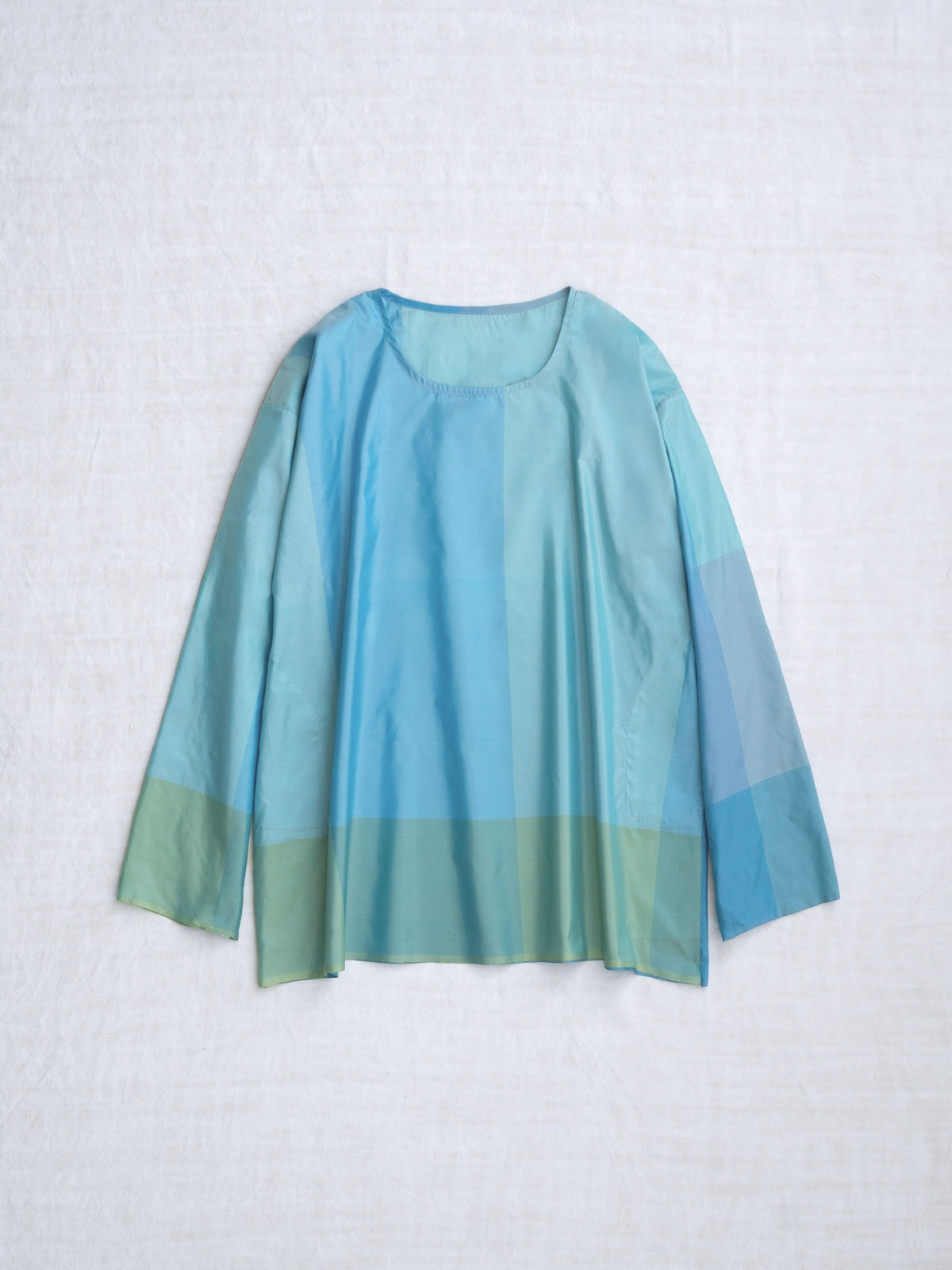 Relaxed top in iridescent habutai silk with a woven check design in various shades of blue inspired by the sea. Round neckline, long sleeves and side seam pockets. Boxy fit.