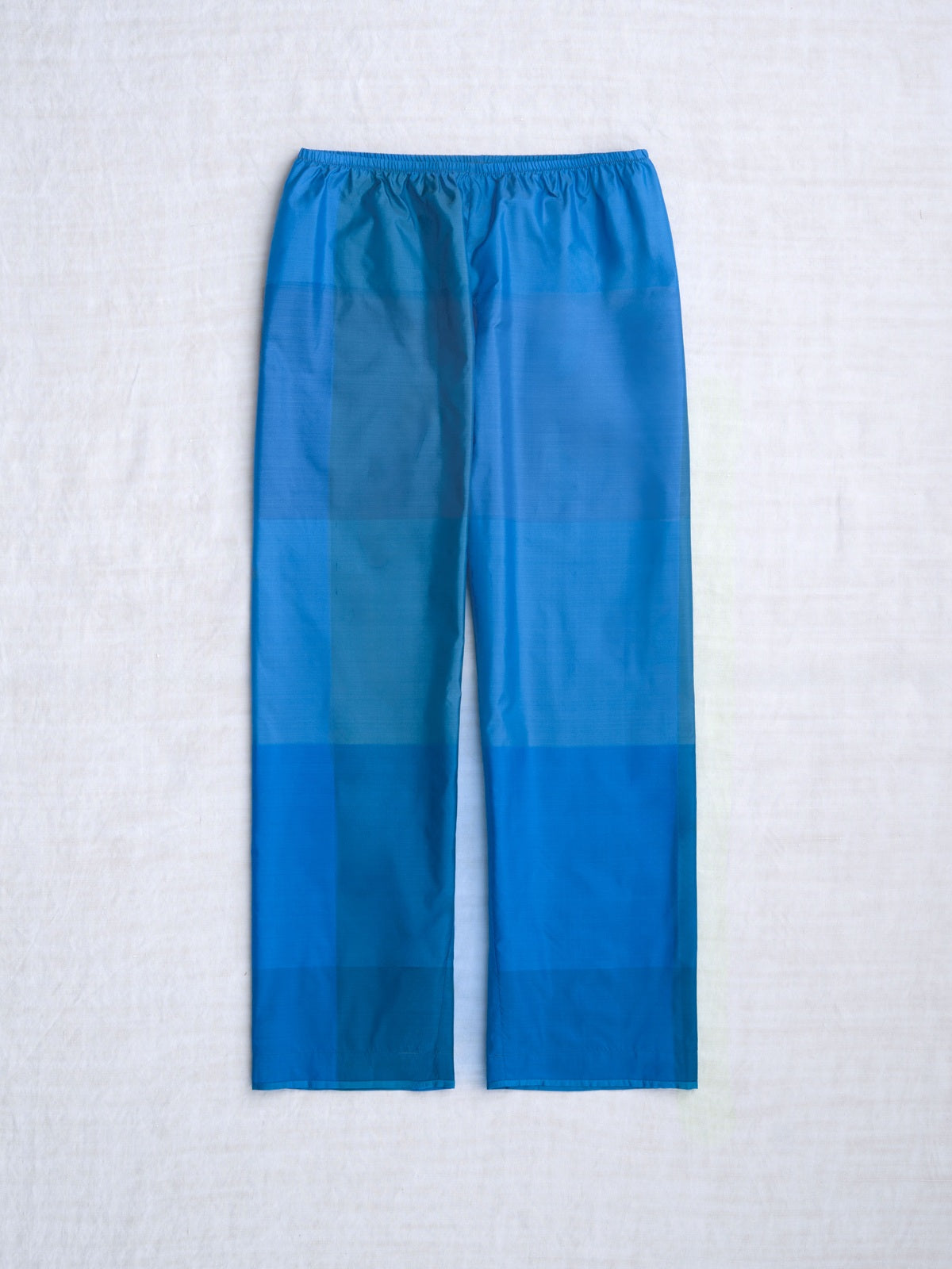 Cropped pyjama pant in iridescent habutai silk with a woven check design in various shades of blue inspired by the sky. Pull-on style with an elasticated waistband. Straight leg.