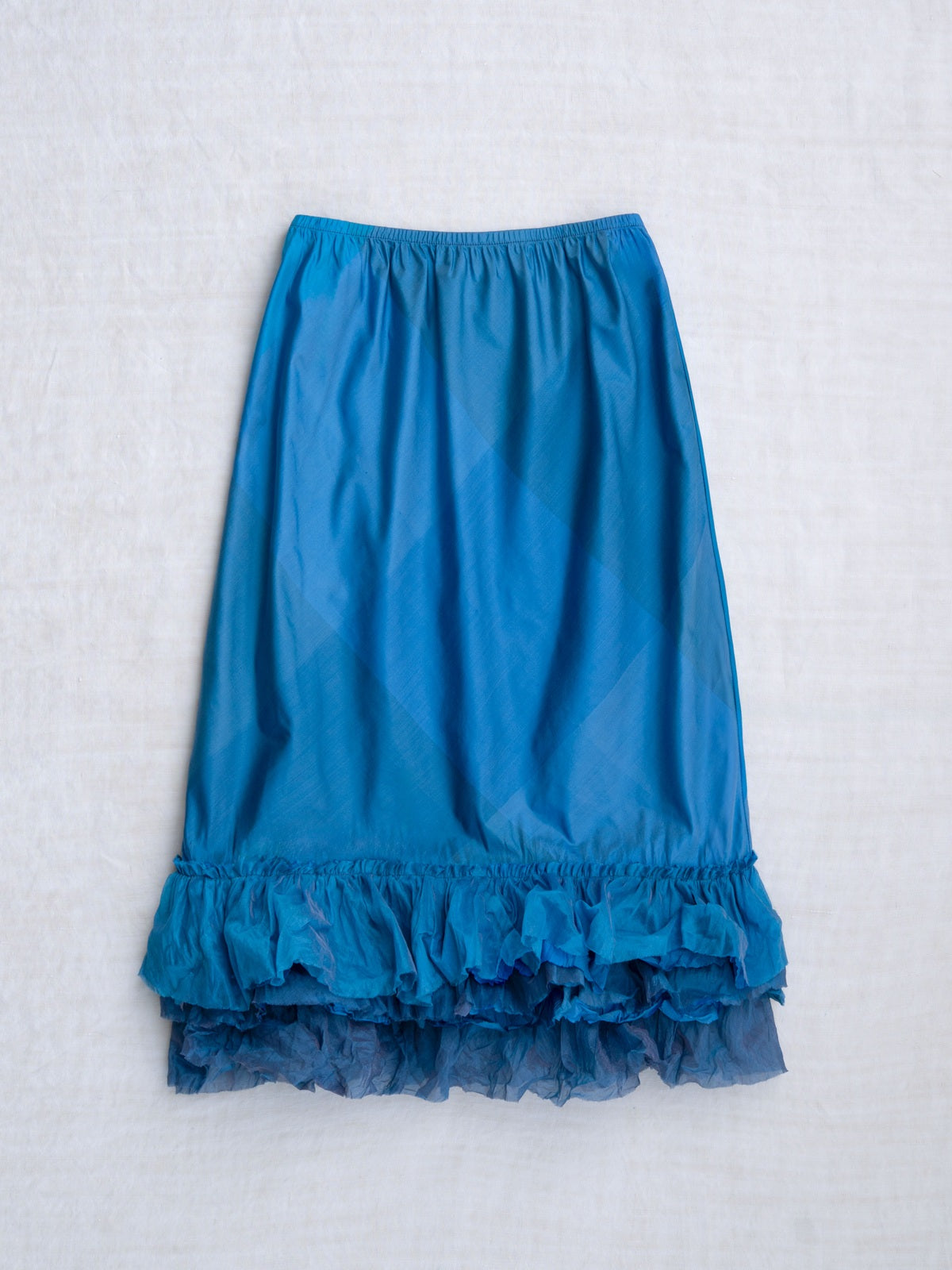 Straight skirt in iridescent habutai silk with a woven check design in various shades of blue inspired by the sky. Pull-on style with an elasticated waistband and a layered ruffle detail at the bottom hem. Cuts below-the-knee.