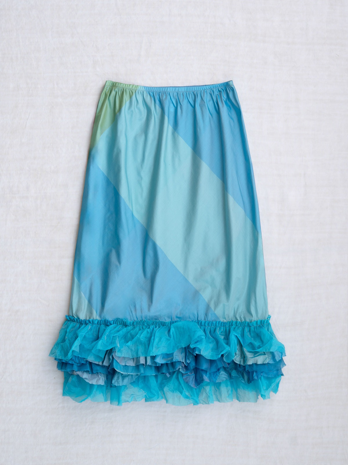 Straight skirt in iridescent habutai silk with a woven check design in various shades of blue inspired by the sea. Pull-on style with an elasticated waistband and a layered ruffle detail at the bottom hem. Cuts below-the-knee.